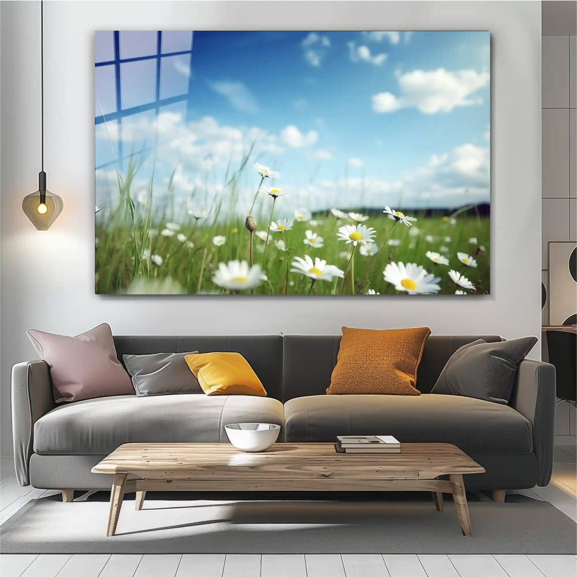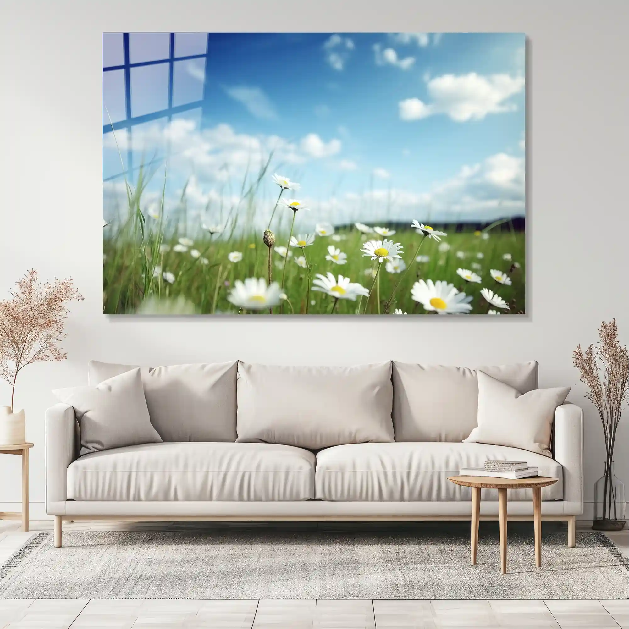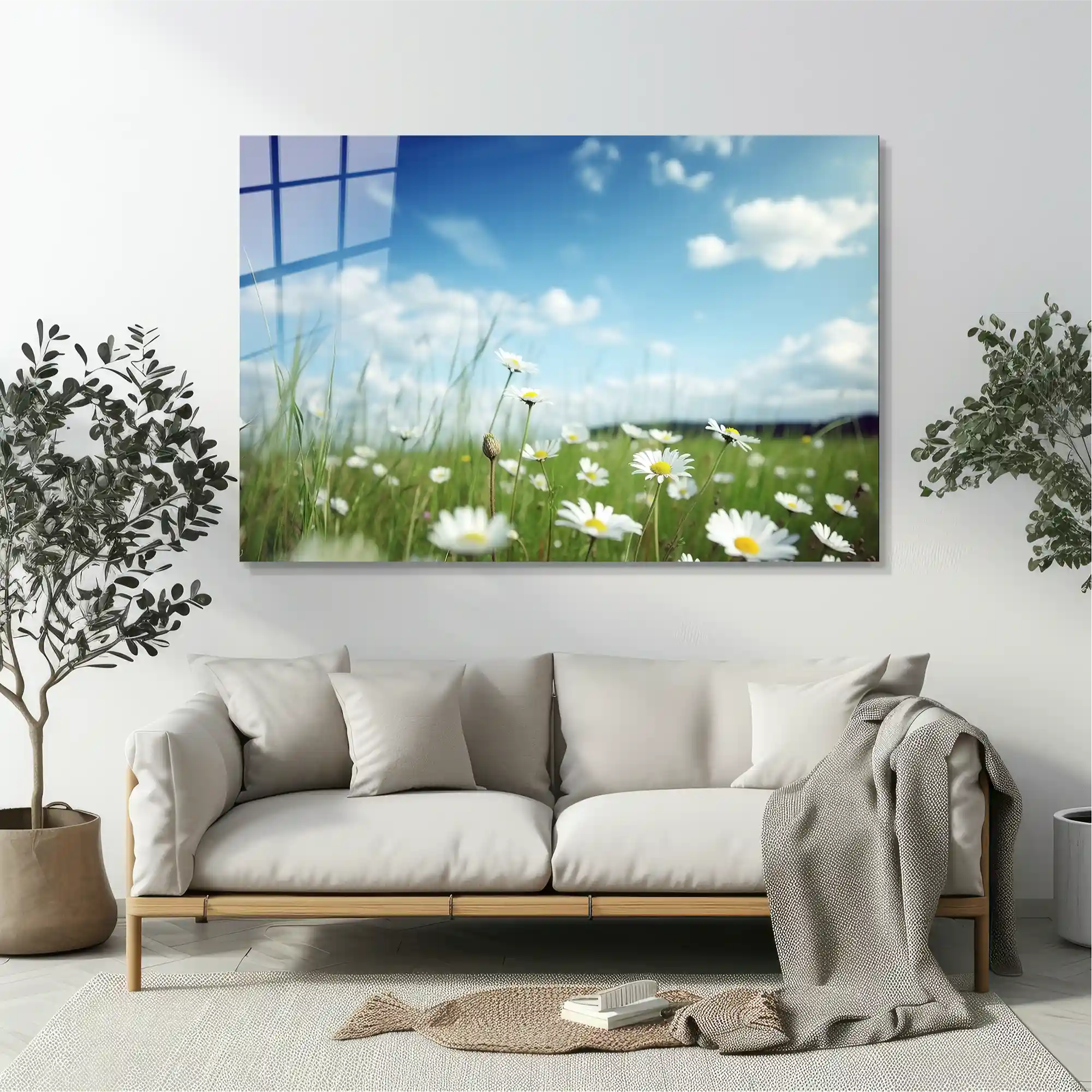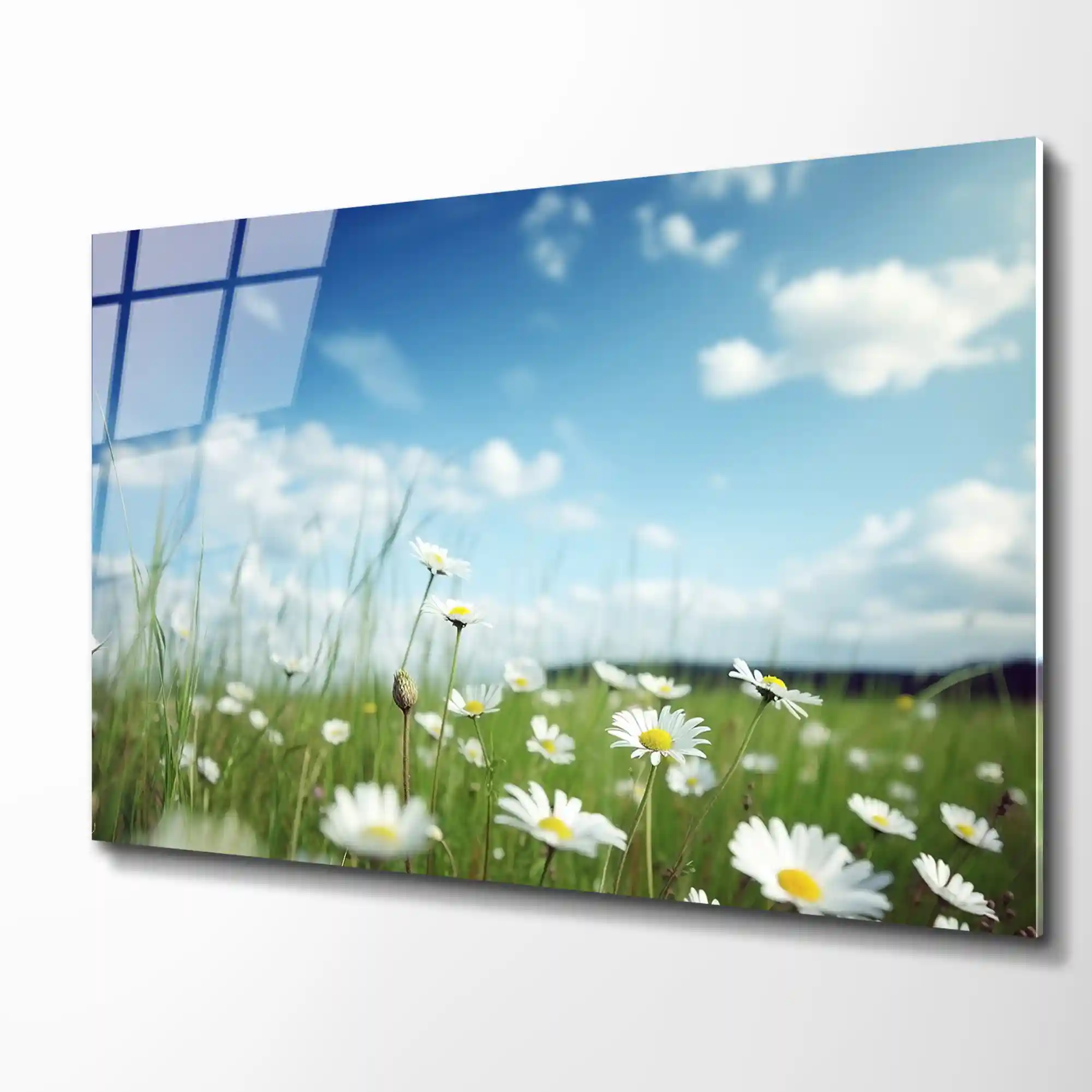 Papatya Çiçekler ve Gökyüzü Cam Tablo