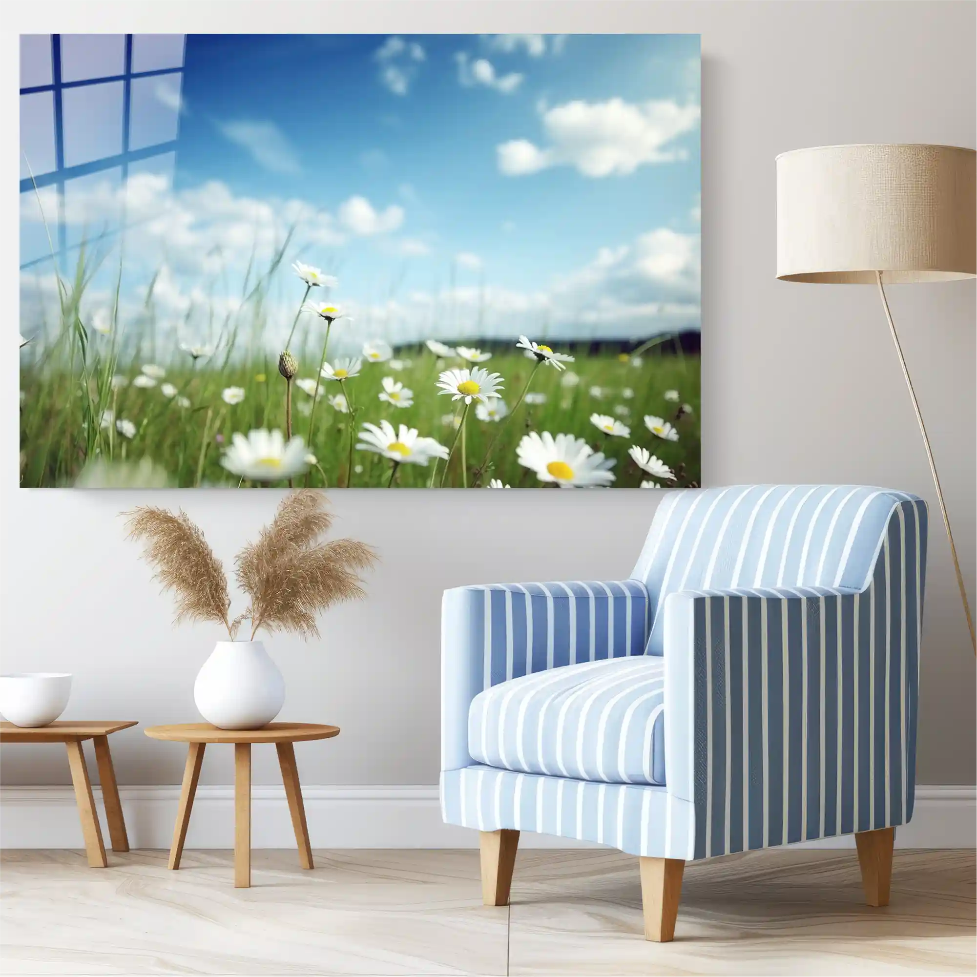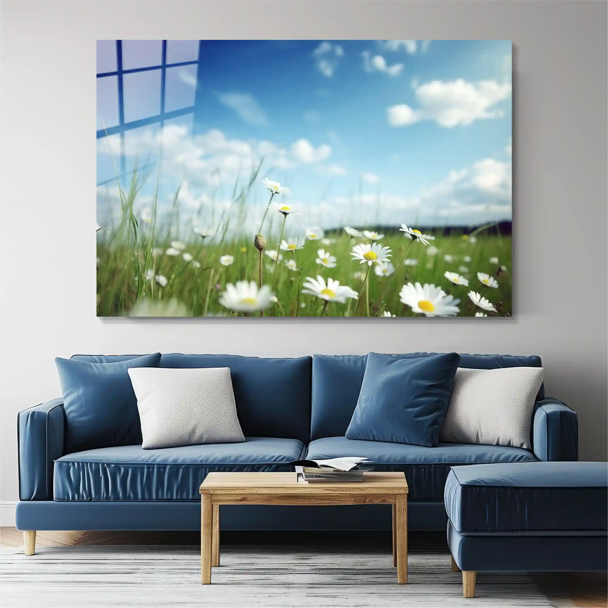 Masumiyetin, saflığın ve özgürlüğün resmi. Bu tablo, en parlak yaz gününün, temiz gökyüzü altındaki bir papatya tarlasında yakalanmış taze anıdır. Güneşin okşadığı narin papatyalar, derin maviyle saf beyazın kontrastında huzuru fısıldıyor. Evinizin duvarında her daim mevsim yaz olsun; bu eser, sabah güneşinin camdaki yansımasıyla yaşam alanınıza anında bir ferahlık ve dinginlik katacaktır. Doğanın zarafetini ve tazeliğini odanıza davet edin.