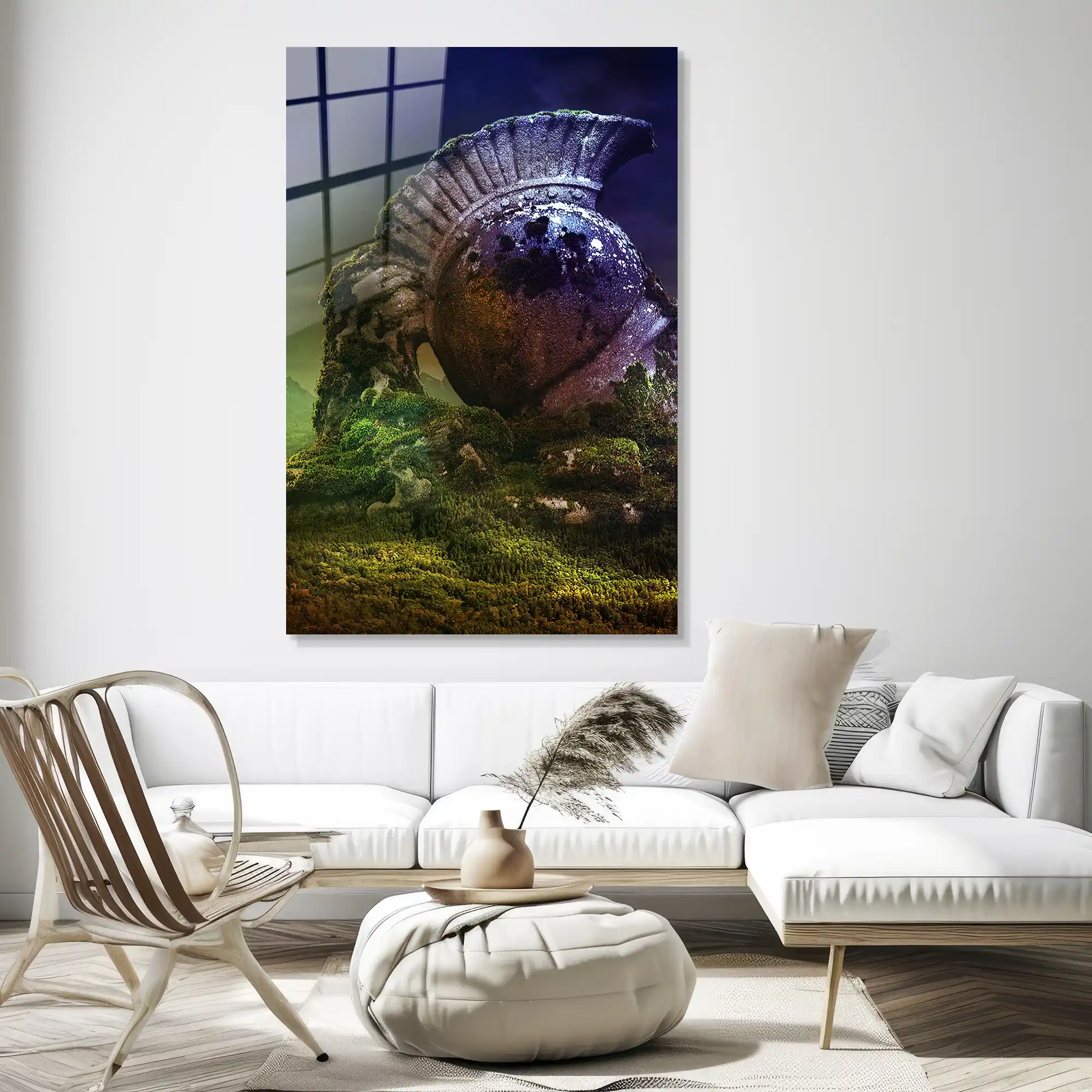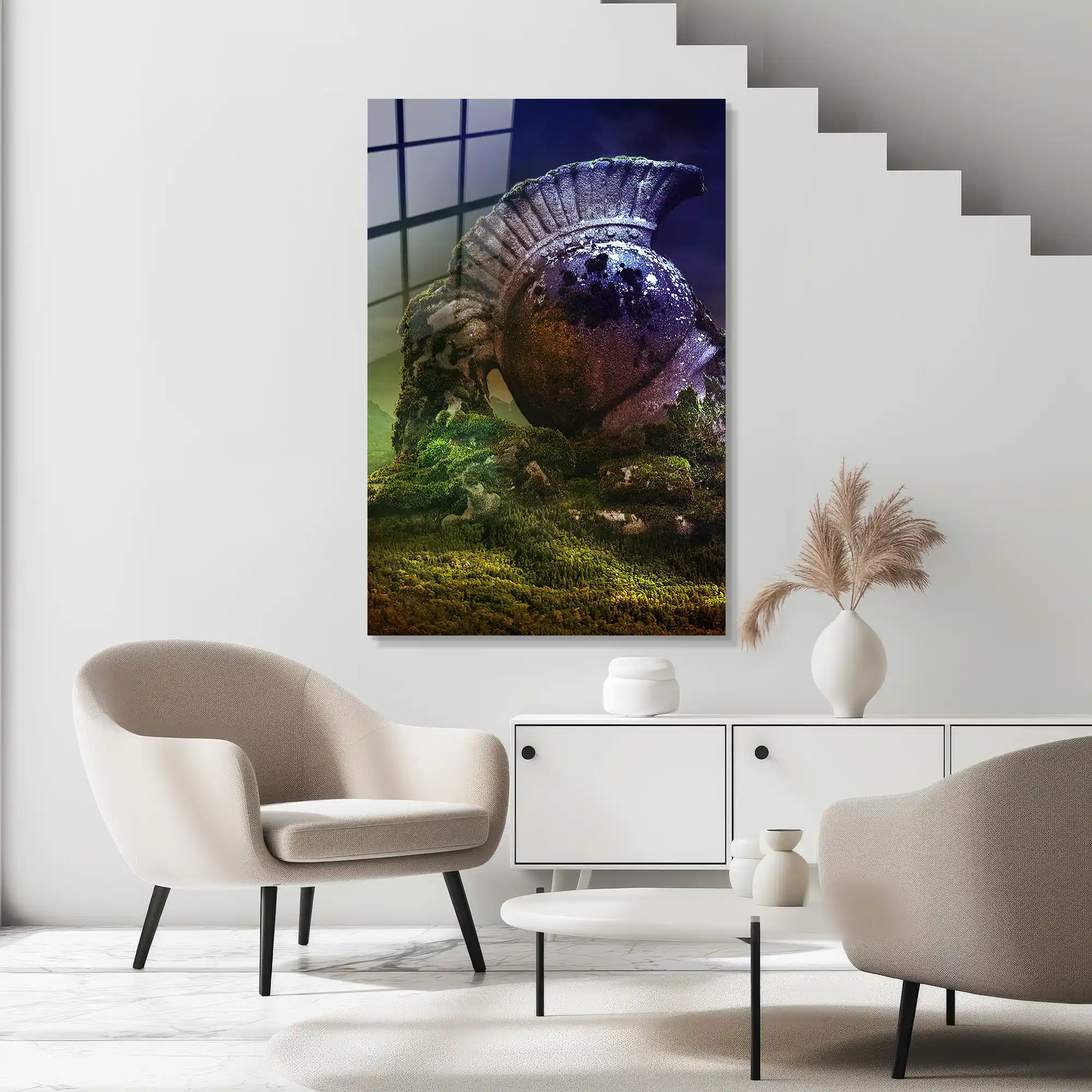Antik Miğfer ve Doğa Temalı Dekoratif Cam Tablo