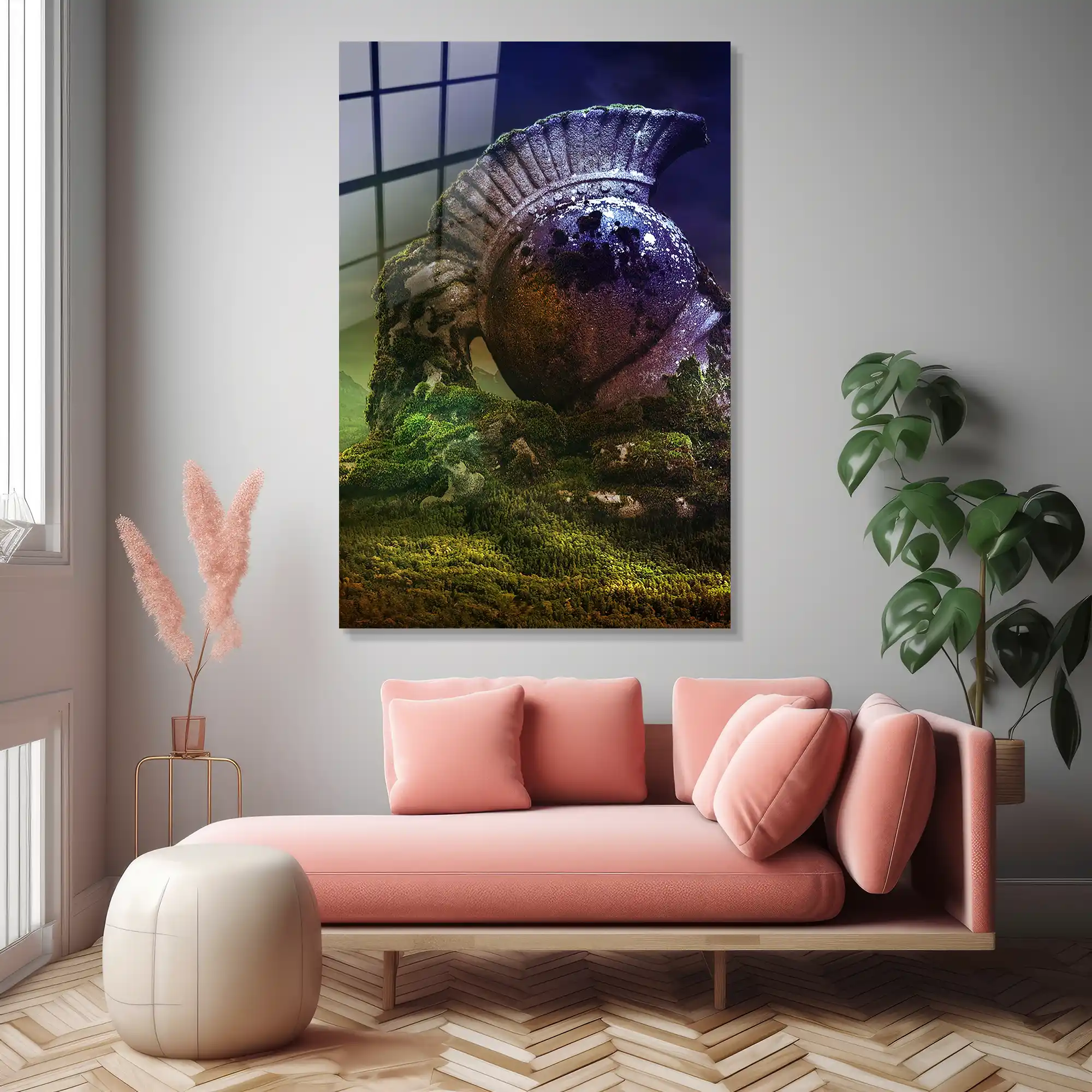 Yüzyıllar süren uykusundan uyanan bir efsane… Bu özel eser, antik bir savaşçının miğferini, doğanın yosunlu dokusu ve sisli dağ manzarasıyla birleştirerek tarihin tozlu sayfalarını modern bir sanat formuna dönüştürüyor. Miğferin üzerindeki metalik yansımalar ile yeşilin en canlı tonları arasındaki bu uyum, sadece bir dekorasyon öğesi değil; direncin, zamanın geçiciliğinin ve doğanın yenilmez gücüne adanmış epik bir hikayedir. Fantastik bir dünyanın kapılarını aralayan bu illüstrasyon, yaşam alanınıza hem gizemli hem de son derece sofistike bir atmosfer katar. Camın kristal parlaklığı, miğferin devasa detaylarını her açıdan canlandırarak evinize mitolojik bir ruh taşır.