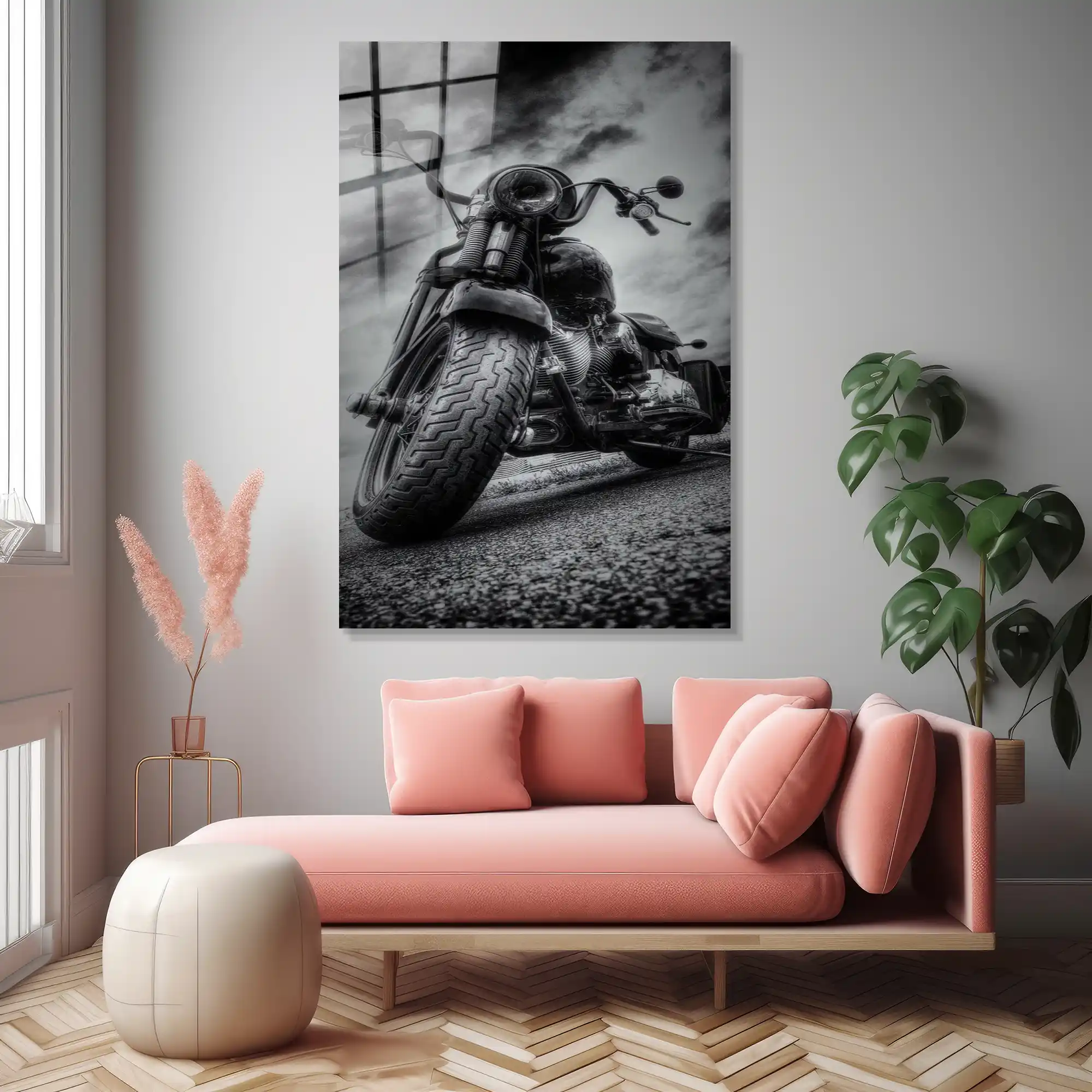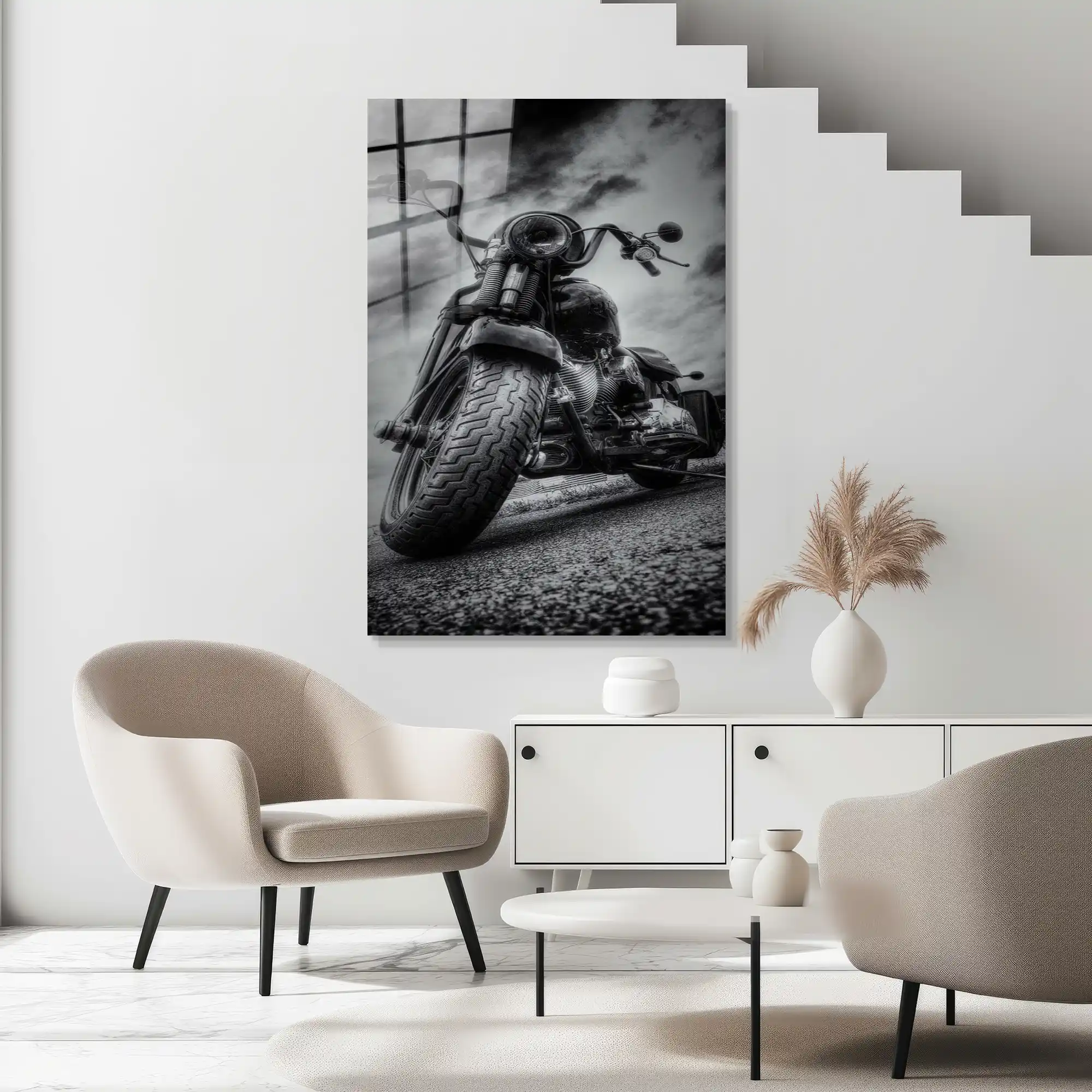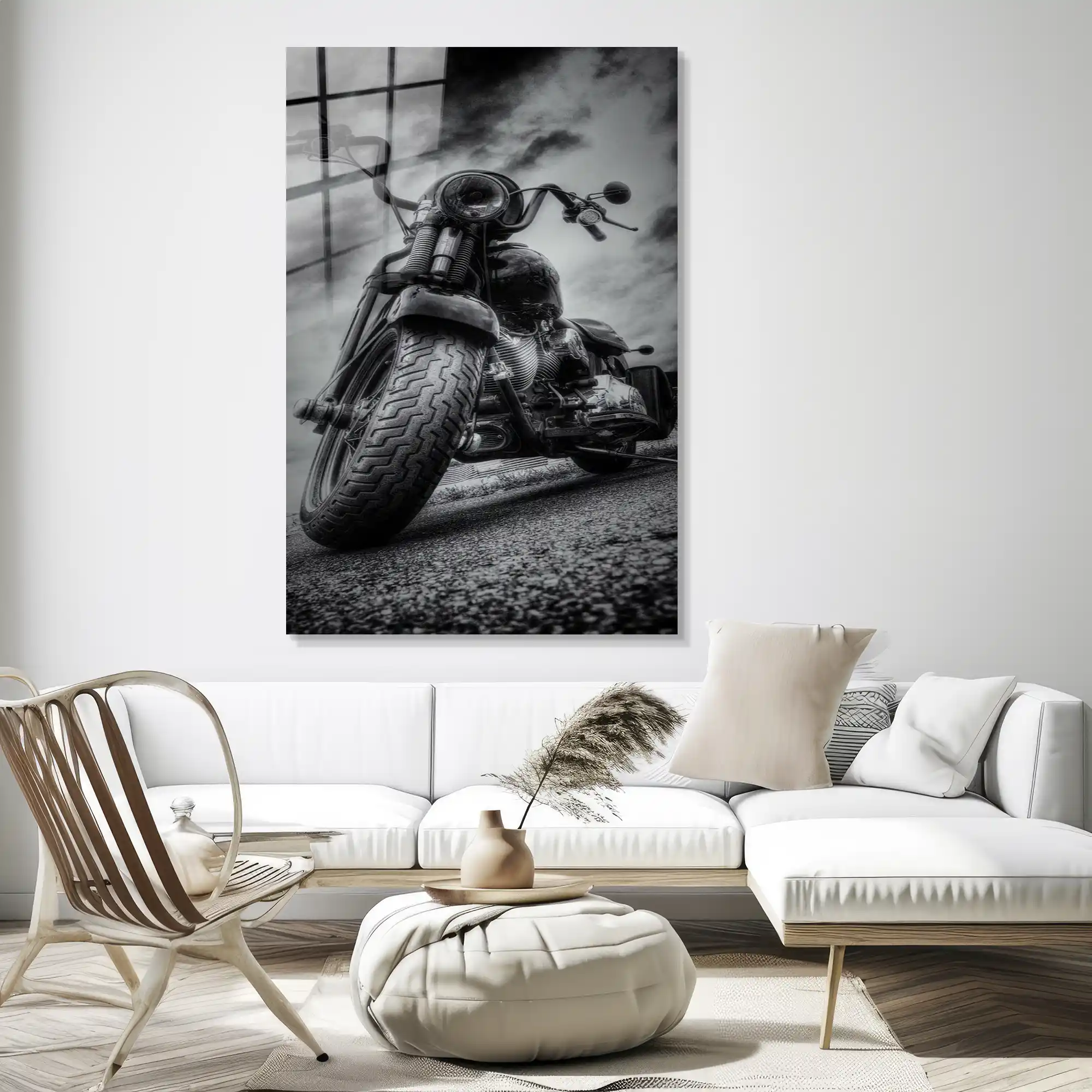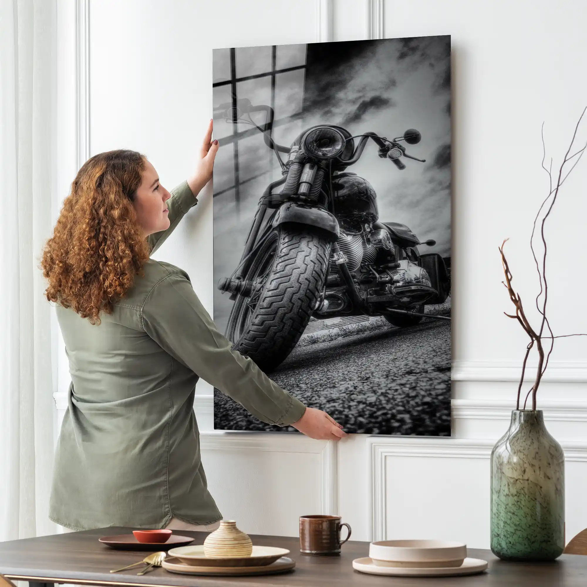 Motosikletin kalın ön lastiği, yüksek gidonu ve krom detaylı motor bloğu, karanlık ve dramatik bir gökyüzü altında, izleyiciyi doğrudan bir yol macerasına davet ediyor. Siyah beyaz kontrastın keskinliği, metalin parlaklığını ve lastiğin sert dokusunu öne çıkarırken, bulutların yarattığı gölgeler sahneye derinlik katıyor. Bu eser, sadece bir motor tablosu değil; sınırsız özgürlüğe, custom motor kültürünün bağımsızlığına ve yolların cesur ruhuna adanmış, çarpıcı ve modern bir saygı duruşudur. Camın parlak yüzeyi, bu sanatsal kontrastı ve makinenin detaylarını evinize taşıyarak dinamik ve güçlü bir atmosfer yaratır.