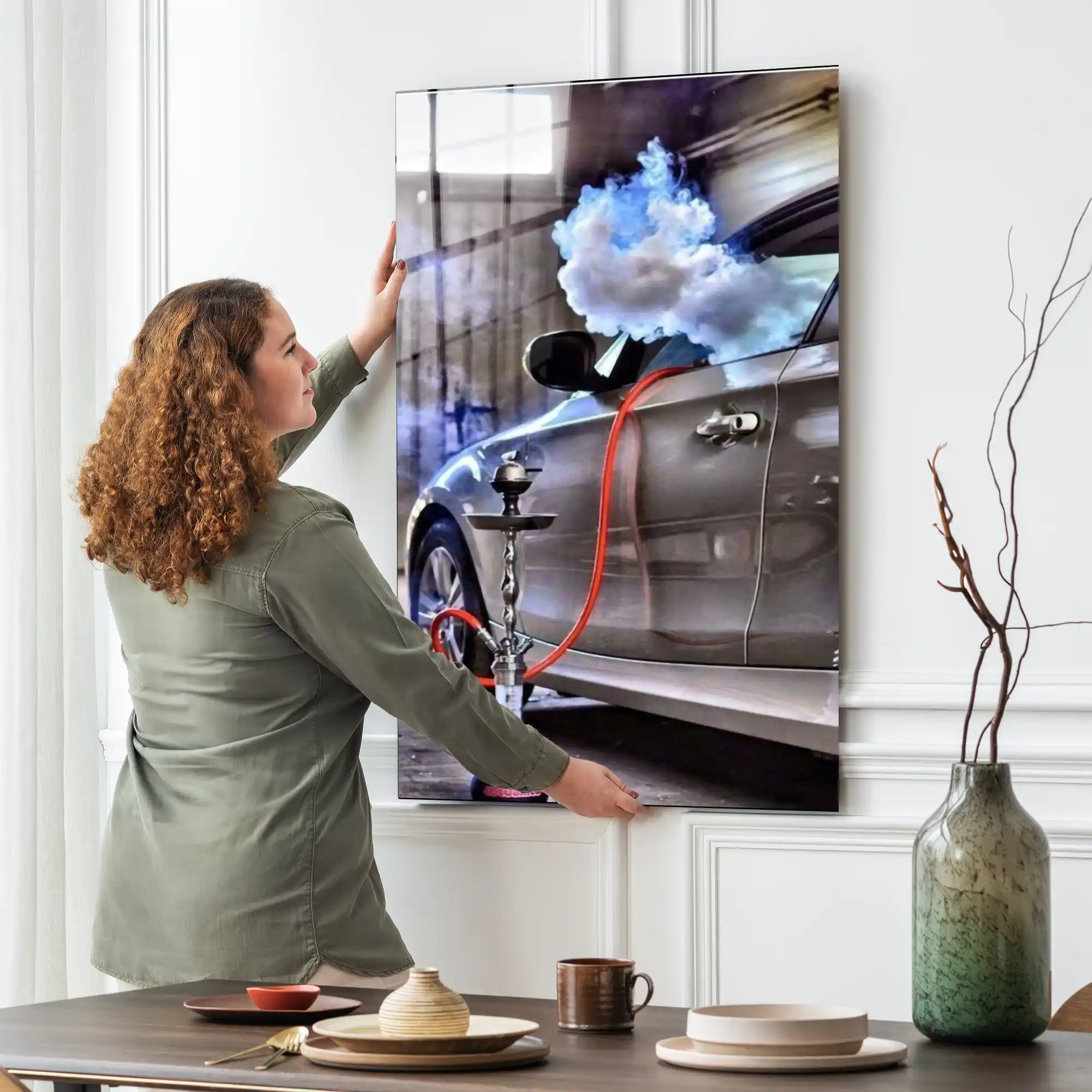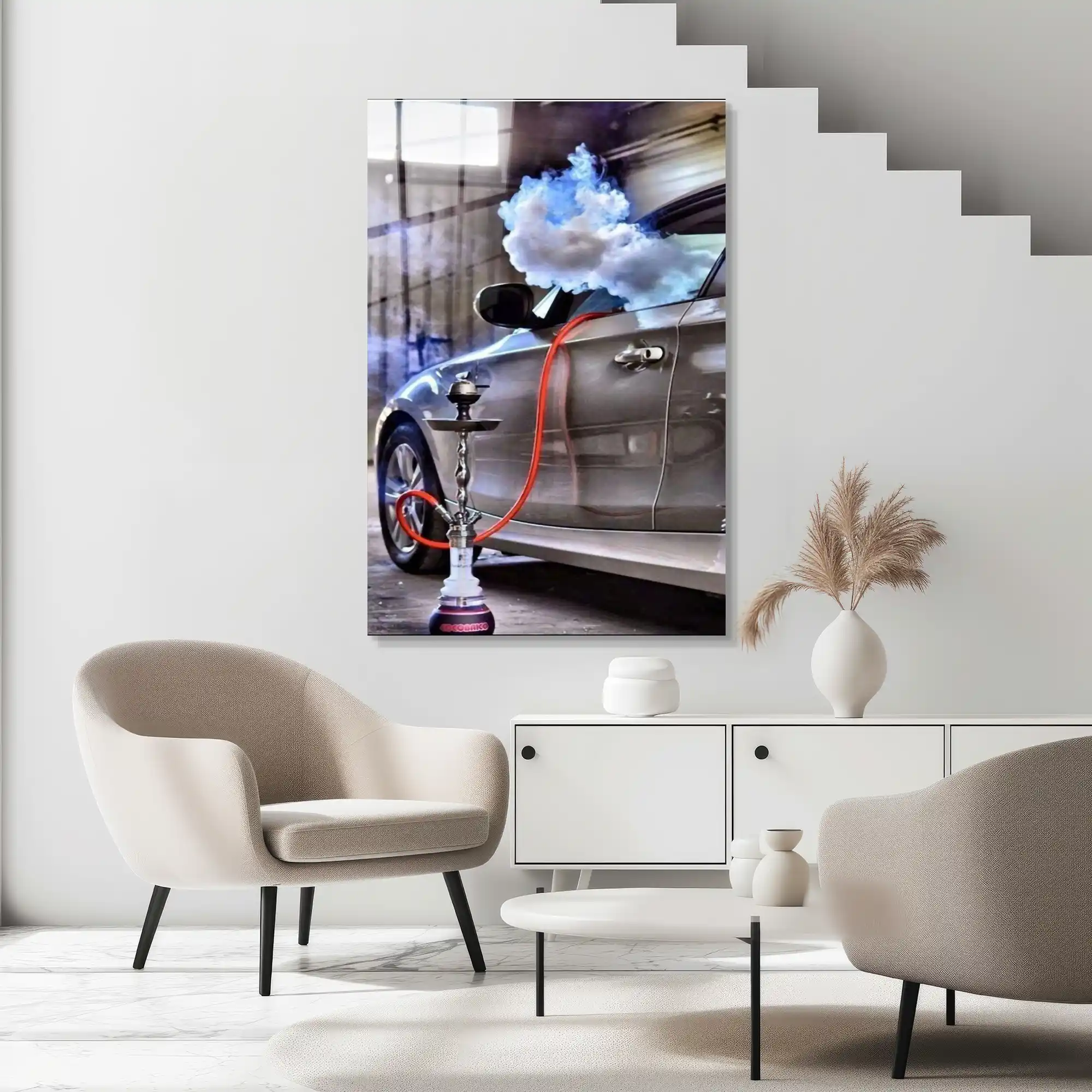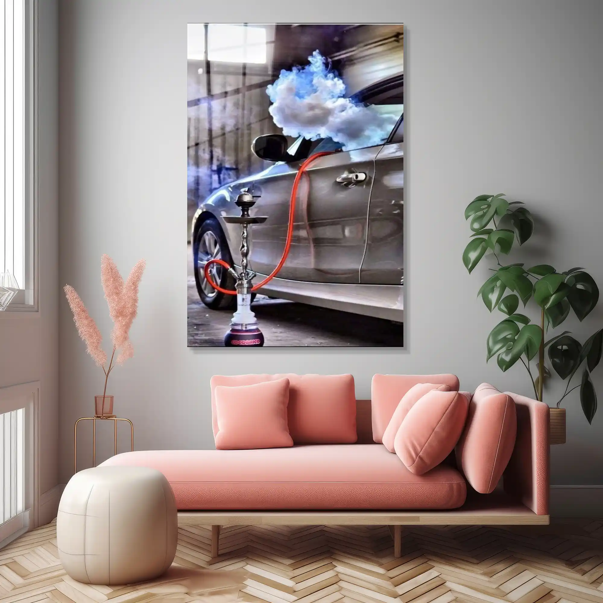 Otomobil tutkusu, sadece hız ibresinin sonunu görmek değil; bazen de park halindeki o kusursuz silüeti izleyerek anın tadını çıkarmaktır. Bu özel tasarım, garaj kültürünün “chill” tarafını, nargile keyfinin mistik havasıyla birleştirerek duvarlarınıza taşıyor. Gümüş grisi kaportanın soğuk ve modern duruşu, araç penceresinden süzülen yoğun dumanın yumuşak ve gizemli hareketleriyle eşsiz bir tezat oluşturuyor.