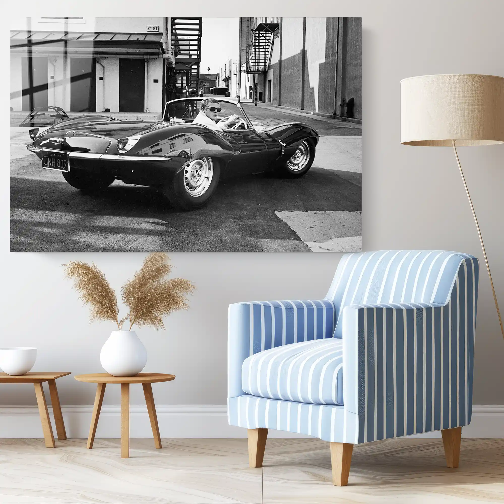 Asalet, hız ve karizmanın tek bir karede buluştuğu o ikonik an… Bu özel cam tablo, Hollywood’un “Havalılar Kralı” Steve McQueen’i, otomotiv tarihinin en nadide parçalarından biri olan Jaguar XKSS’in direksiyonunda ölümsüzleştiriyor.
