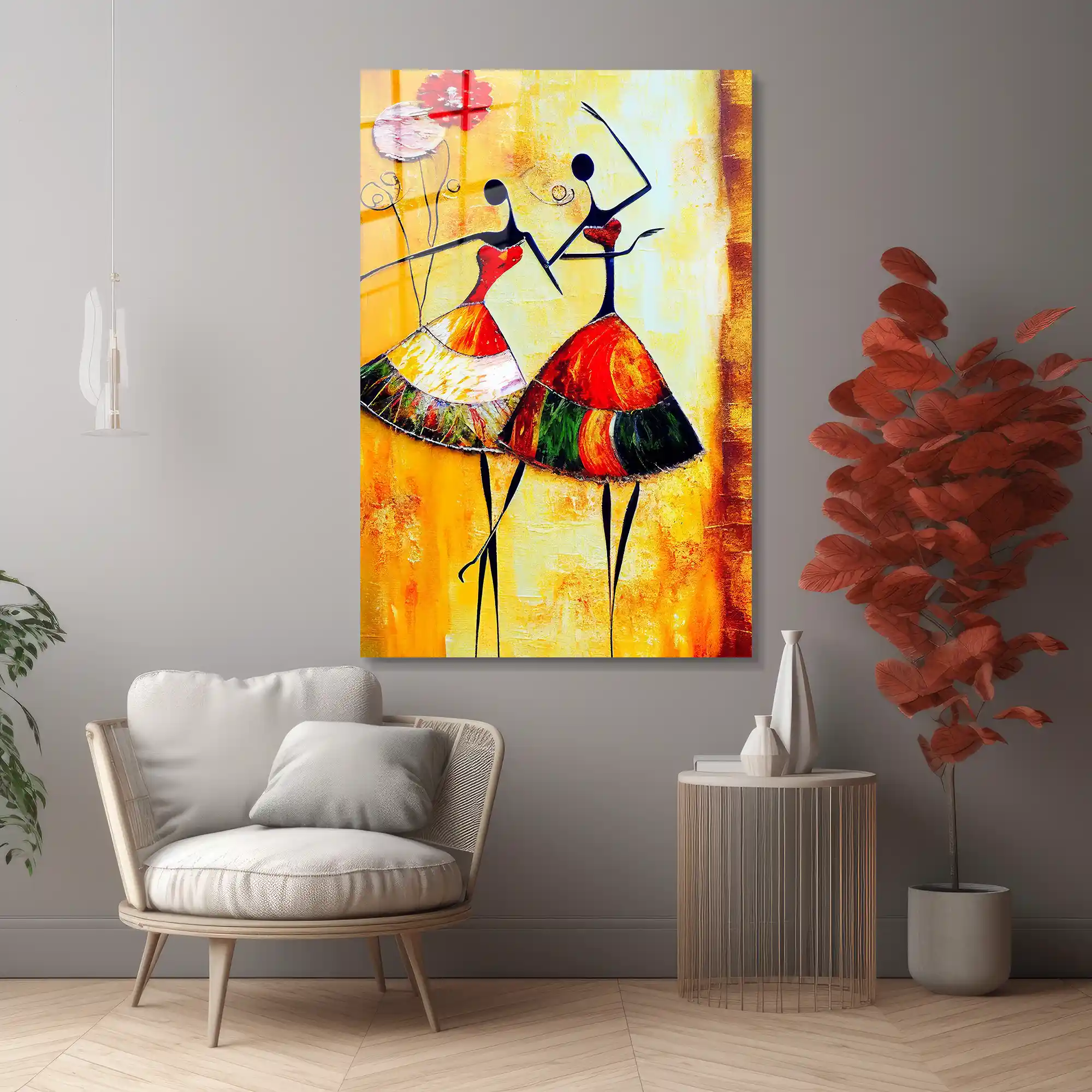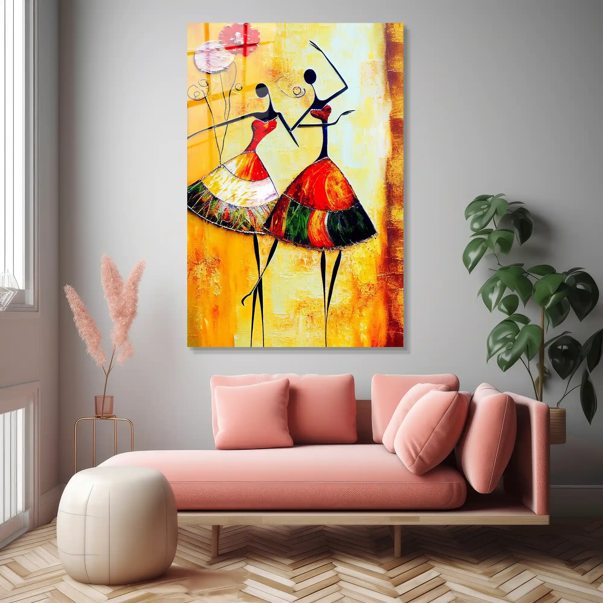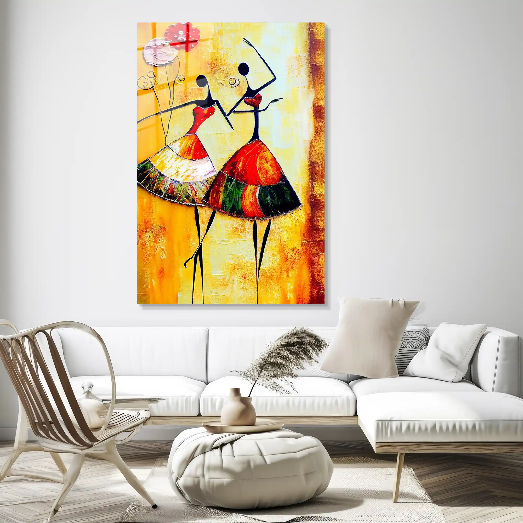Geleneksel dokuların modern sanatla en sıcak buluşması… Bu özel eser, sarı ve turuncunun güneş gibi ısıtan tonları üzerinde, iki dansçı figürünün zarif ve coşkulu hareketlerini resmediyor. Afro-modern bir tarzla yorumlanan bu figürler, hayatın ritmine ve kadın enerjisinin zarafetine odaklanıyor. Camın pürüzsüz yüzeyi, tablodaki her bir fırça darbesini ve canlı renk geçişini kristal netliğinde sunarak mekanınıza sofistike bir enerji katar. Bu tablo, sadece bir duvar sanatı değil; yaşamın neşesine, dansın özgürlüğüne ve kültürel zenginliğe açılan renkli bir penceredir.