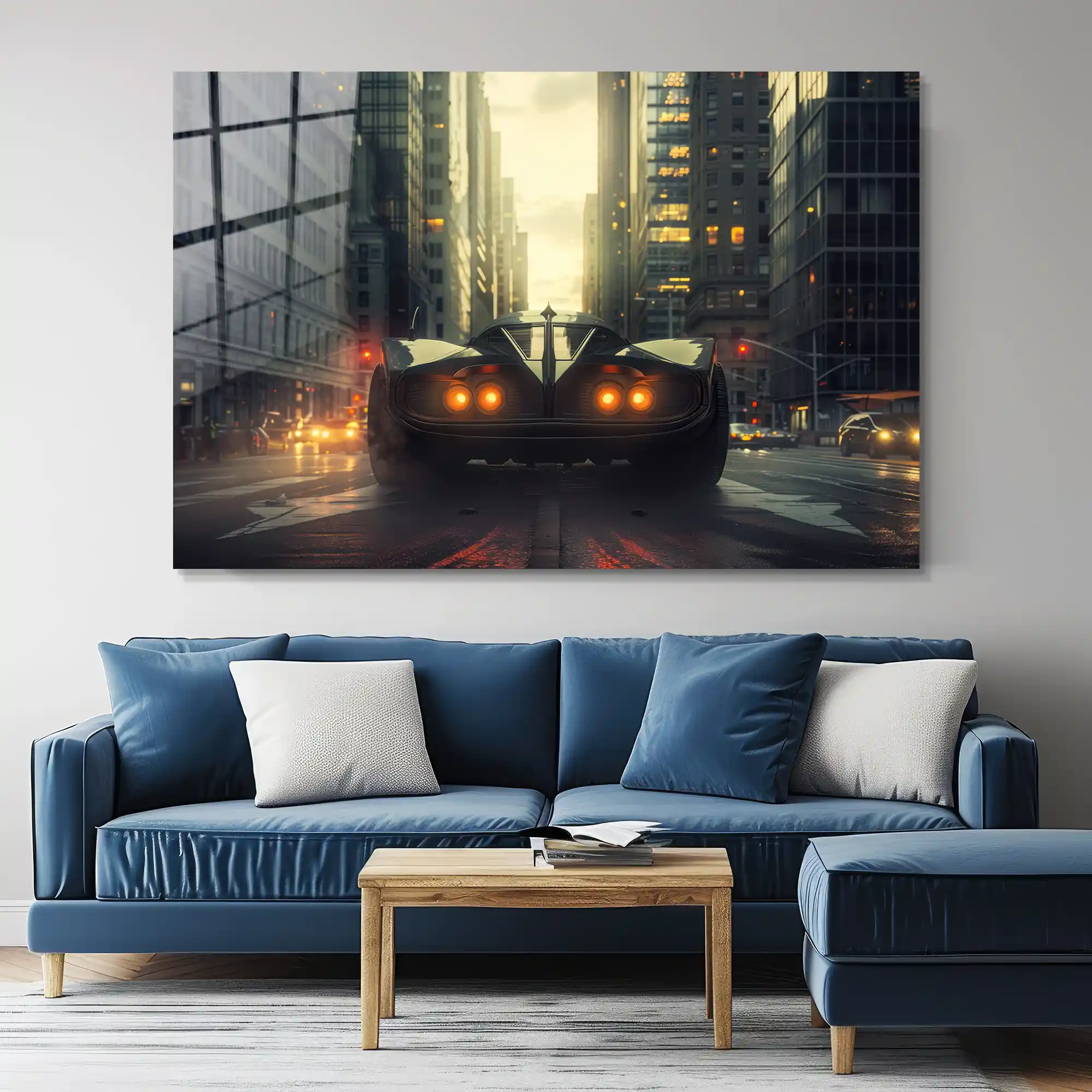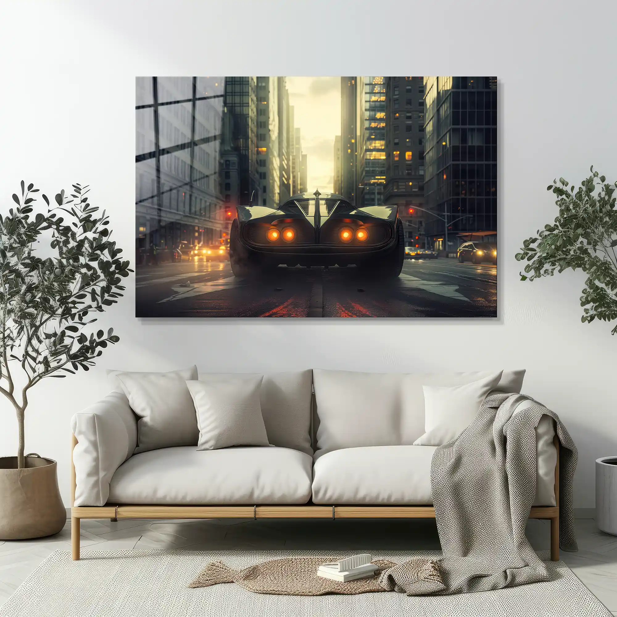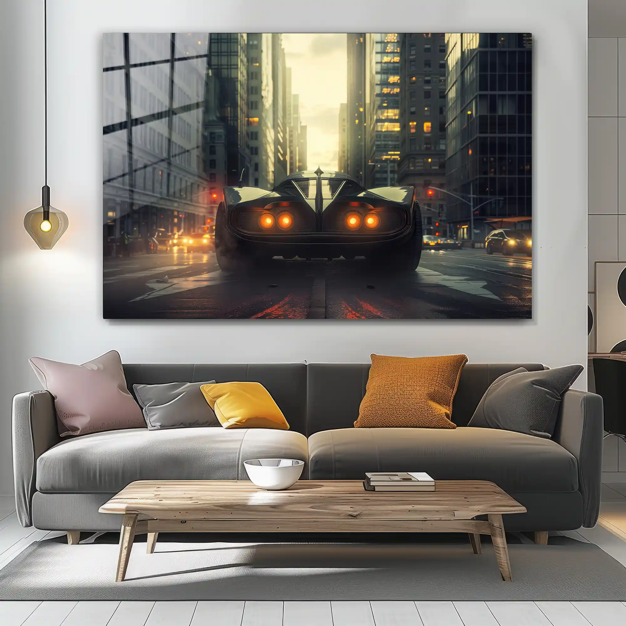 Şehir ışıklarının ıslak asfalttaki yansımaları ile aracın gizemli silüeti arasındaki bu muazzam denge, mekanınıza anında bir “Cyberpunk” derinliği katar. Bu eser sadece bir otomobil görseli değil; metropol yaşamına, hızın estetiğine ve yarının dünyasına adanmış modern bir saygı duruşudur. Camın parlak yüzeyi, şehir ışıklarının parıltısını ve siyahın derin tonlarını ön plana çıkararak duvarınızda hem teknolojik hem de sofistike bir atmosfer yaratır.