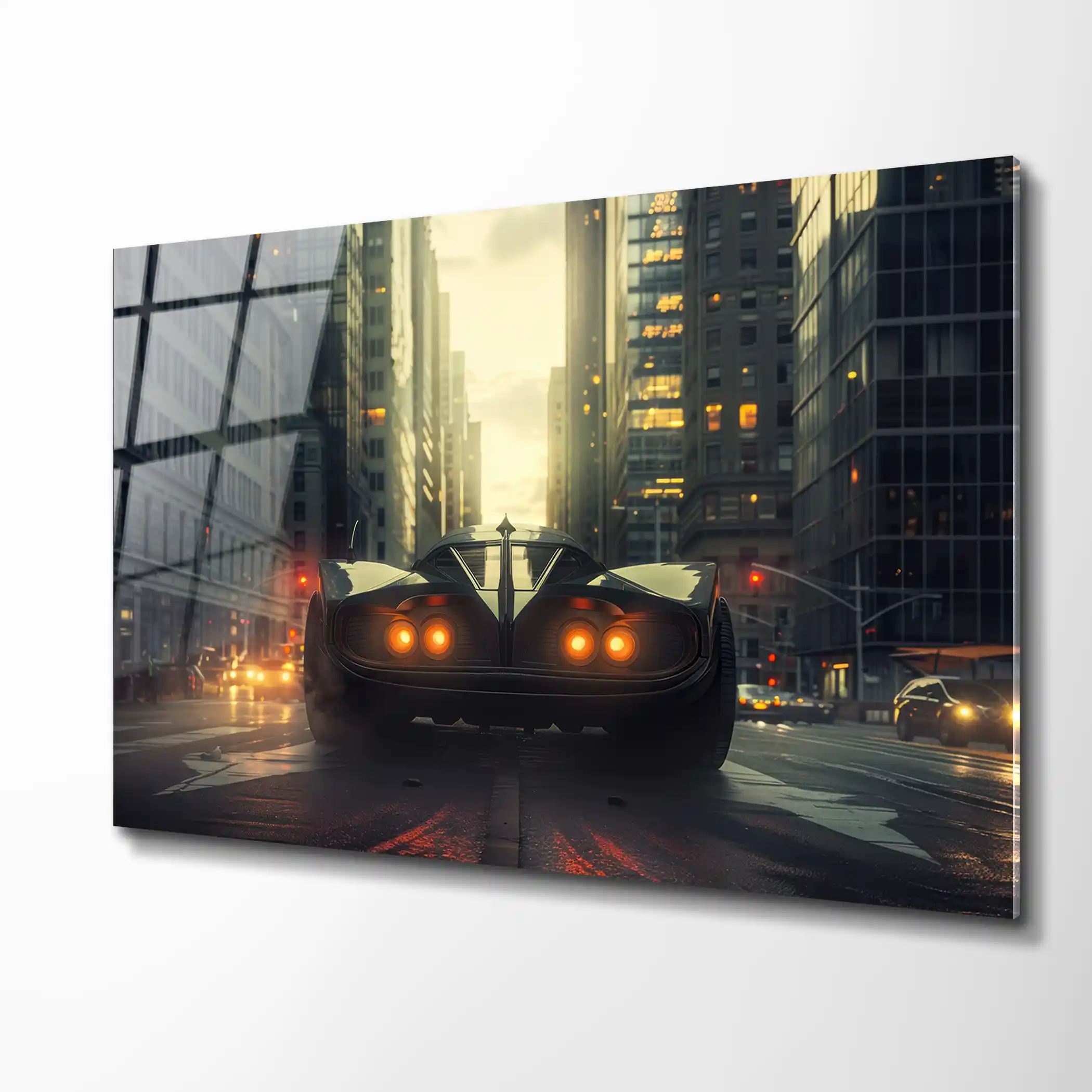 Geleceğin teknolojisi, modern şehrin devasa gökdelenleri arasında hayat buluyor… Bu özel cam tablo, aerodinamik hatları ve yanan turuncu stop lambalarıyla büyüleyen siyah konsept spor otomobili, gün batımı sonrası şehrin puslu atmosferinde sunuyor.