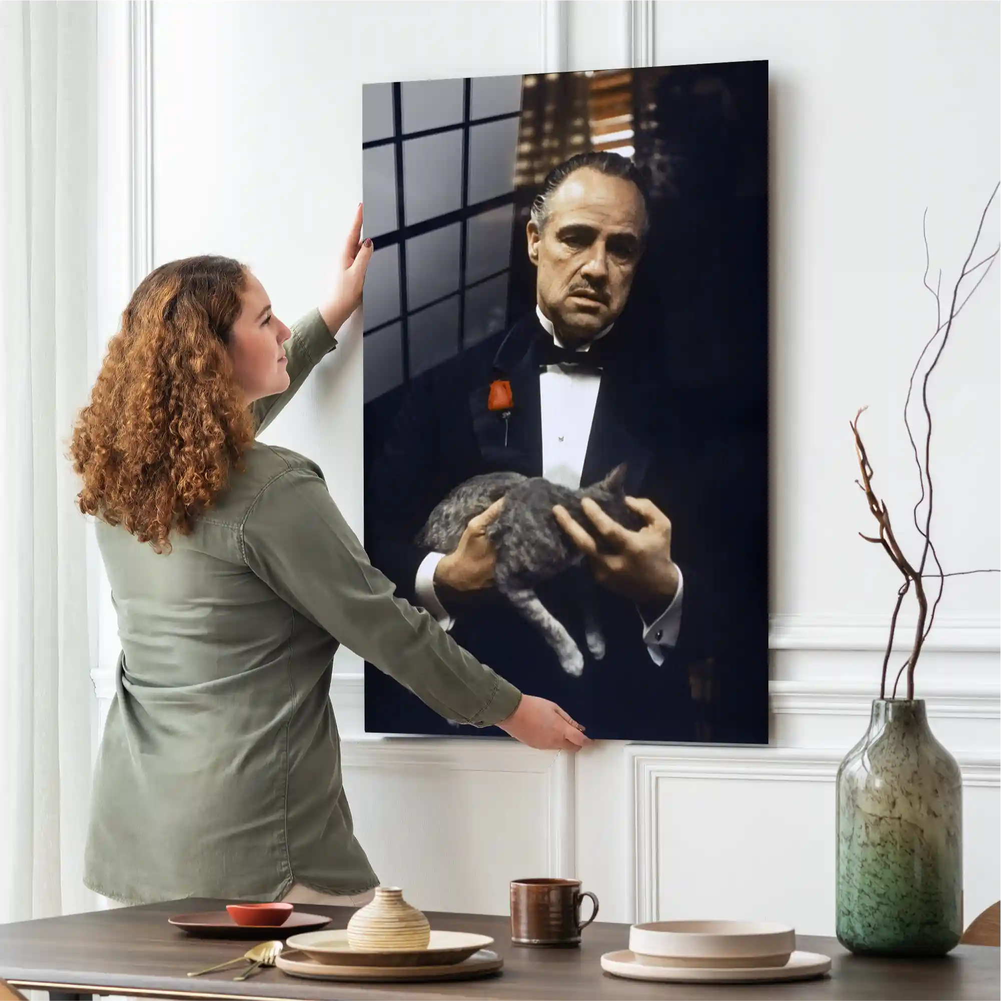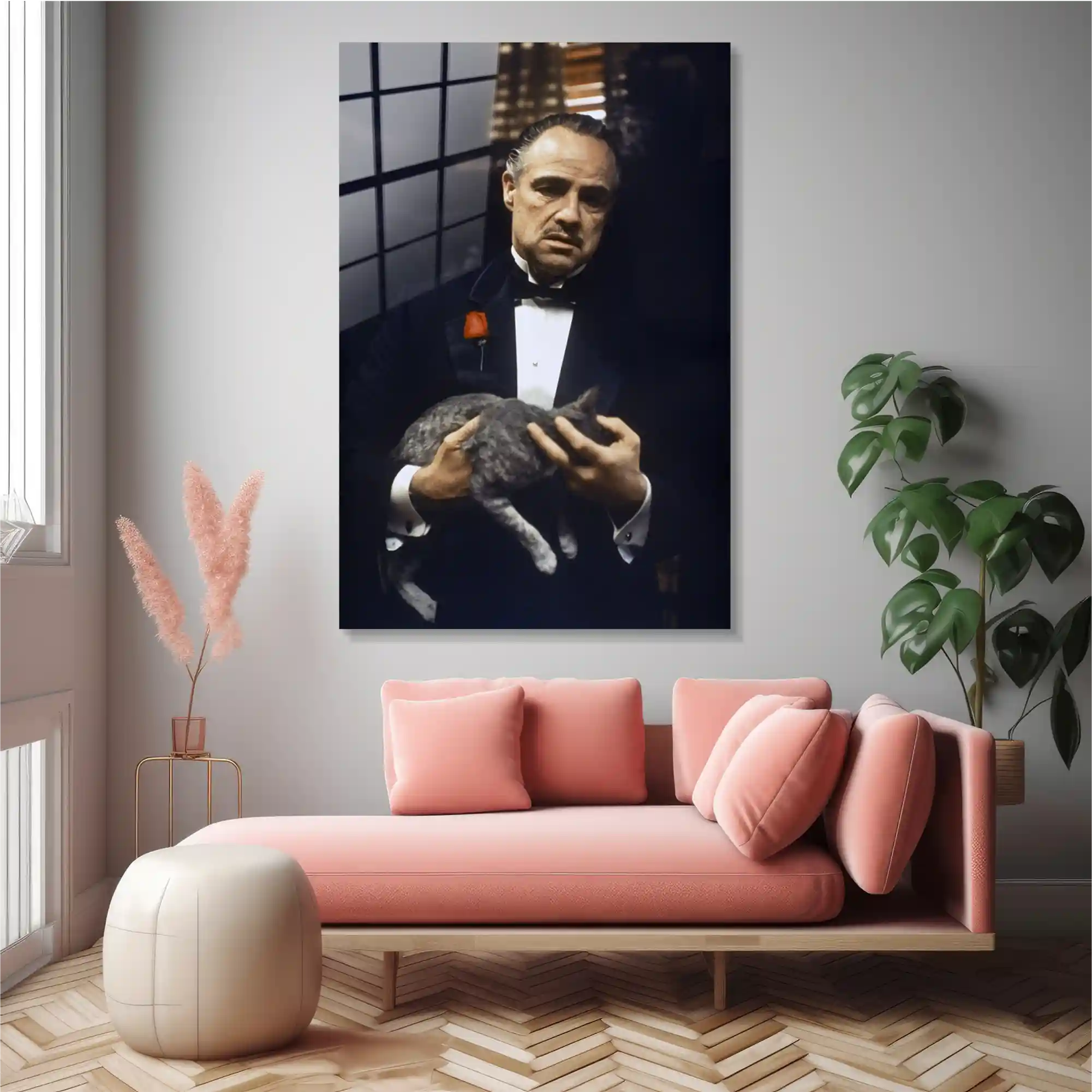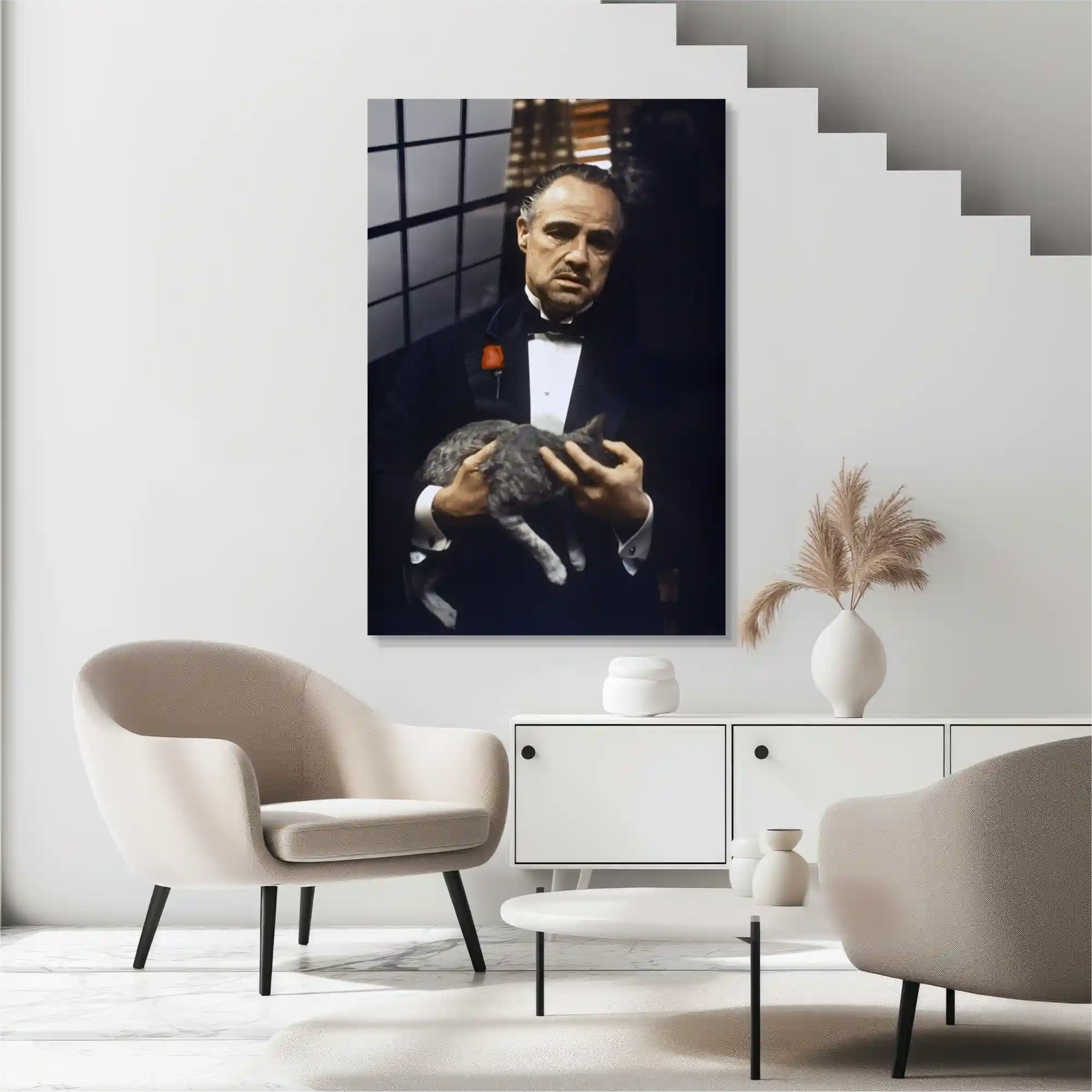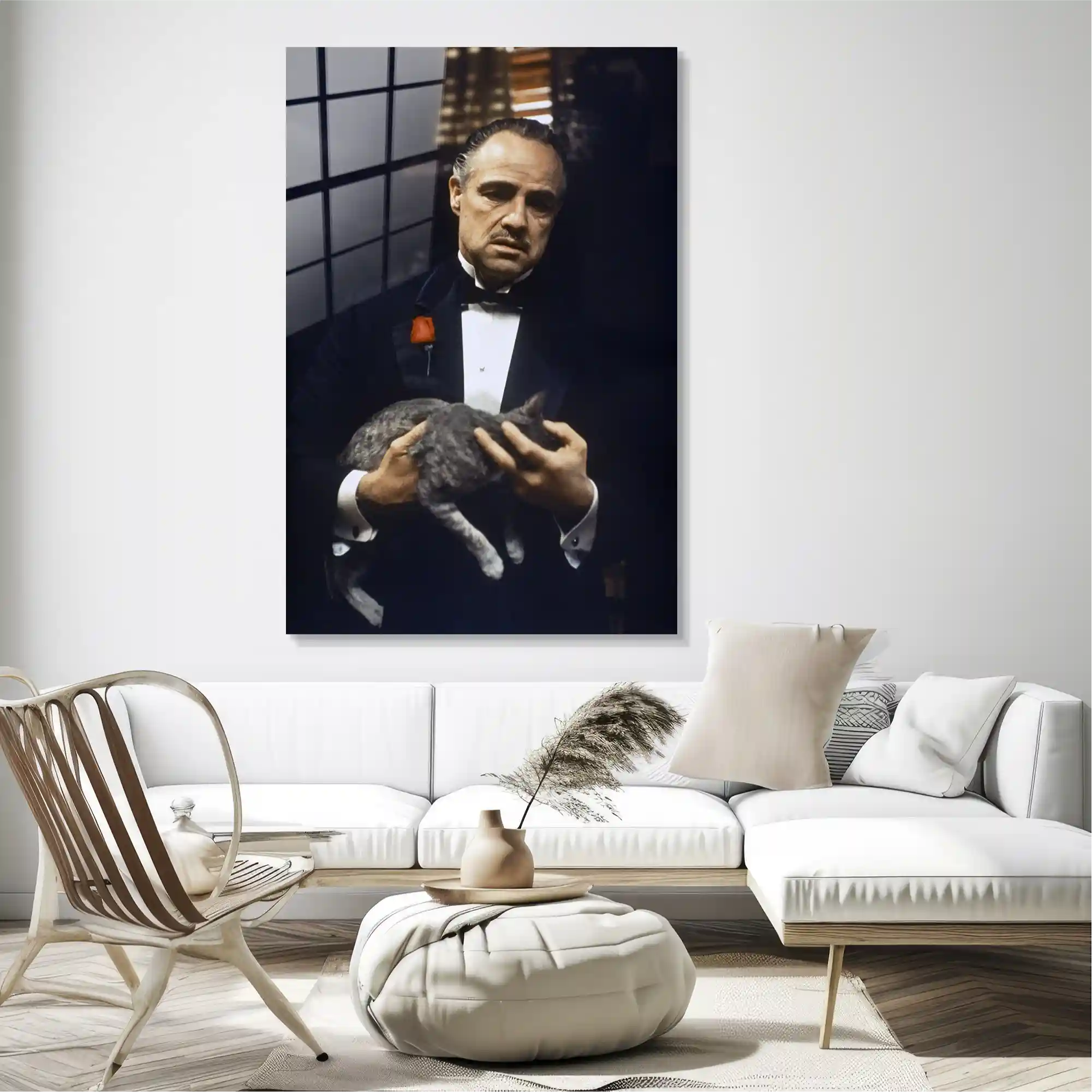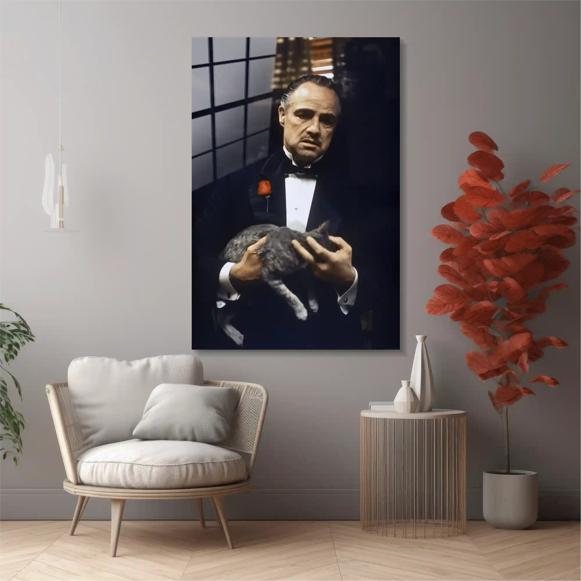 Bir babanın gücü, bir İmparatorluğun sessiz başlangıcı. “Baba” filminin bu ikonik sahnesi, Don Vito Corleone’nin kararlılığını, karizmasını ve taşıdığı ağır sorumluluğu yansıtır. Kucağındaki kedi, mutlak otorite ve hassasiyet arasındaki ince çizgiyi sembolize eder. Karanlık, çarpıcı atmosfer ve keskin bakışlar, duvarınızdaki bu tablonun sadece bir film karesi değil, aynı zamanda saygı, sadakat ve gücün zamansız bir dersi olduğunu gösterir. Klasik sinema tarihinin en karizmatik ve etkileyici anını evinize taşıyın.