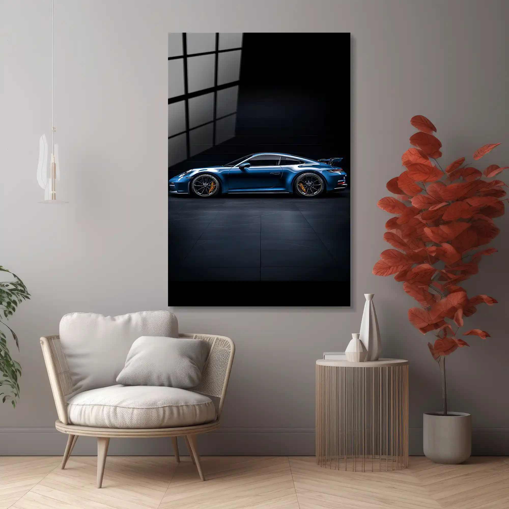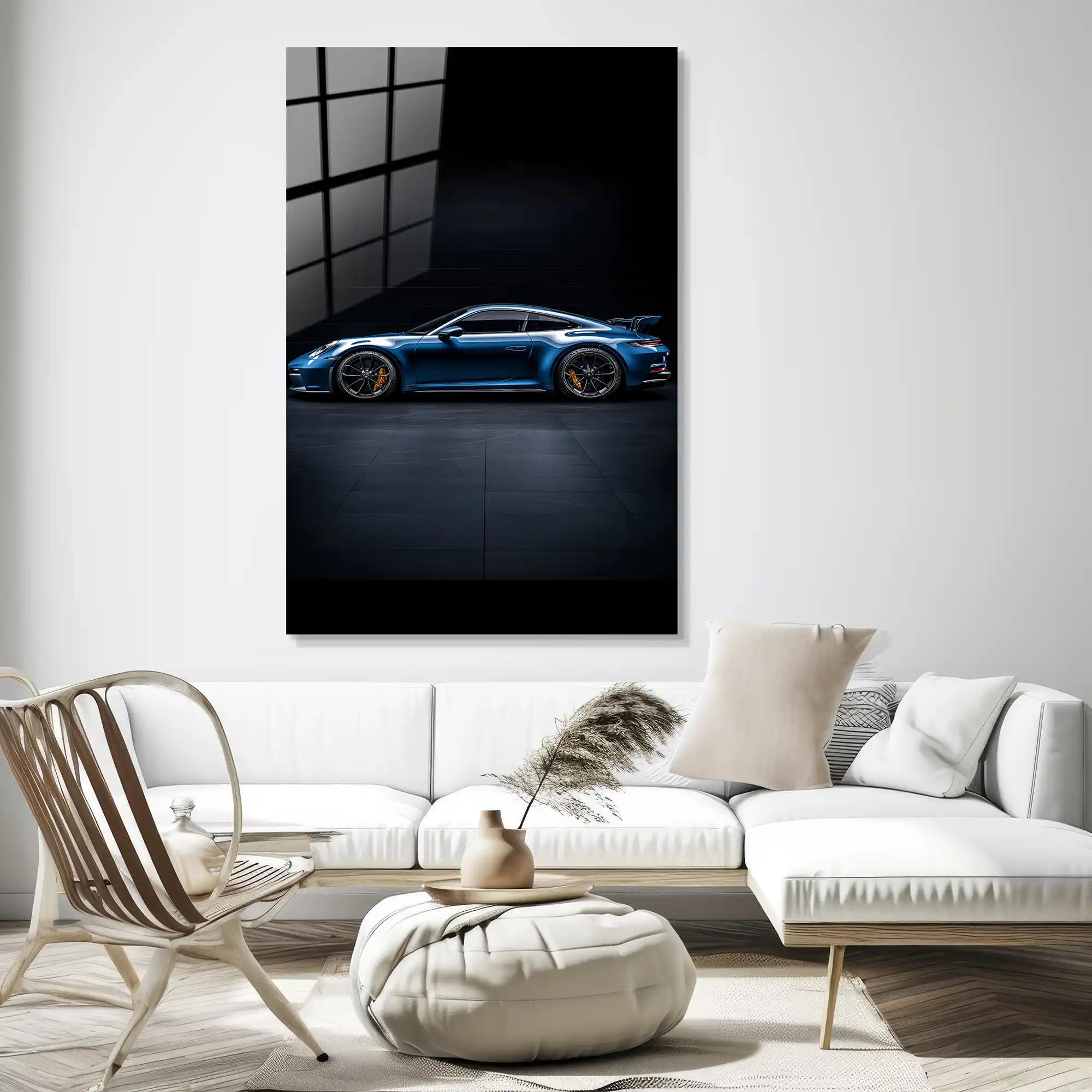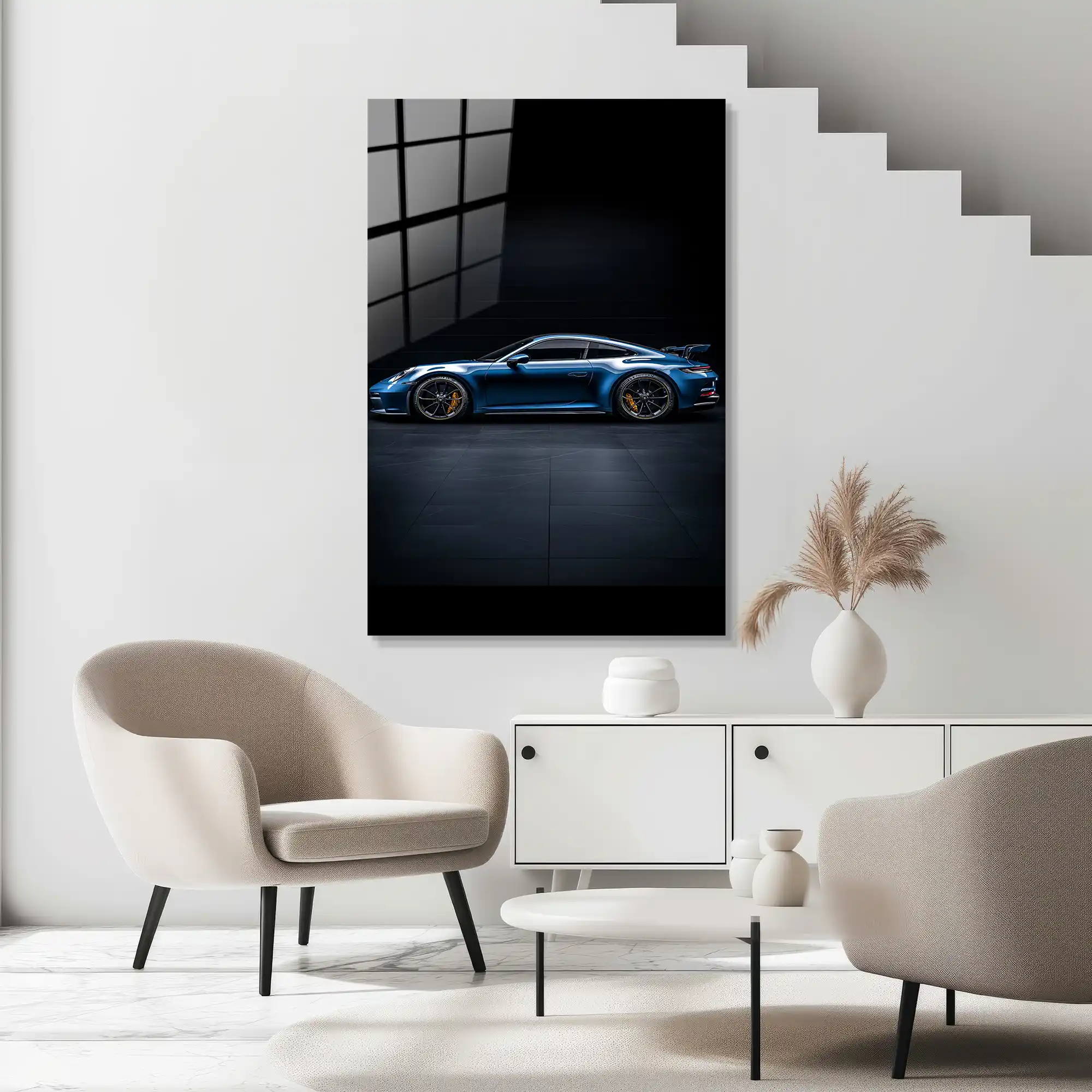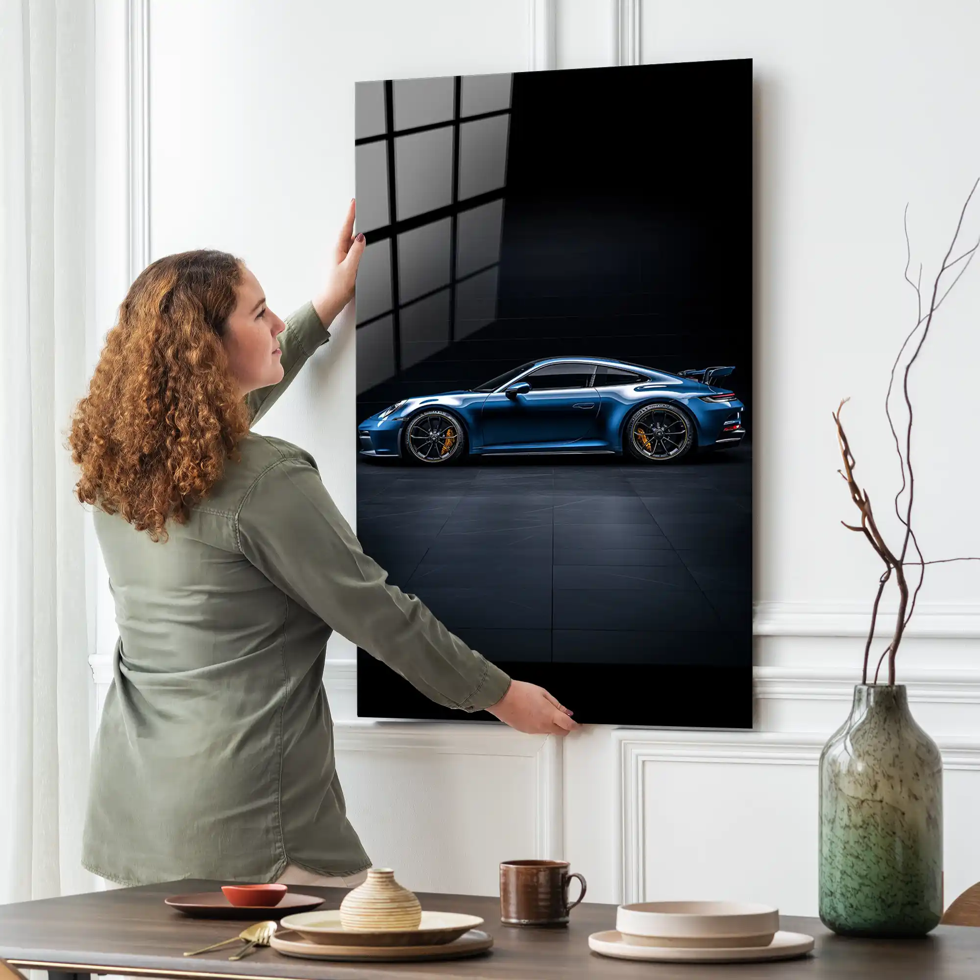 Mühendisliğin karanlıkta bile göz kamaştırdığı o mükemmel an… Bu özel cam tablo, koyu mavi bir Porsche GT3’ün aerodinamik ve kararlı silüetini, minimalist bir stüdyo ortamında ölümsüzleştiriyor.