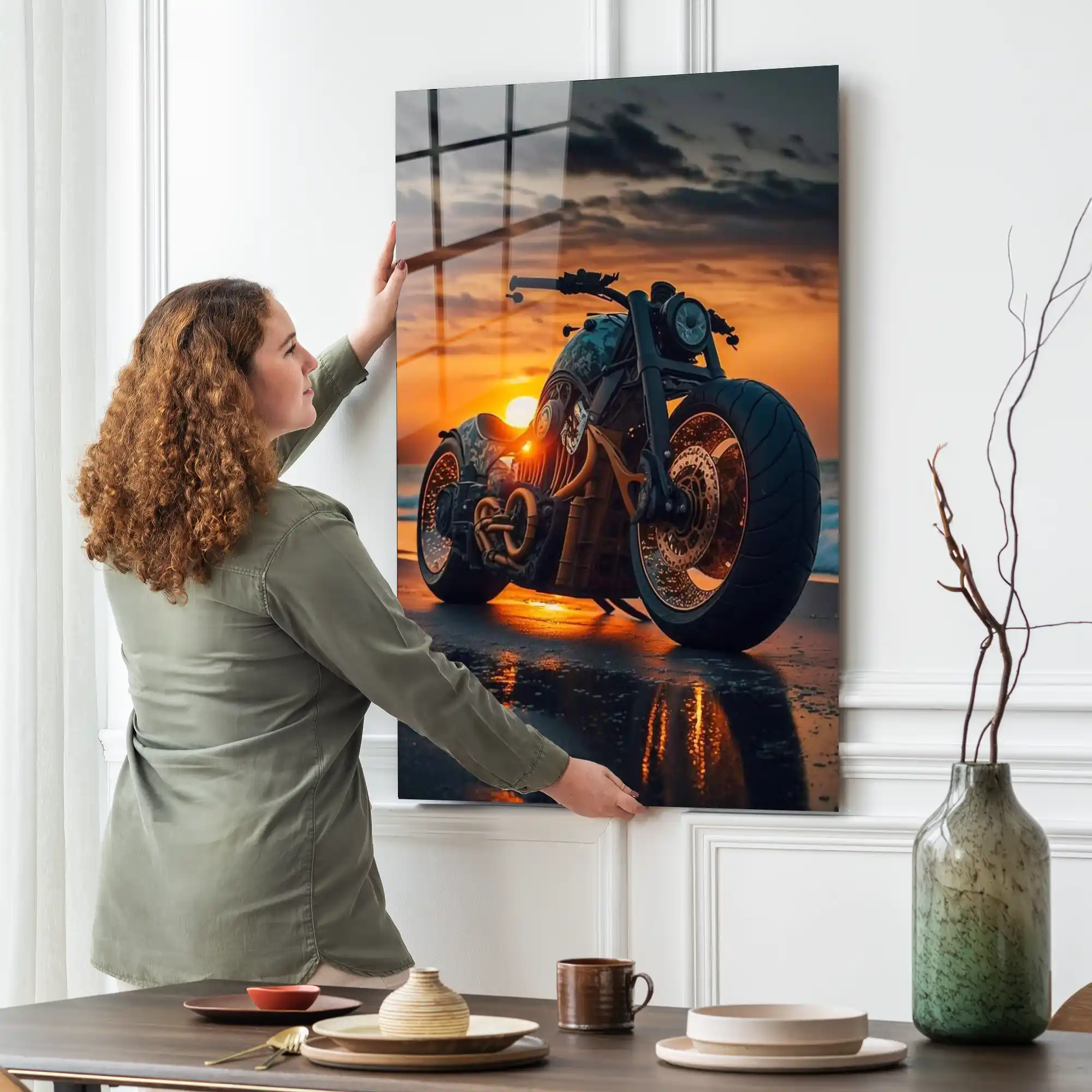 Motosikletin kaslı gövdesi, yükseltilmiş gidonu ve parlak bakır/altın detayları, doğanın dramatik fonunda asi bir sanat eseri gibi duruyor. Gün batımının sıcak turuncu ve sarı tonları, ıslak kumsalın ayna gibi yüzeyinde yansıyarak makinenin keskin hatlarını vurguluyor. Kumun yumuşak dokusu ve motosikletin sert metali arasındaki bu zıtlık, sadece bir motor tablosu değil; sınırsız yolculuğa, custom kültüre ve hızı estetikle birleştiren isyankar ruha adanmış, çarpıcı bir saygı duruşudur. Camın parlak yüzeyi, bu zengin renkleri ve metal detayların ışıltısını evinize taşıyarak özgür ve güçlü bir atmosfer yaratır.