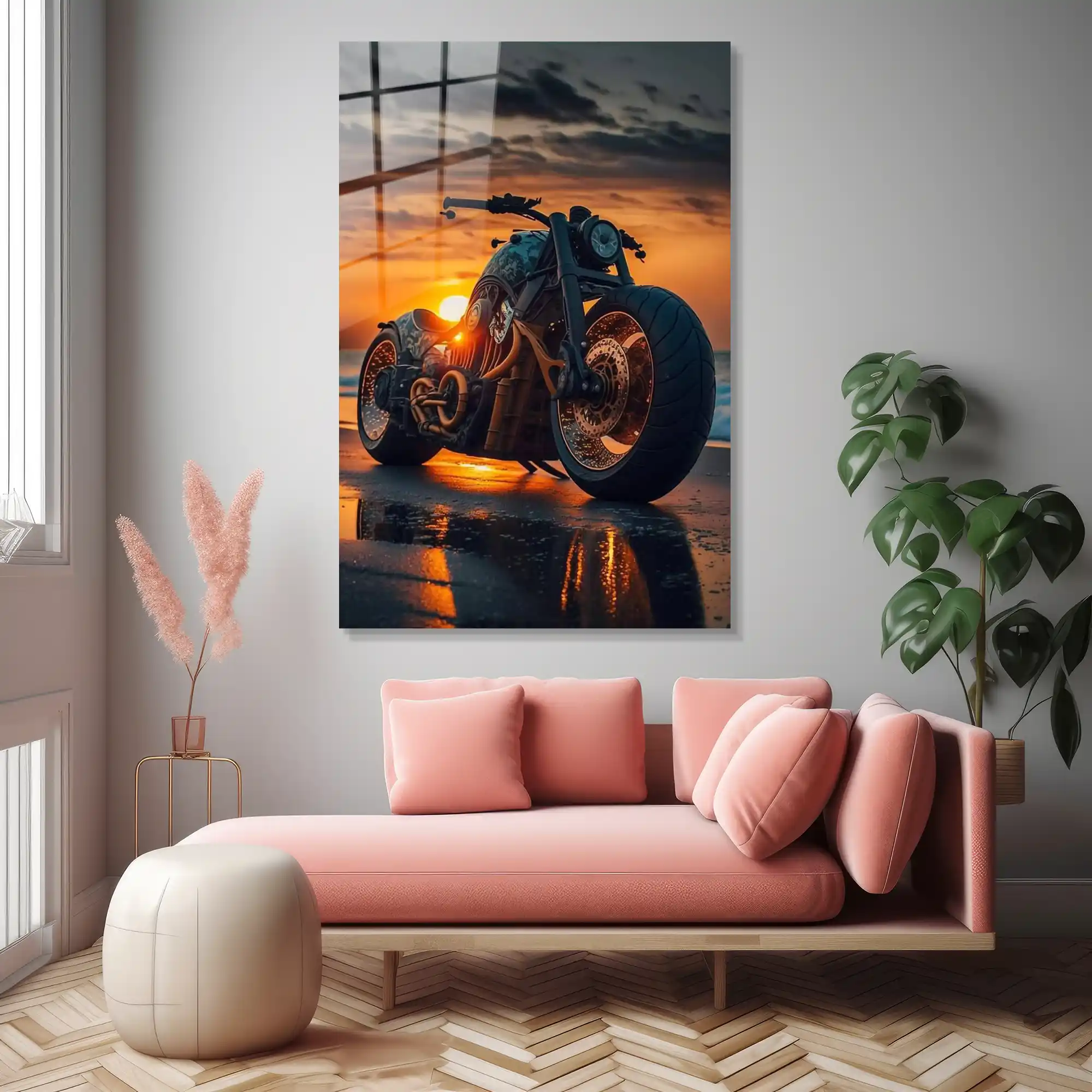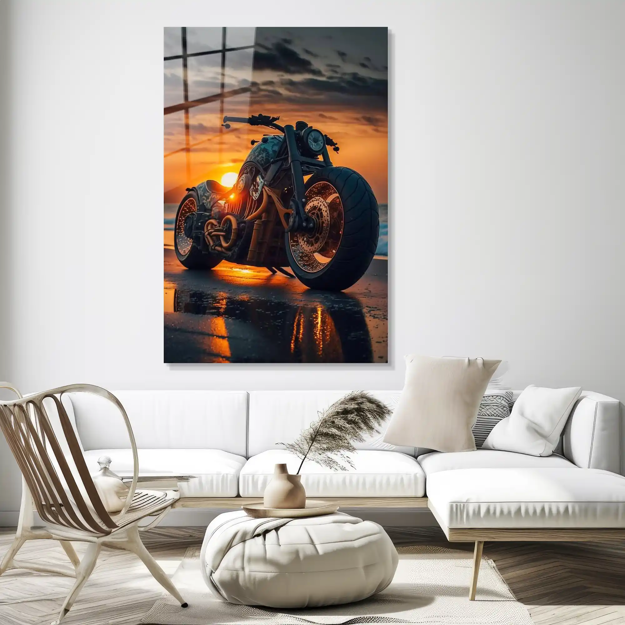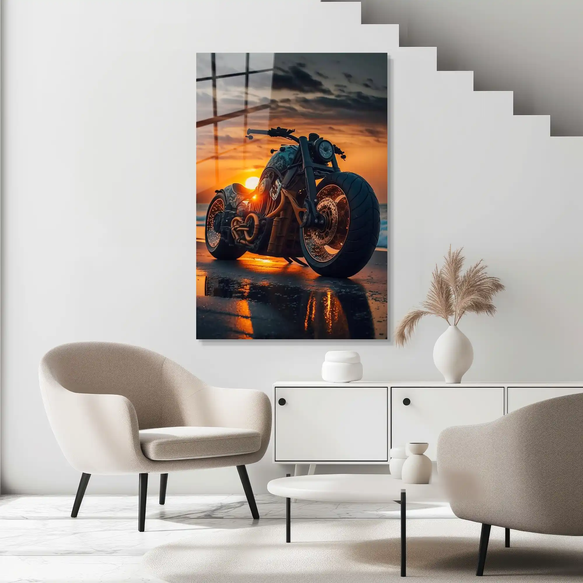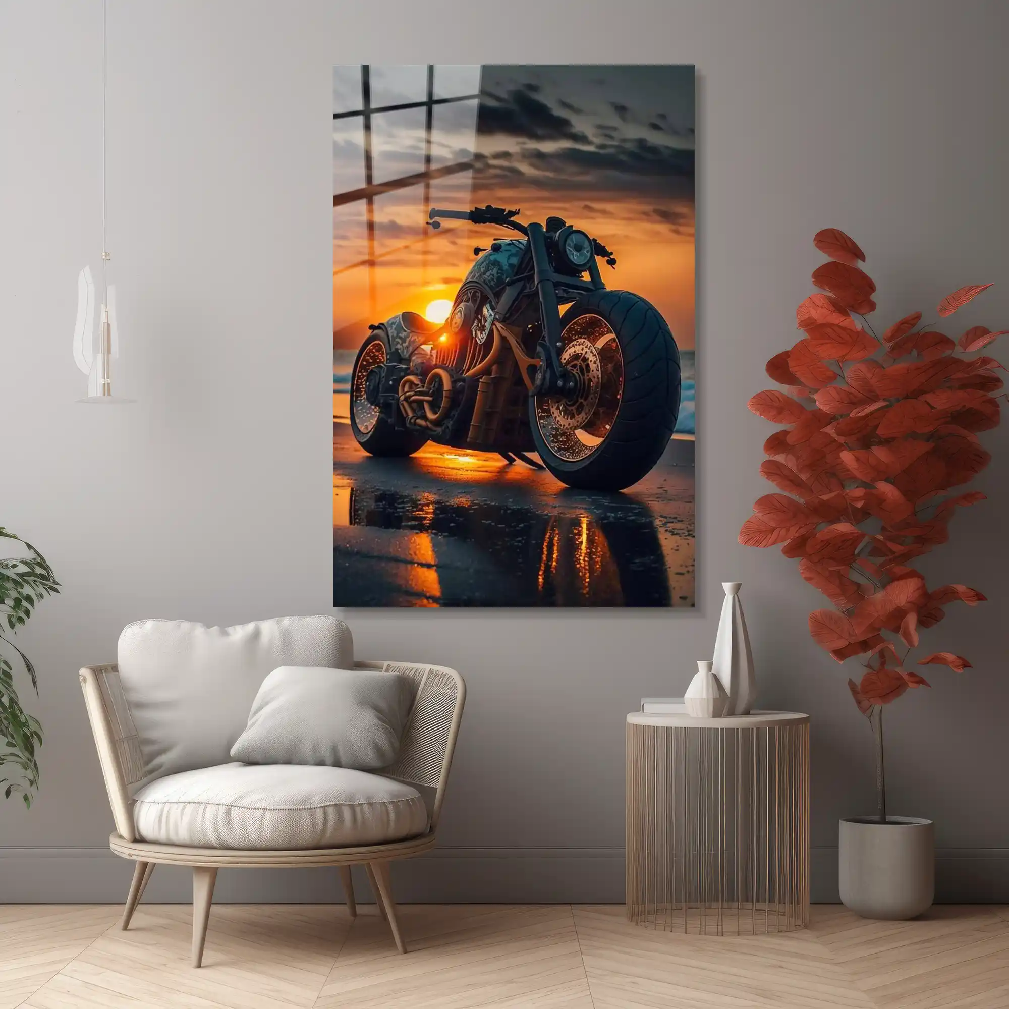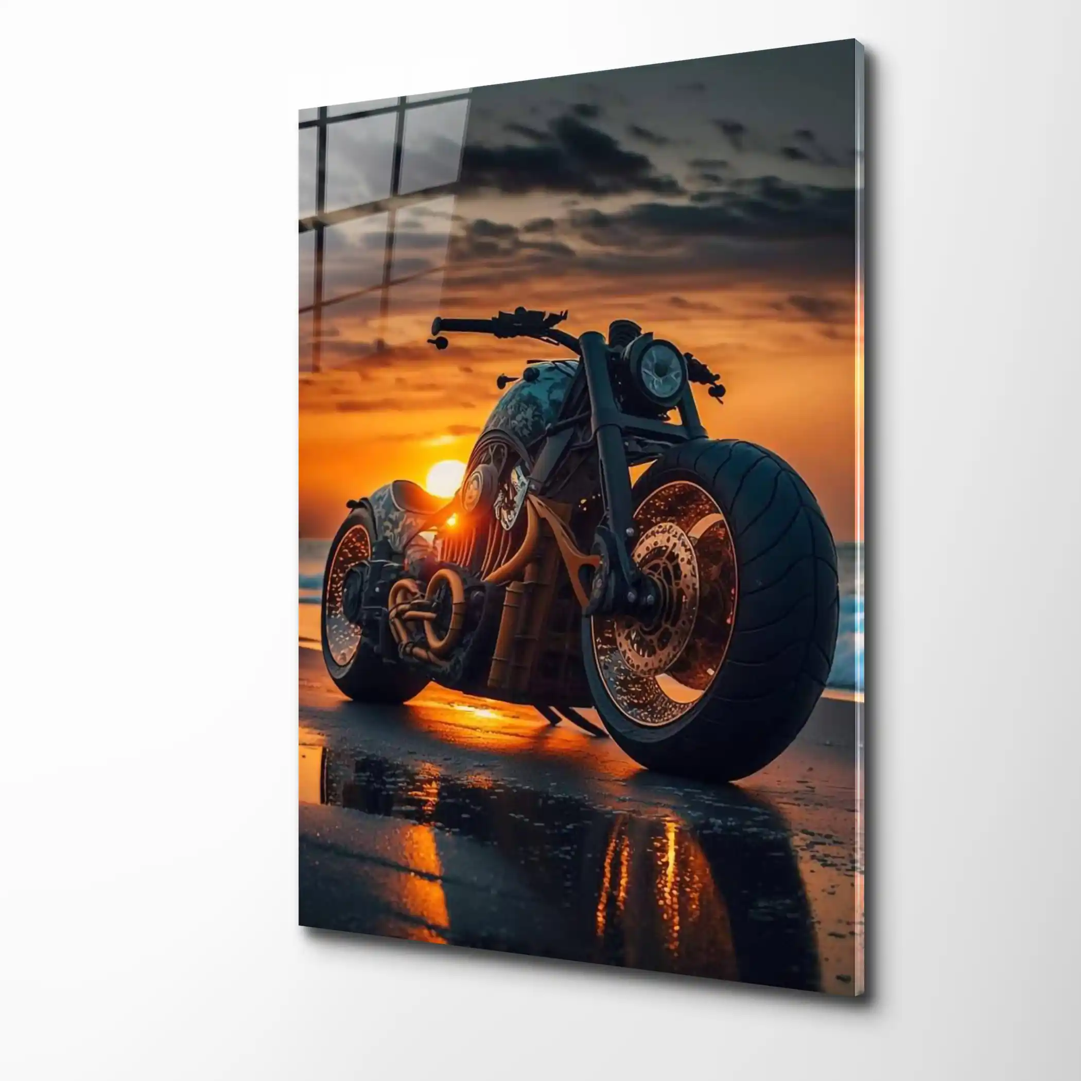Asfaltın bittiği yerde başlayan özgürlük… Bu özel cam tablo, el yapımı, güçlü bir chopper’ın (veya bobber tarzı) gün batımının kızıl ışıkları altında, ıslak sahil kumsalında bıraktığı izi ölümsüzleştiriyor.