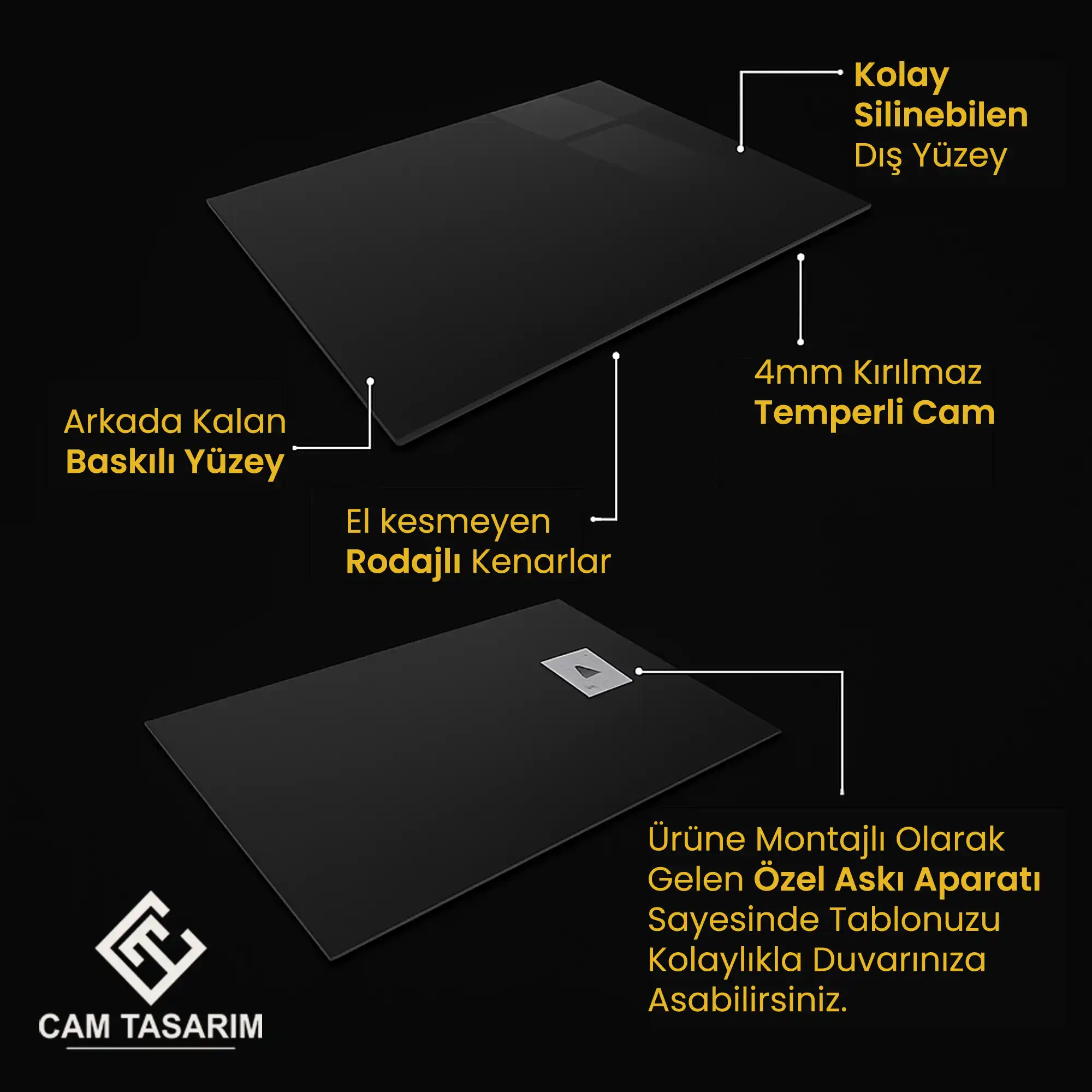 Materyal: Yüksek kaliteli, temperli (darbeye dayanıklı) gerçek cam yüzey.