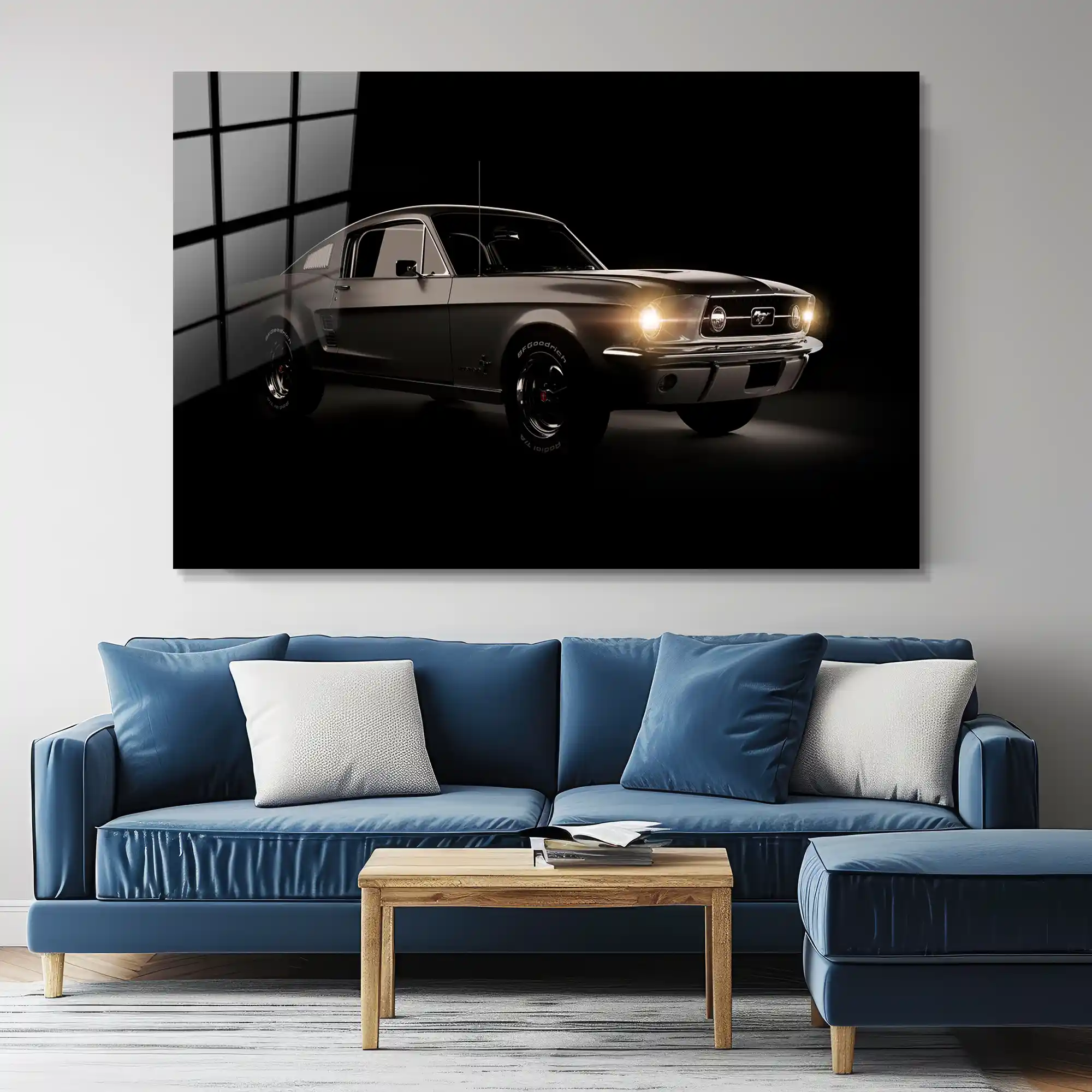 Gücün, stilin ve özgürlüğen simgesi karanlıktan doğuyor… Bu özel cam tablo, Amerikan otomotiv tarihinin en büyük efsanelerinden biri olan Ford Mustang Fastback modelini, dramatik bir ışık oyunuyla sunuyor.