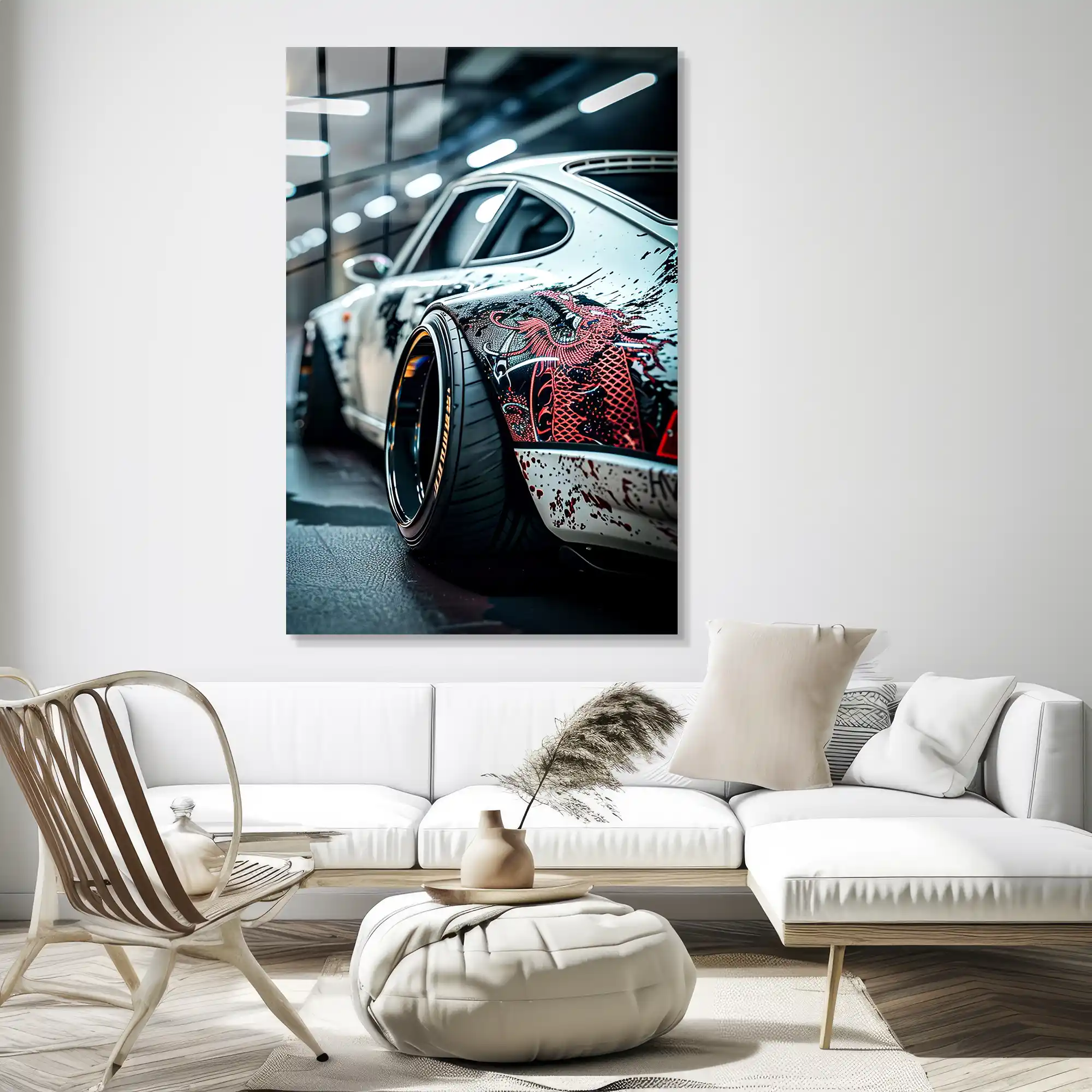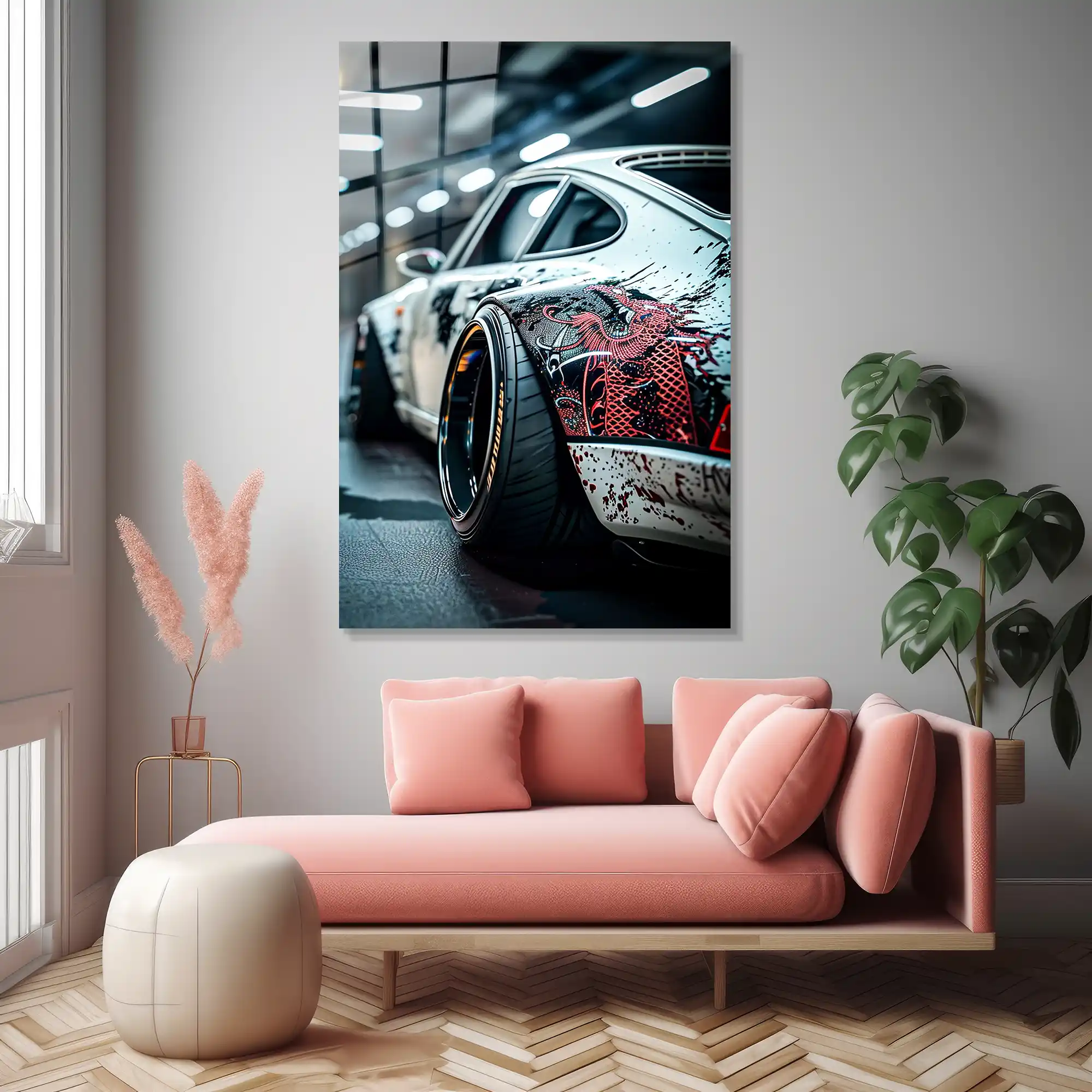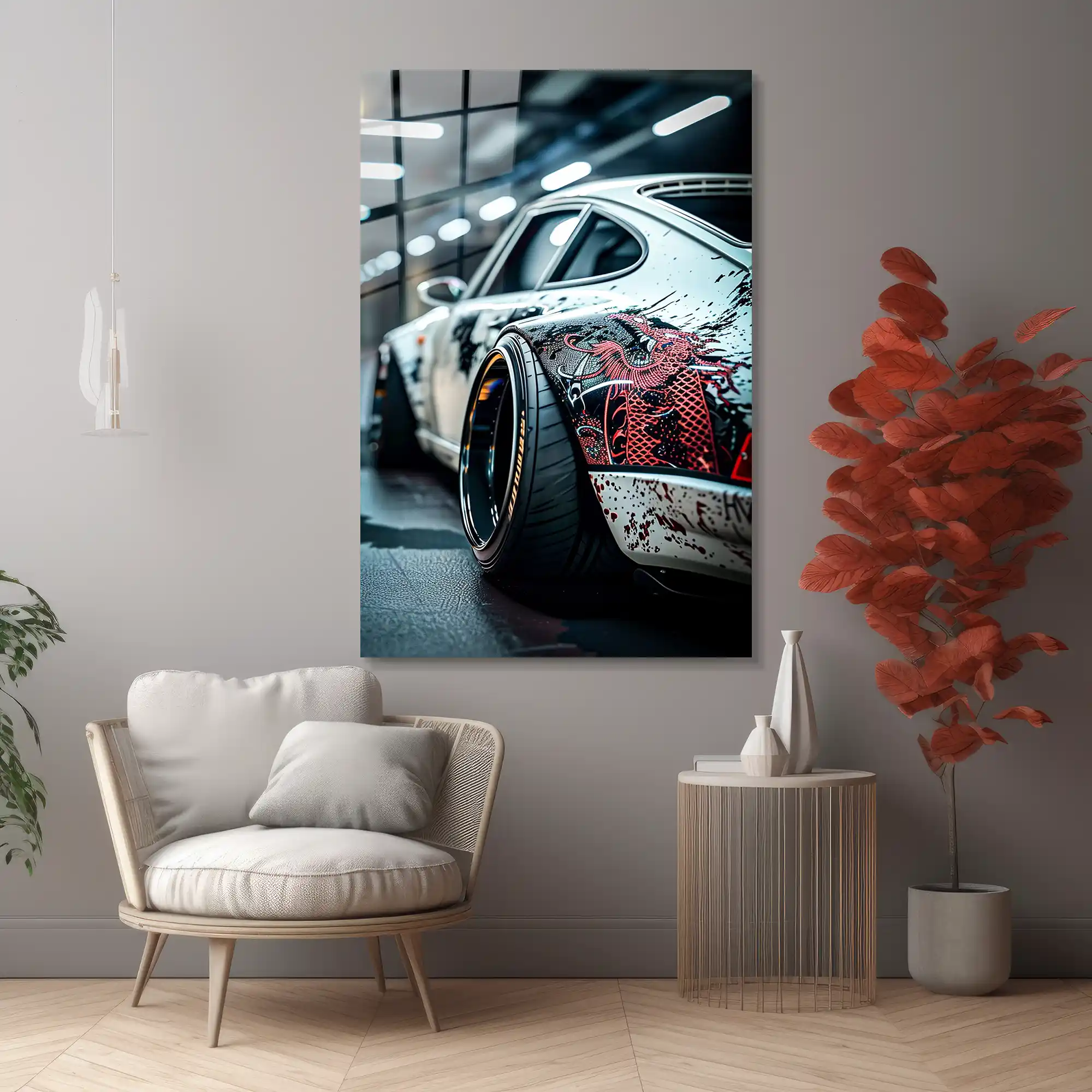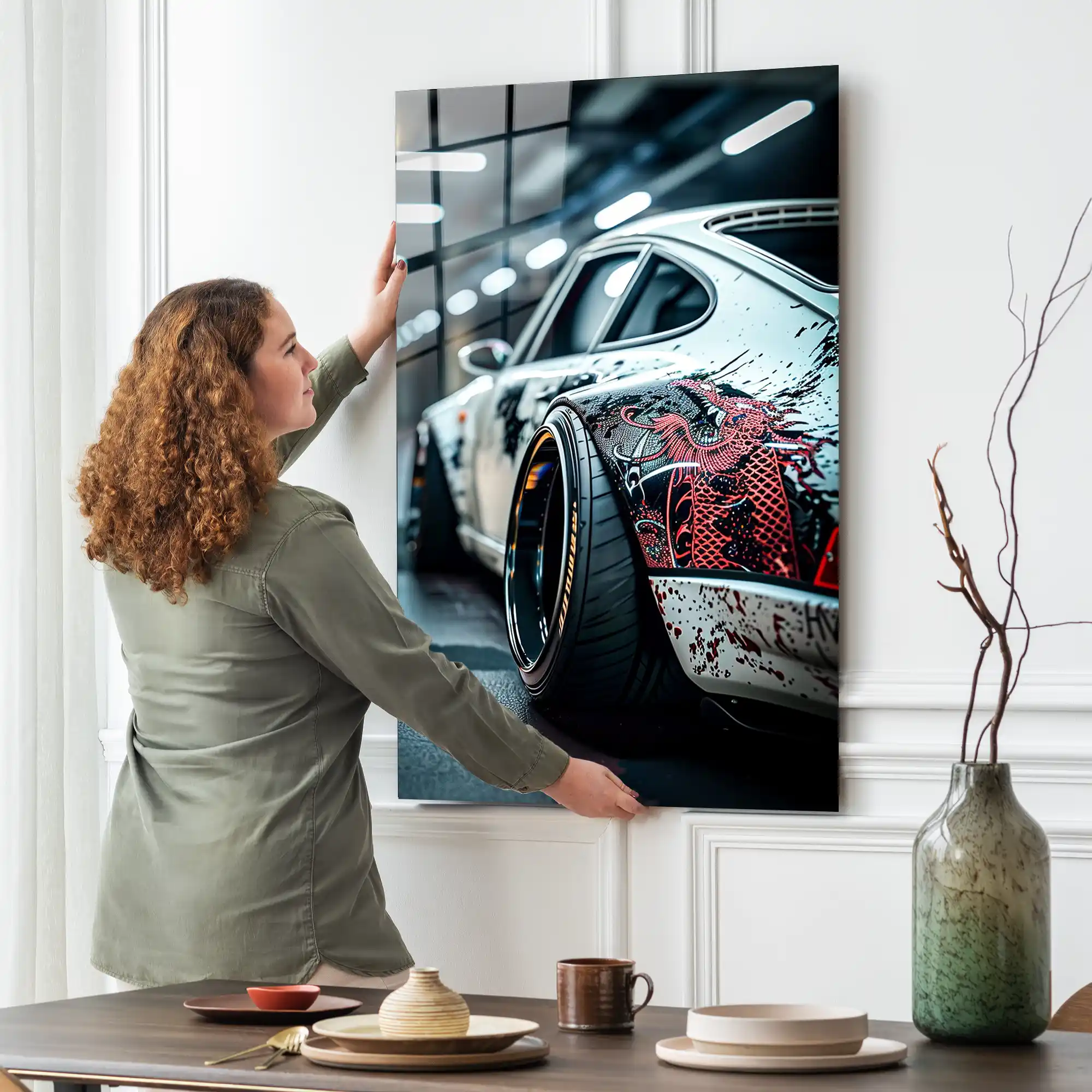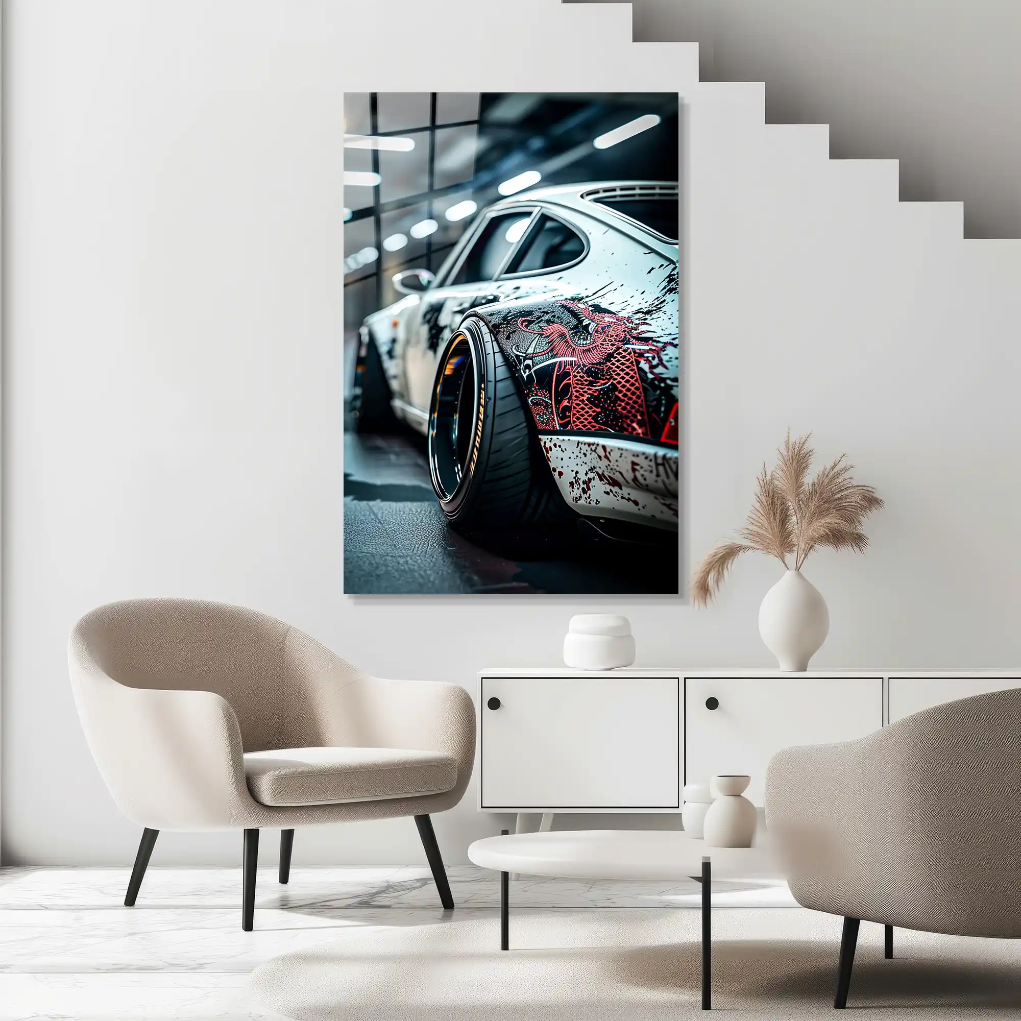 Garajların neon ışıkları altında, performans ve sanatın kesiştiği o destansı an… Bu özel cam tablo, ikonik spor otomobil silüetini, hızın ötesine taşıyan benzersiz bir sanat eseriyle buluşturuyor. Aracın genişletilmiş çamurlukları ve agresif lastikleri, pistlerin zorlu ruhunu yansıtırken; arka gövdeyi saran kırmızı-siyah ejderha (dragon) motifi ve sıçrama (splatter) detayları, modern sokak sanatının ve JDM (Japanese Domestic Market) modifiye kültürünün vahşi estetiğini evinize getiriyor.