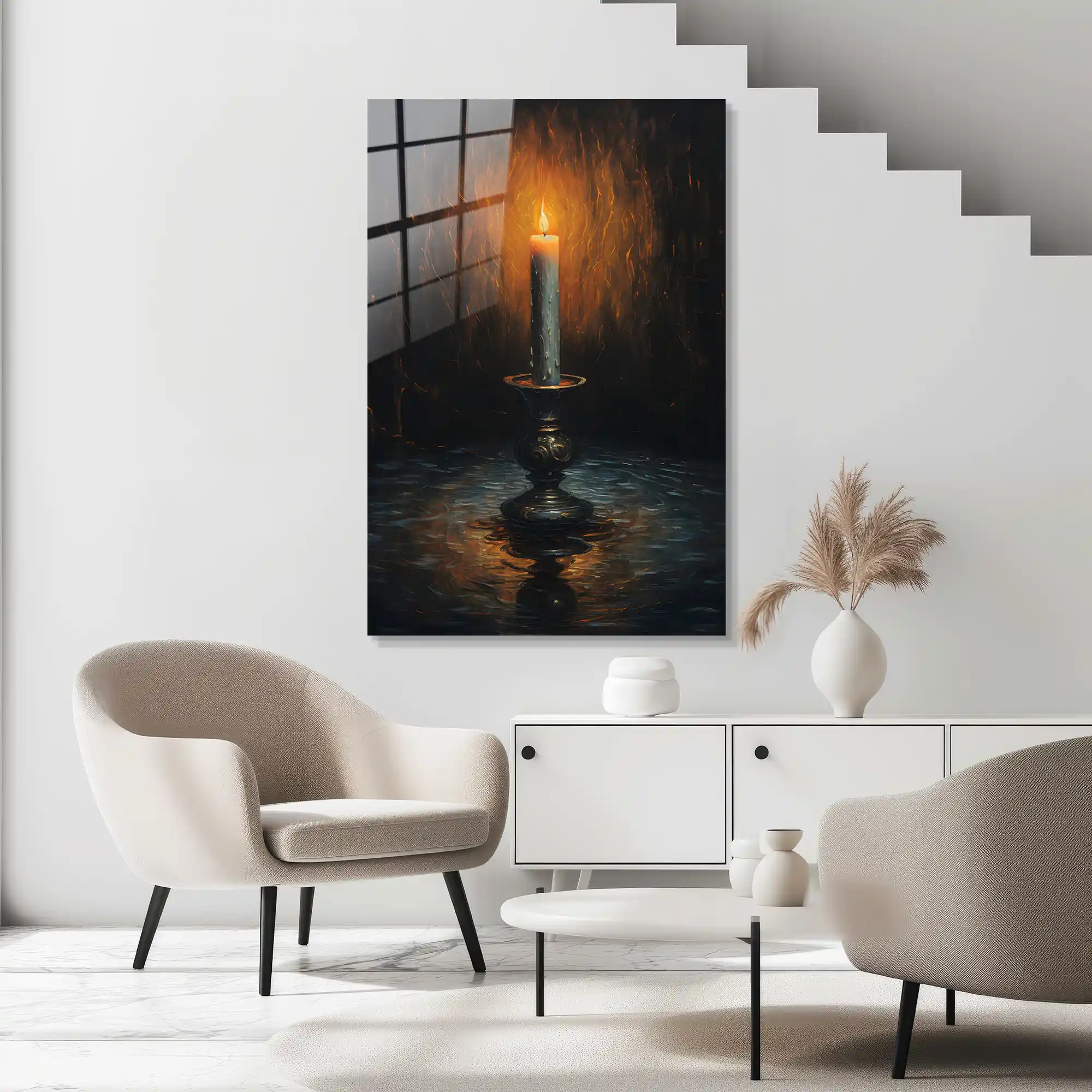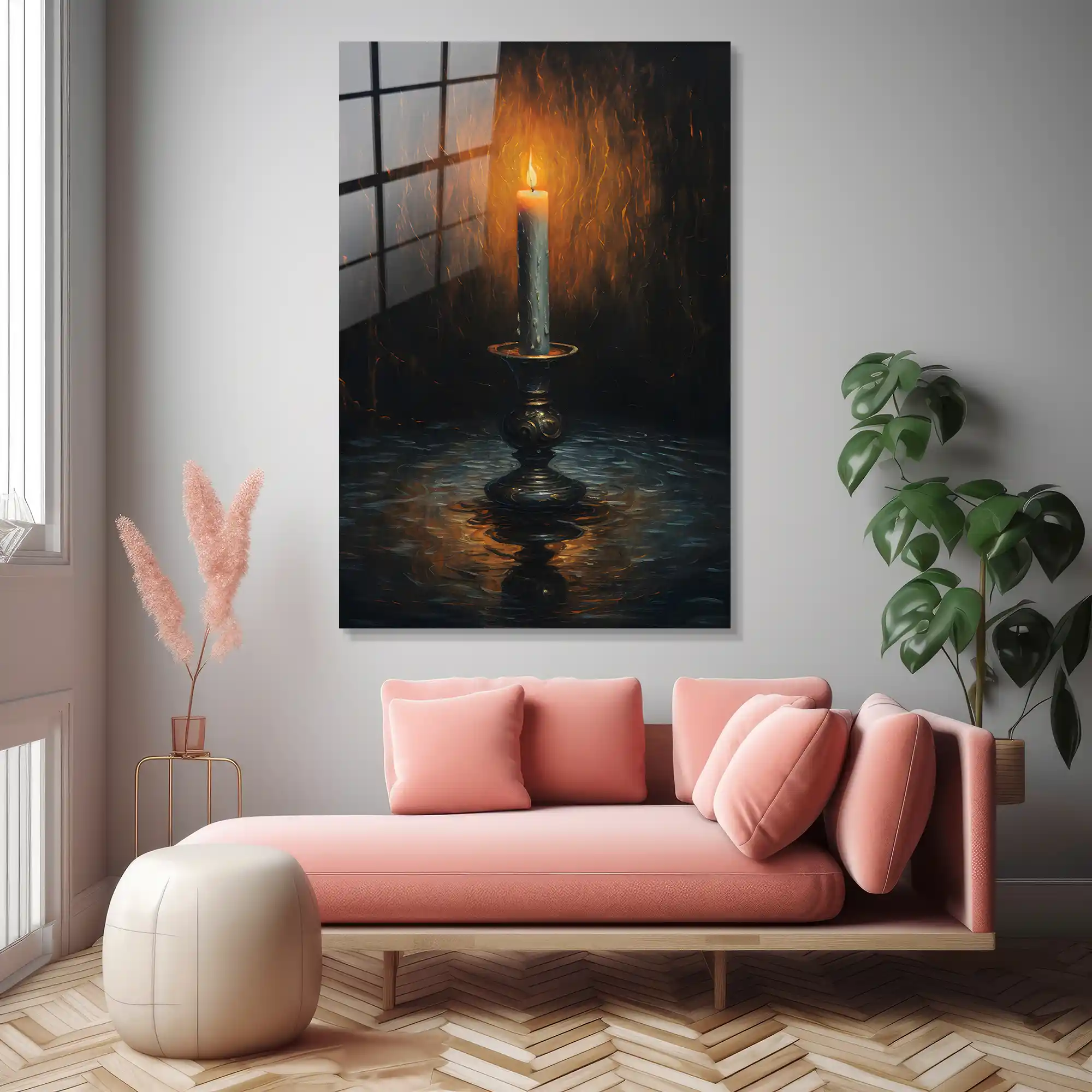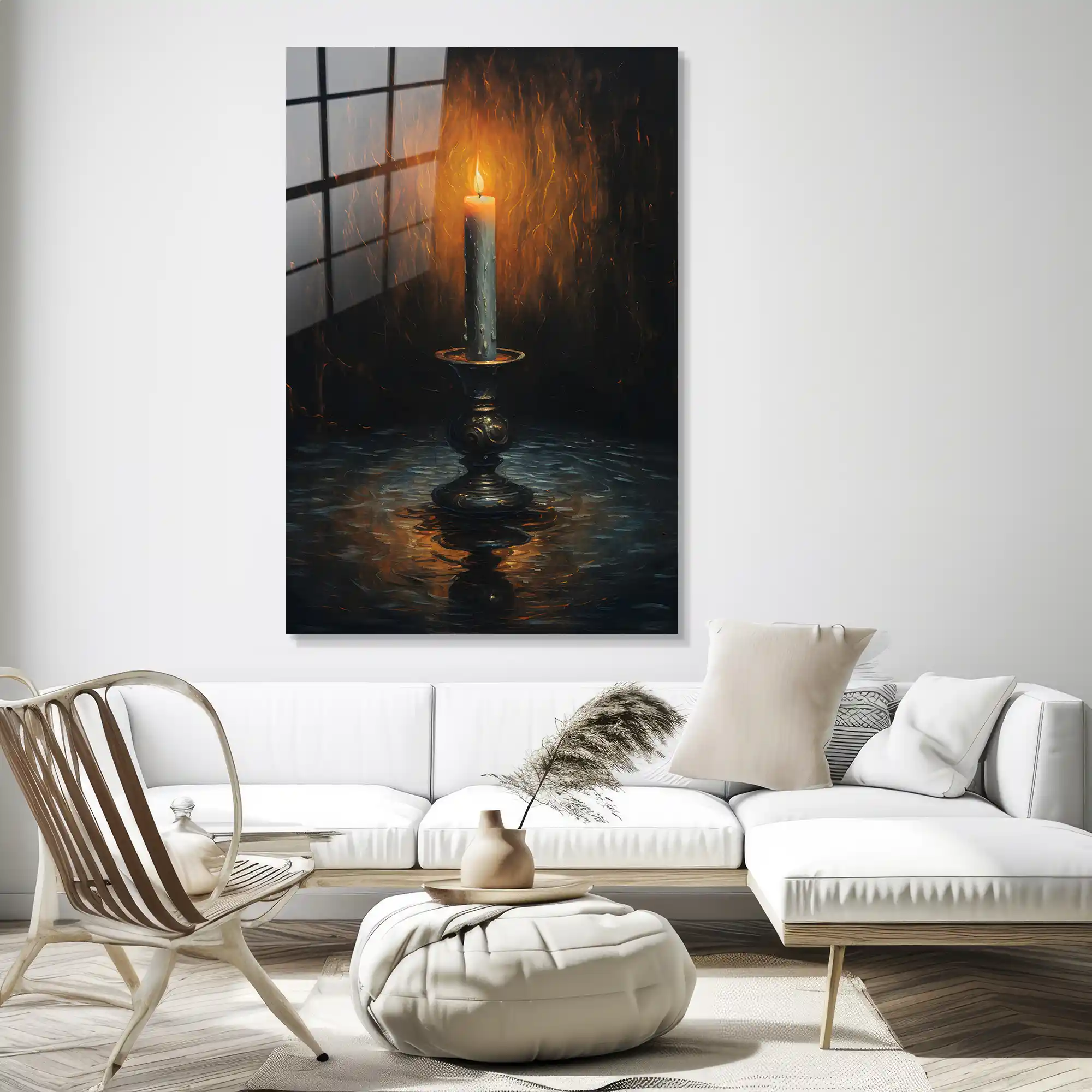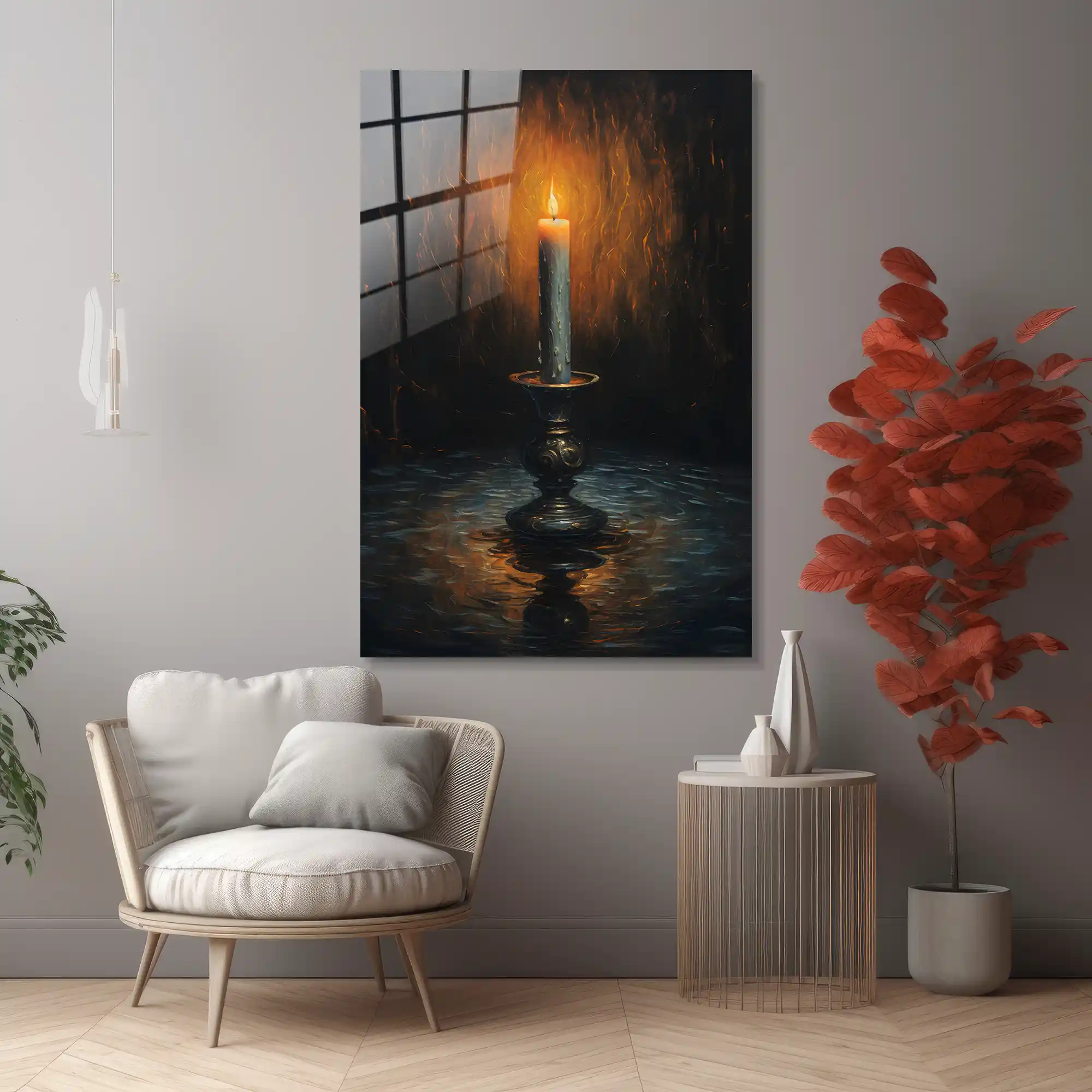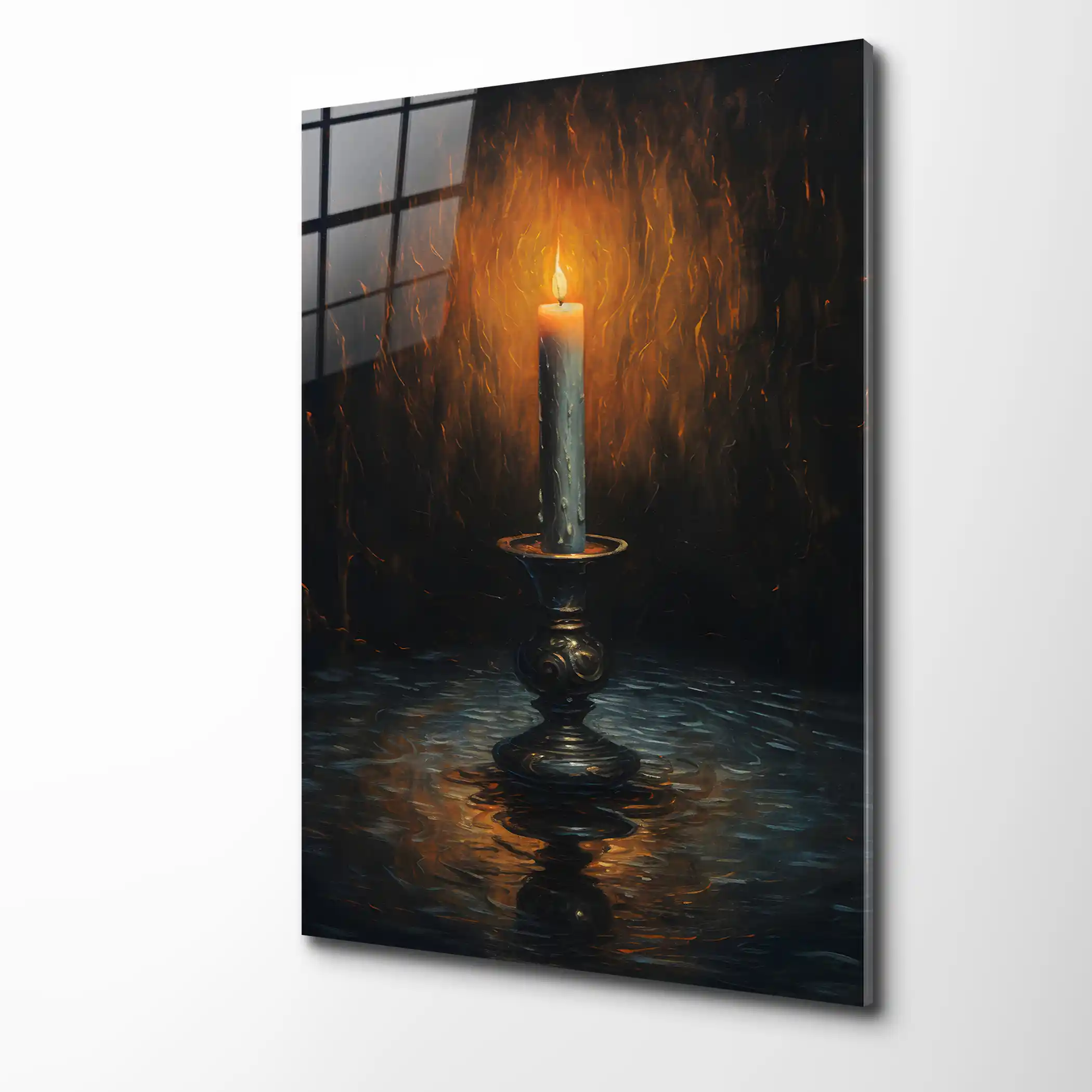 Günün yorgunluğu geride kalırken, ruhunuzu dinlendirecek o loş ve sıcak parıltı… Bu özel eser, antik bir şamdan üzerinde ağır ağır yanan bir mumun etrafına yaydığı mistik ışığı ve yarattığı yumuşak gölgeleri resmediyor. “Sessizliğin ışığı” temasını klasik bir estetikle harmanlayan bu tasarım, mekanınıza meditatif bir huzur ve barok bir zarafet katar. Camın yansıtıcı yüzeyi, alevin altın sarısı tonlarını daha da belirginleştirerek sanki odanızda gerçek bir mum yanıyormuşçasına derin bir atmosfer yaratır. Bu tablo, sadece bir duvar sanatı değil; içsel bir yolculuğa ve zamansız bir dinginliğe adanmış sanatsal bir dokunuştur.