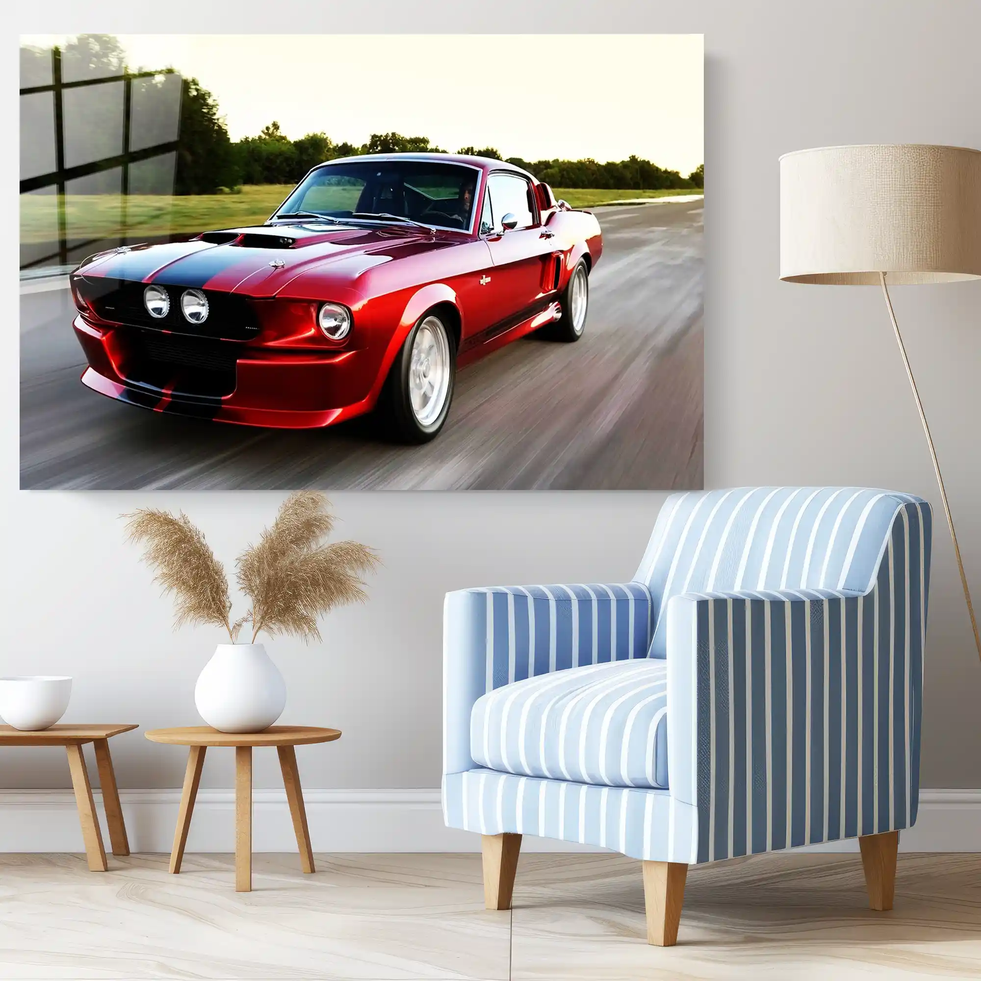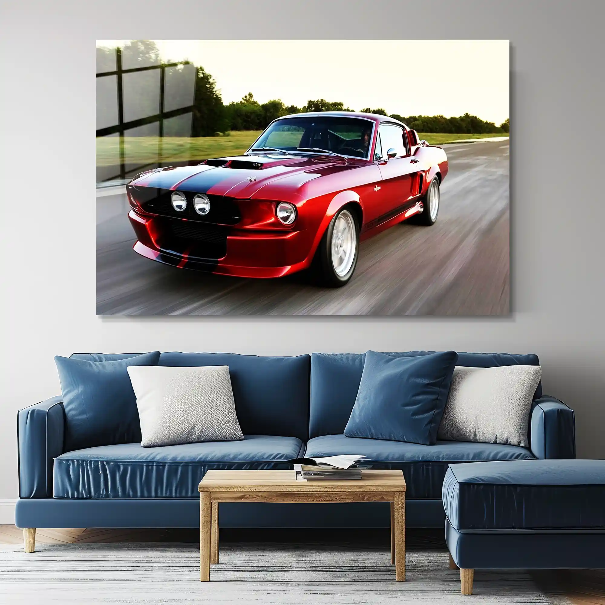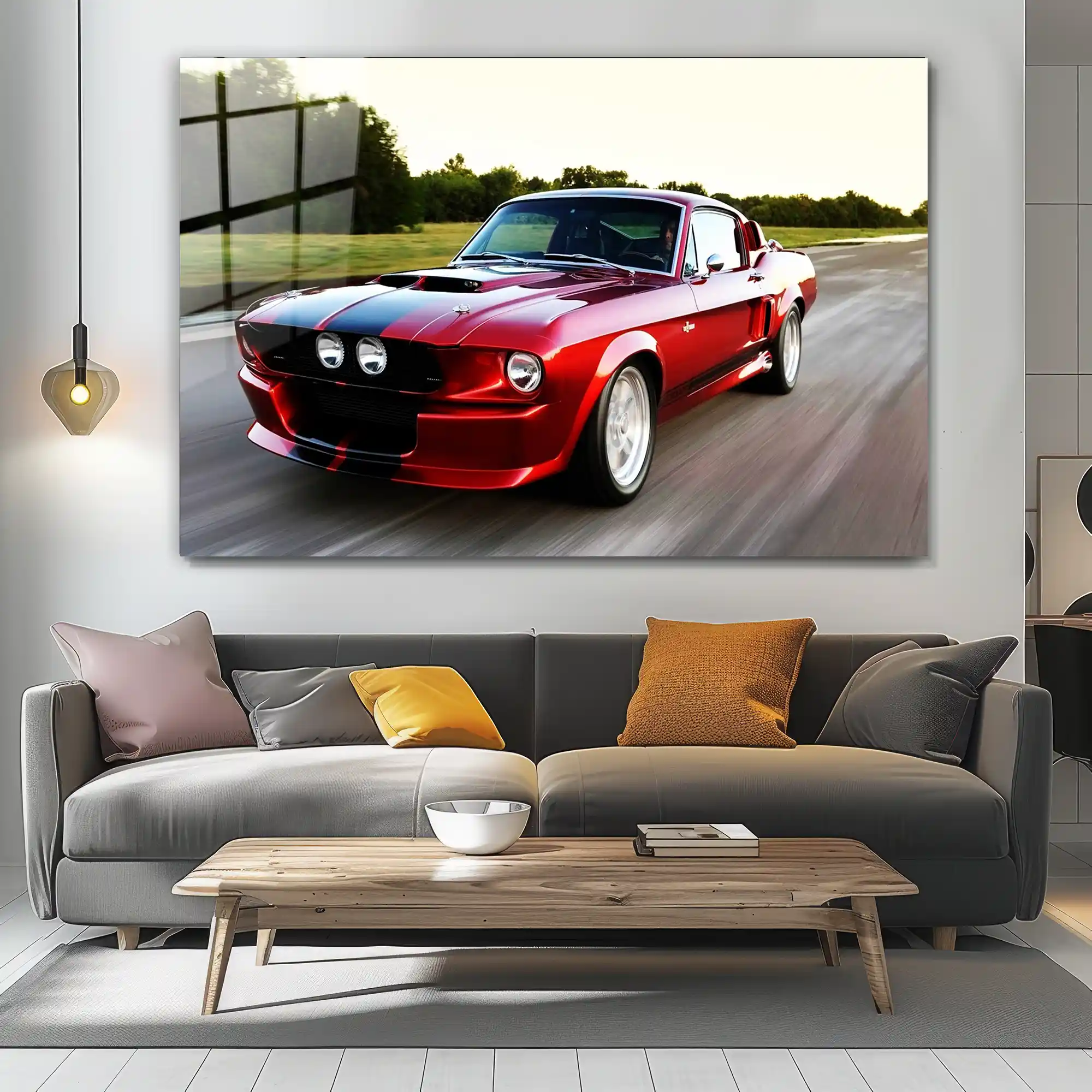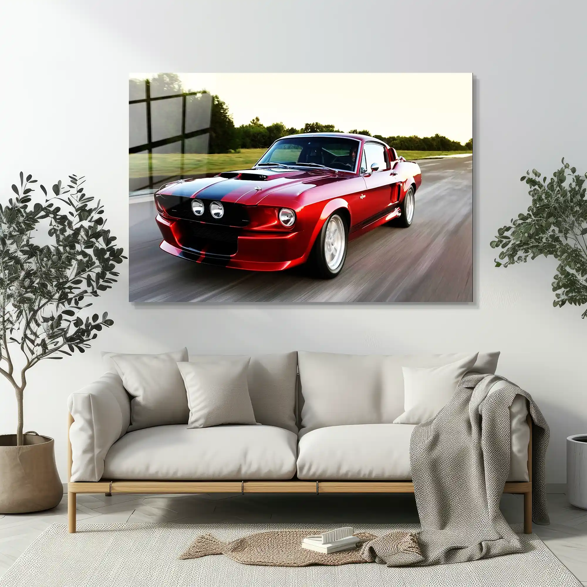 Aracın göz alıcı parlak kırmızı gövdesi ve üzerindeki karakteristik siyah yarış şeritleri, hareket halindeki bulanıklık (motion blur) efektiyle birleşerek mekanınıza müthiş bir enerji katıyor. Her detayıyla bir efsaneyi yansıtan bu eser, sadece bir otomobil görseli değil; Amerikan mühendisliğinin vahşi gücüne, yarış mirasına ve özgürlüğe adanmış modern bir saygı duruşudur. Camın parlak yüzeyi, kırmızının canlılığını ve otomobilin metalik parıltısını derinleştirerek duvarınızda hem dinamik hem de prestijli bir atmosfer yaratır.