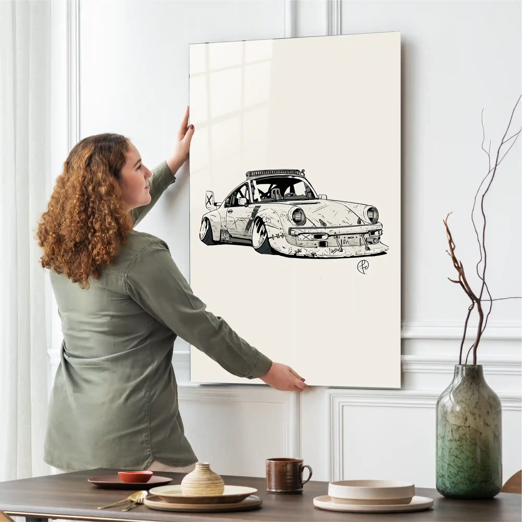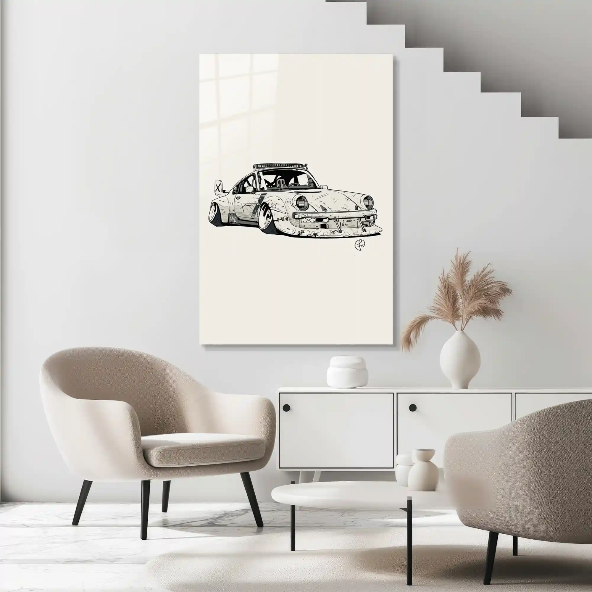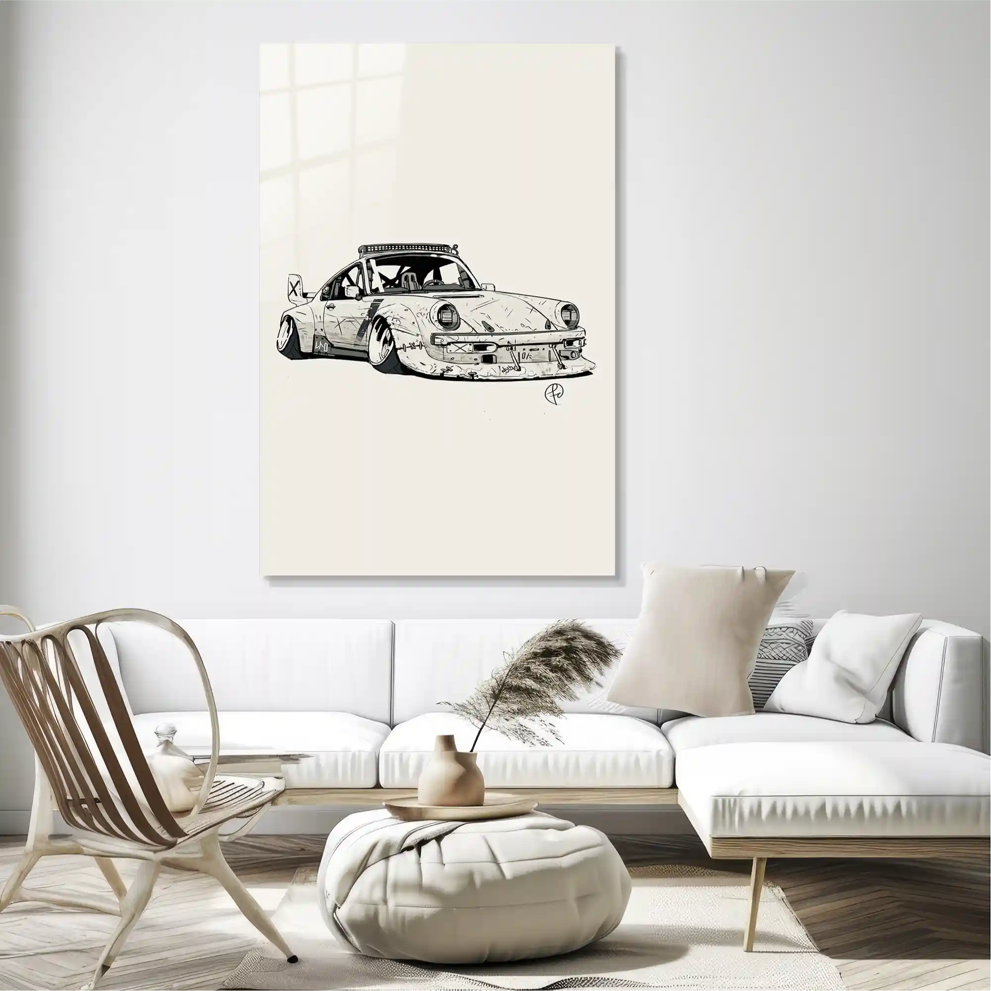 Hızın tutkusu ve mühendisliğin sanata dönüştüğü o an… Bu özel eser, ikonik 911 silüetini sıradan bir fotoğrafın ötesine taşıyarak, onu ham ve vahşi bir eskiz çalışmasıyla yeniden yorumluyor. Aracın genişletilmiş çamurlukları, agresif duruşu ve üzerindeki her bir çizik detayı, garaj kültürünün ve pistlerin tozlu atmosferini evinize getiriyor. Siyah ve beyazın en keskin kontrastıyla hazırlanan bu illüstrasyon, sadece bir otomobil tablosu değil; asfaltın asi ruhuna ve özgürlüğe adanmış modern bir saygı duruşudur. Camın parlak yüzeyi ile eskiz çiziminin mat dokusu arasındaki bu zıtlık, duvarınızda hem endüstriyel hem de sofistike bir atmosfer yaratır.
