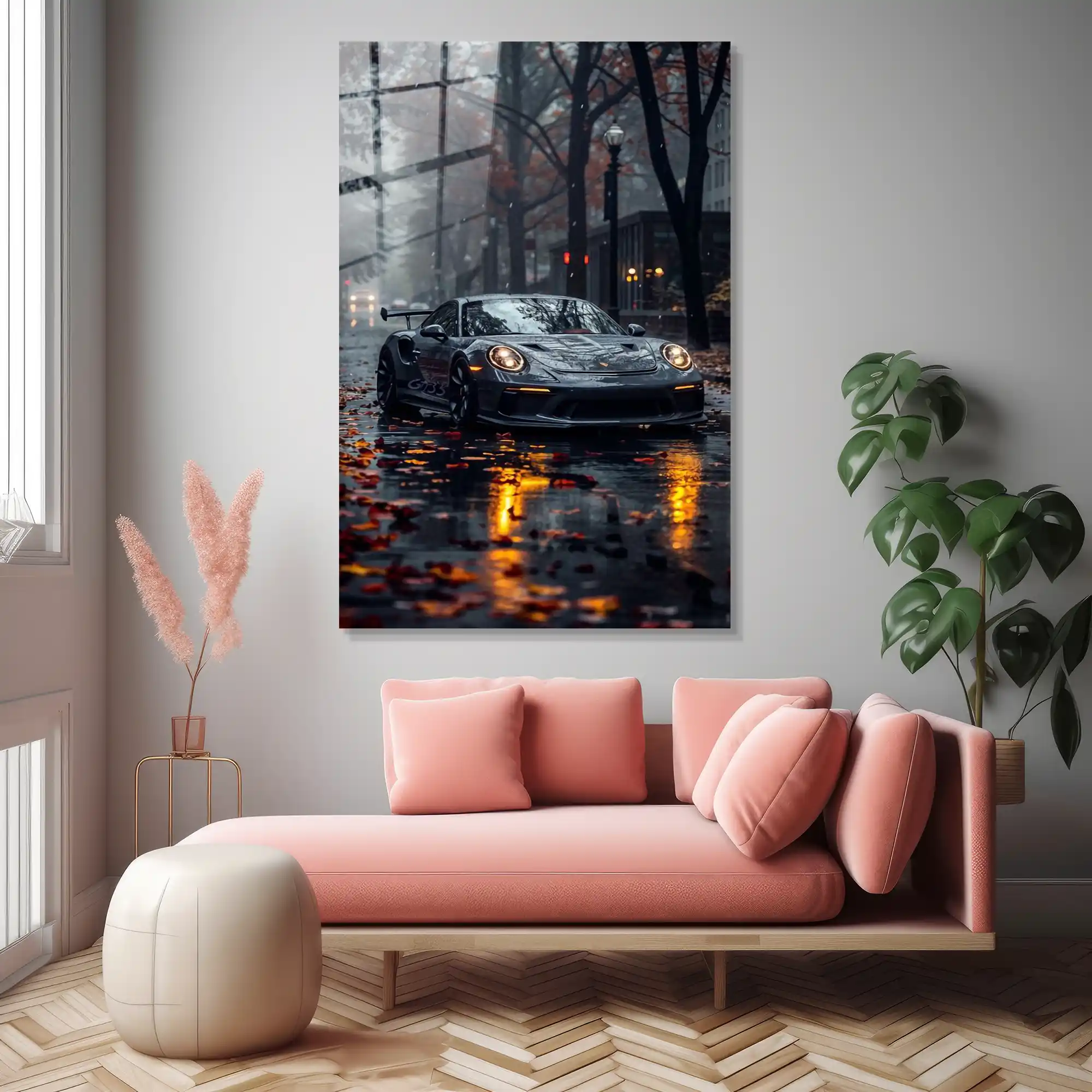 Pistlerin gürültüsünden uzak, sonbahar yapraklarının döküldüğü ve yağmurun ritim tuttuğu o an… Bu özel cam tablo, Porsche GT serisinin efsanevi silüetini, melankolik ama güçlü bir atmosferde ölümsüzleştiriyor.