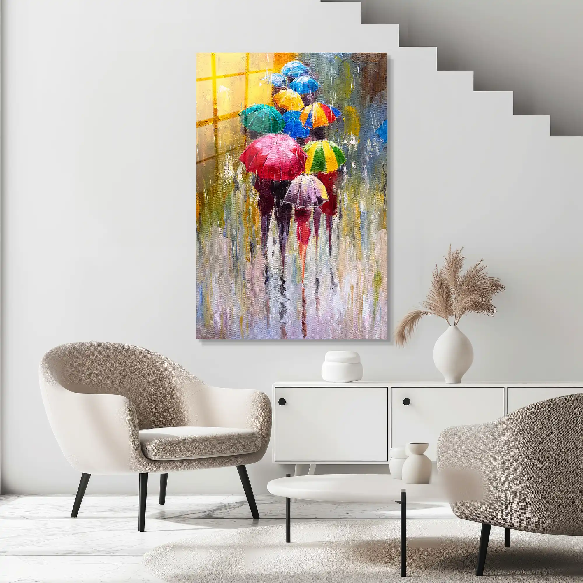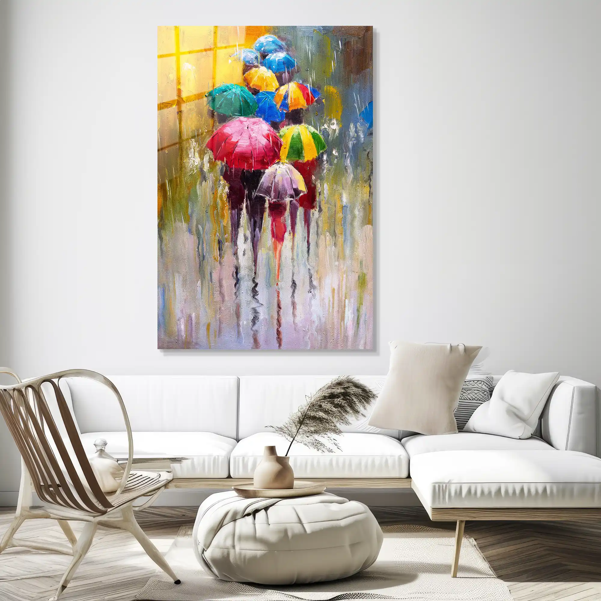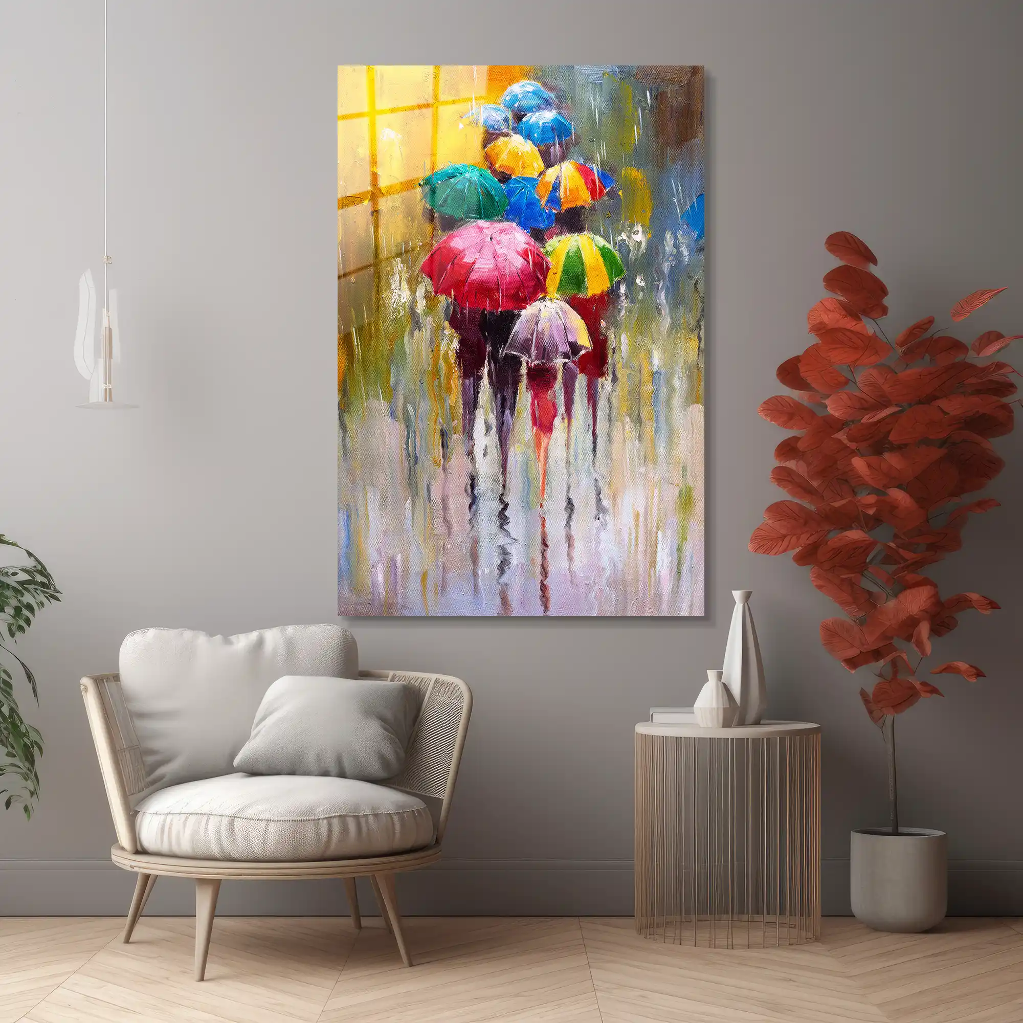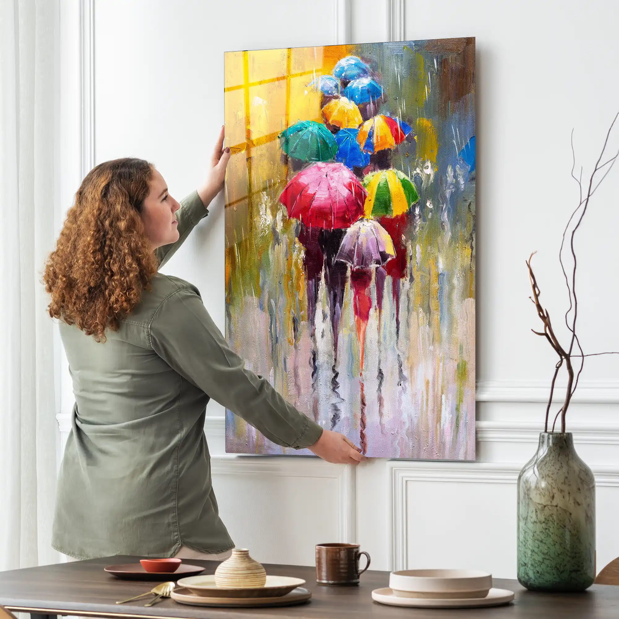 Gri gökyüzünün altında filizlenen canlı renklerin dansı… Bu özel eser, yağmurlu bir günde şemsiyeleriyle sokağa çıkan insanların yarattığı görsel ritmi, klasik yağlı boya tekniğinin tüm sıcaklığıyla yeniden yorumluyor. Fırça darbelerindeki doku hissi, suyun yansıması ve şemsiyelerden süzülen parlak renkler, şehrin melankolik havasını canlı bir sanat şölenine dönüştürüyor. Sadece bir dekorasyon objesi değil; yağmurun huzuruna, sokağın devinimine ve renklerin iyileştirici gücüne adanmış sanatsal bir saygı duruşudur. Camın kristal parlaklığı, yağlı boya efektinin derinliğini her açıdan canlandırarak duvarınızda adeta ıslak bir tuval estetiği yaratır.