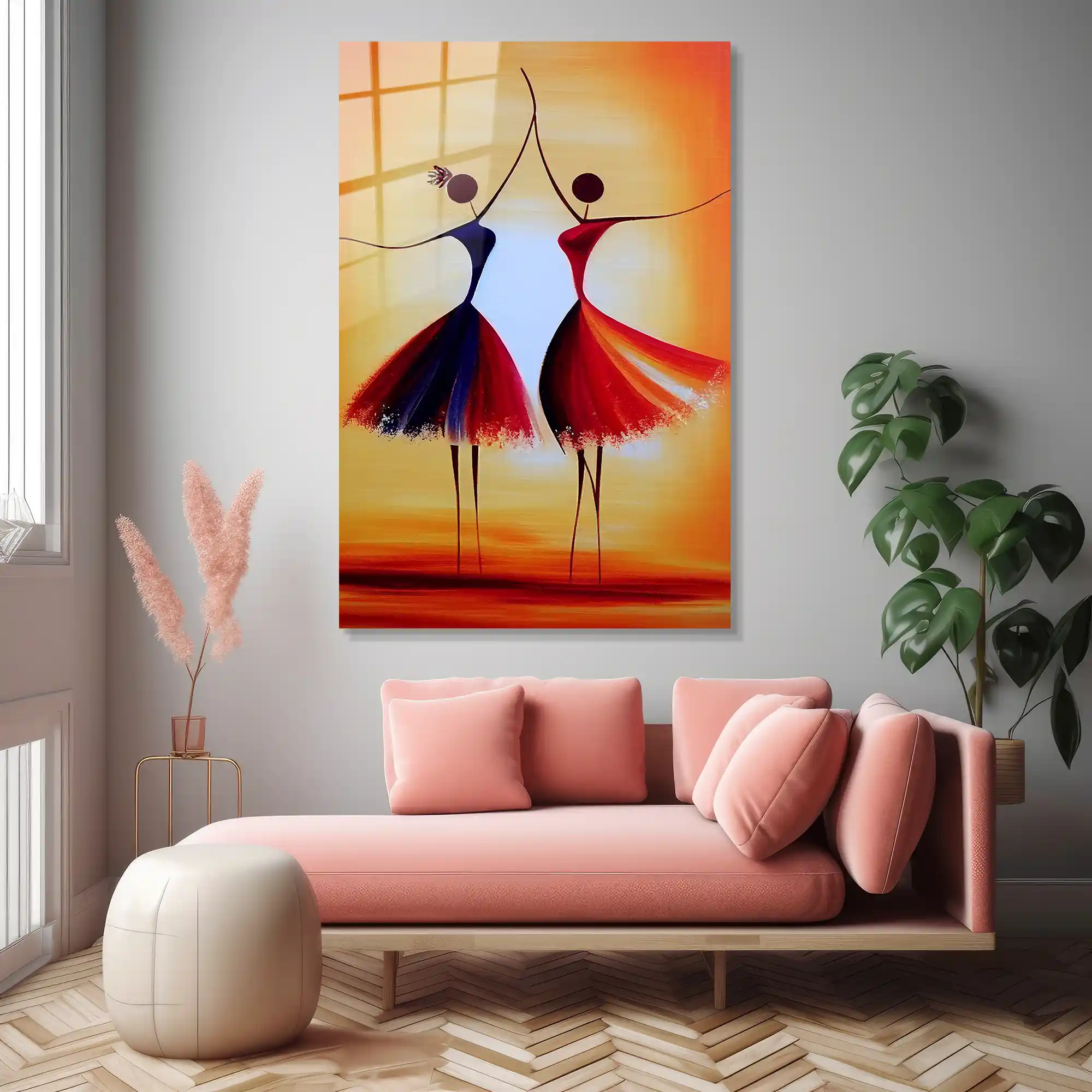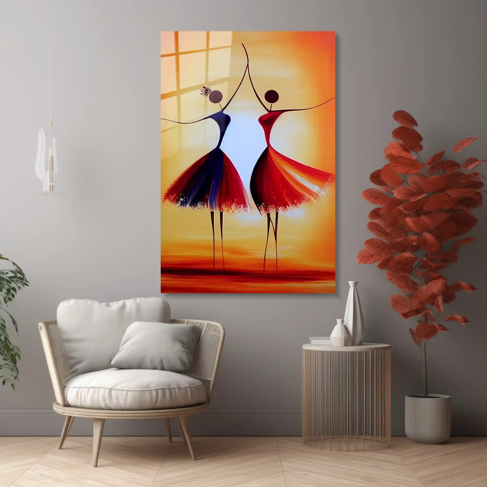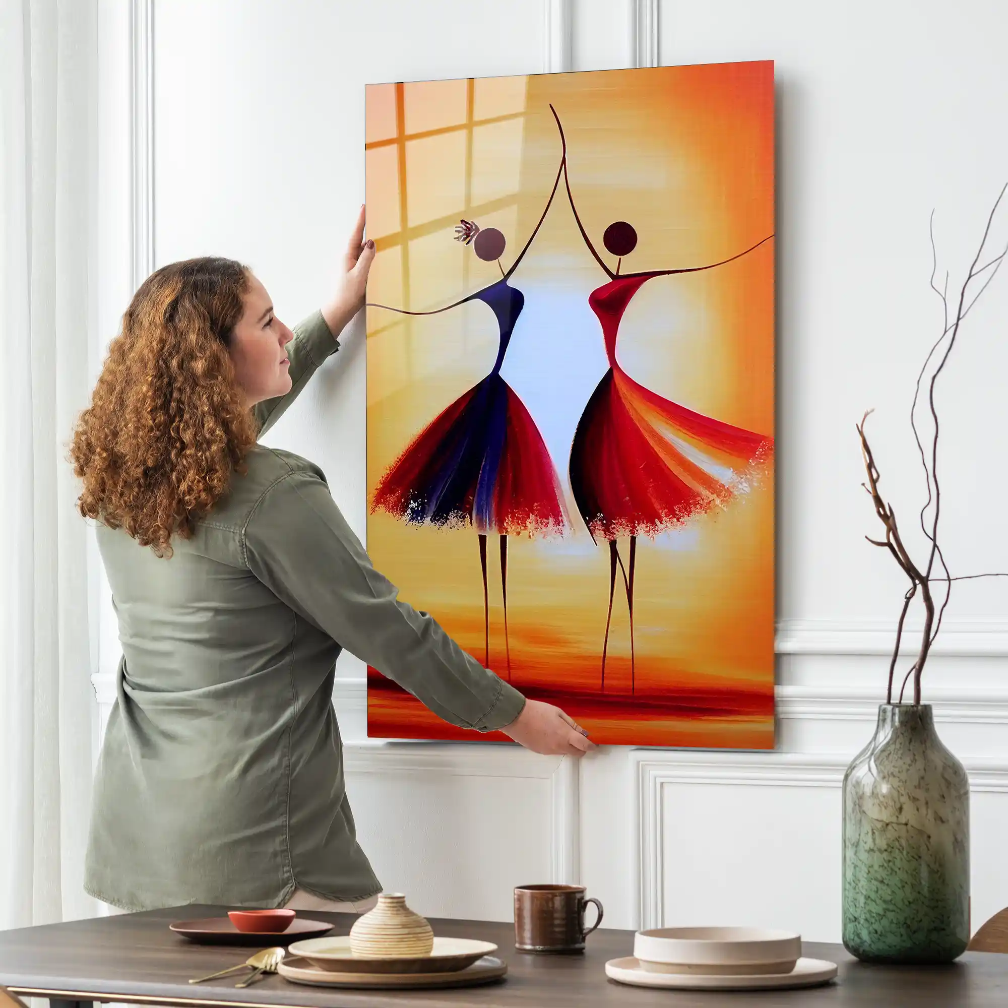 Güneşin en sıcak tonlarının sanatsal bir ritme dönüştüğü o an… Bu özel eser, biri derin maviyi diğeri ise tutkulu kırmızıyı temsil eden iki zarif dansçı figürünü, adeta bir gün batımının huzur verici ışığında resmediyor. Minimalist hatlar ve akışkan formlarla şekillenen bu figürler, özgürlüğü ve kadın zarafetini duvarınıza taşıyor. Camın pürüzsüz ve parlak dokusu, arkadaki sıcak turuncu geçişlerin derinliğini artırarak mekanınızda hem modern hem de enerjik bir atmosfer yaratır. Bu tablo, sadece bir dekorasyon öğesi değil; her fırça darbesinde yaşamın coşkusunu ve dansın estetiğini hissettiren sanatsal bir saygı duruşudur.