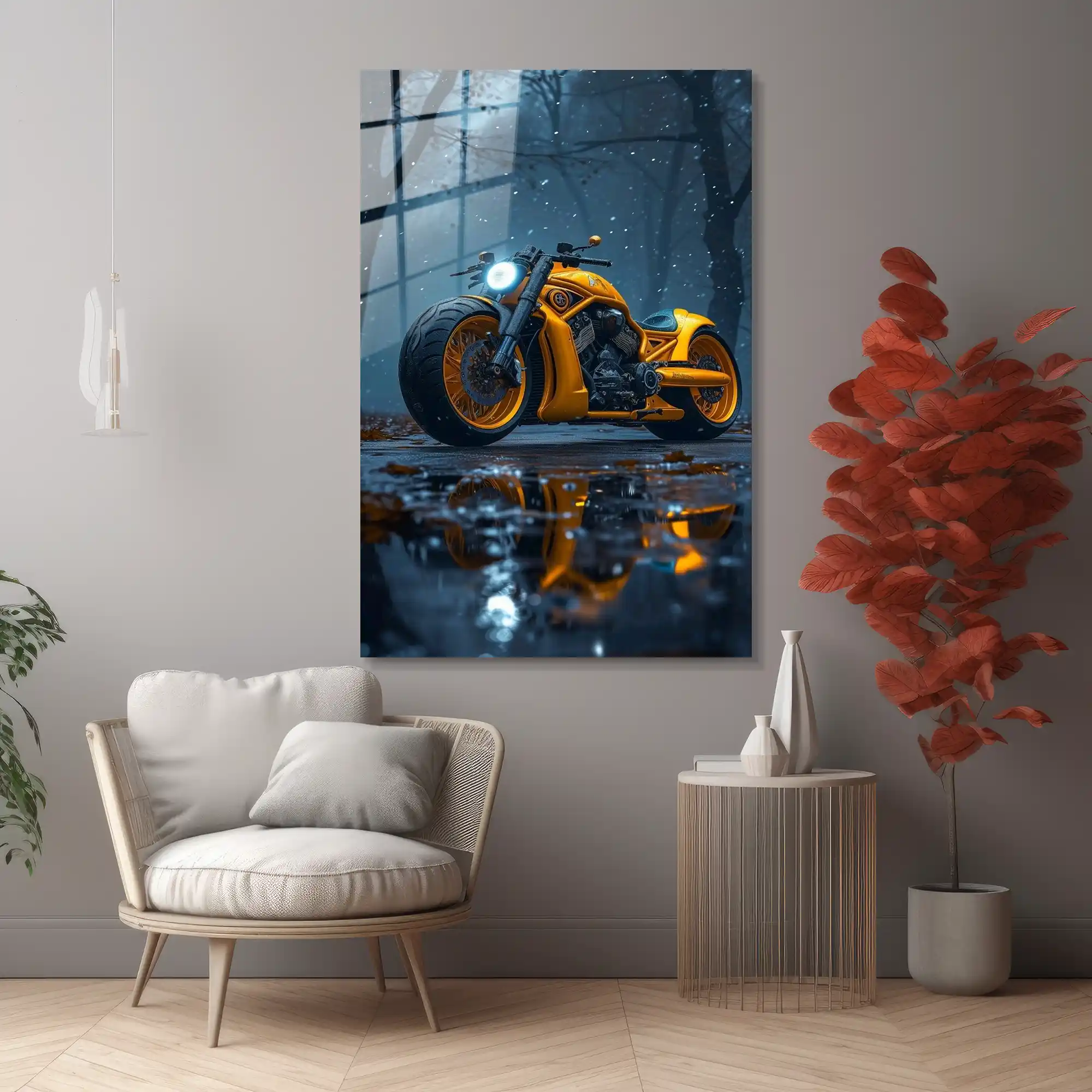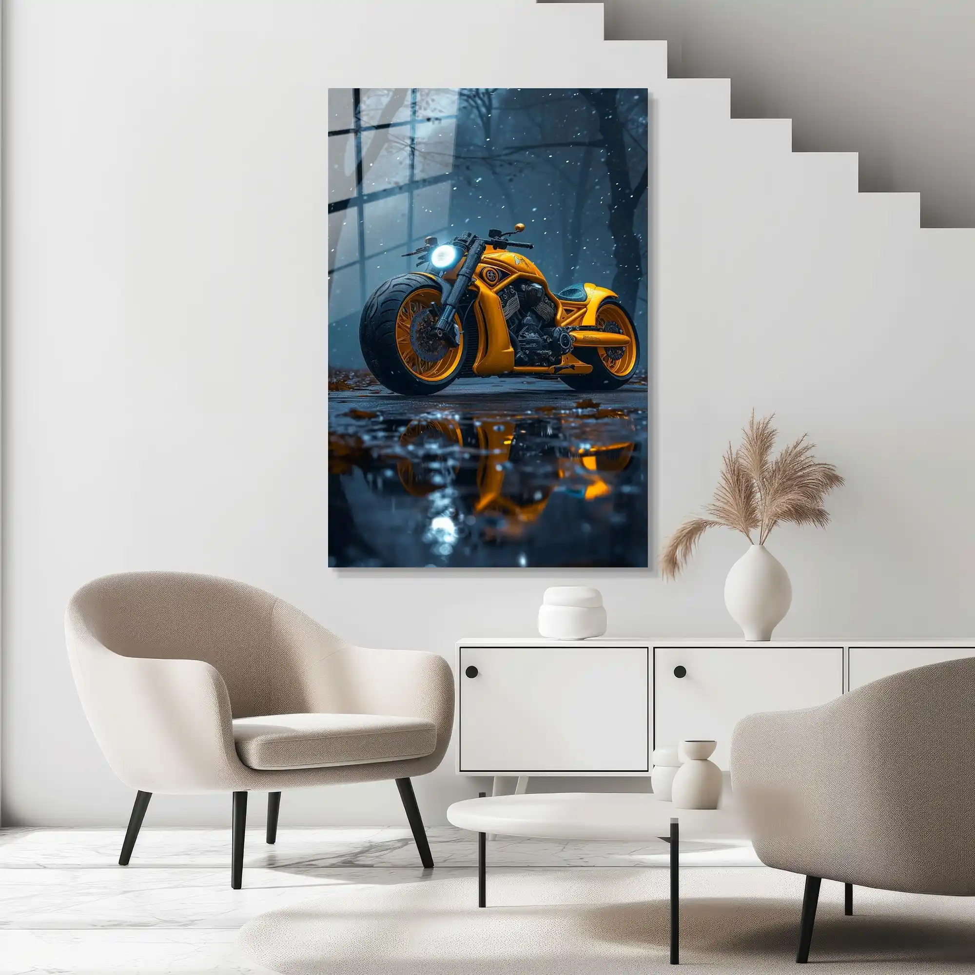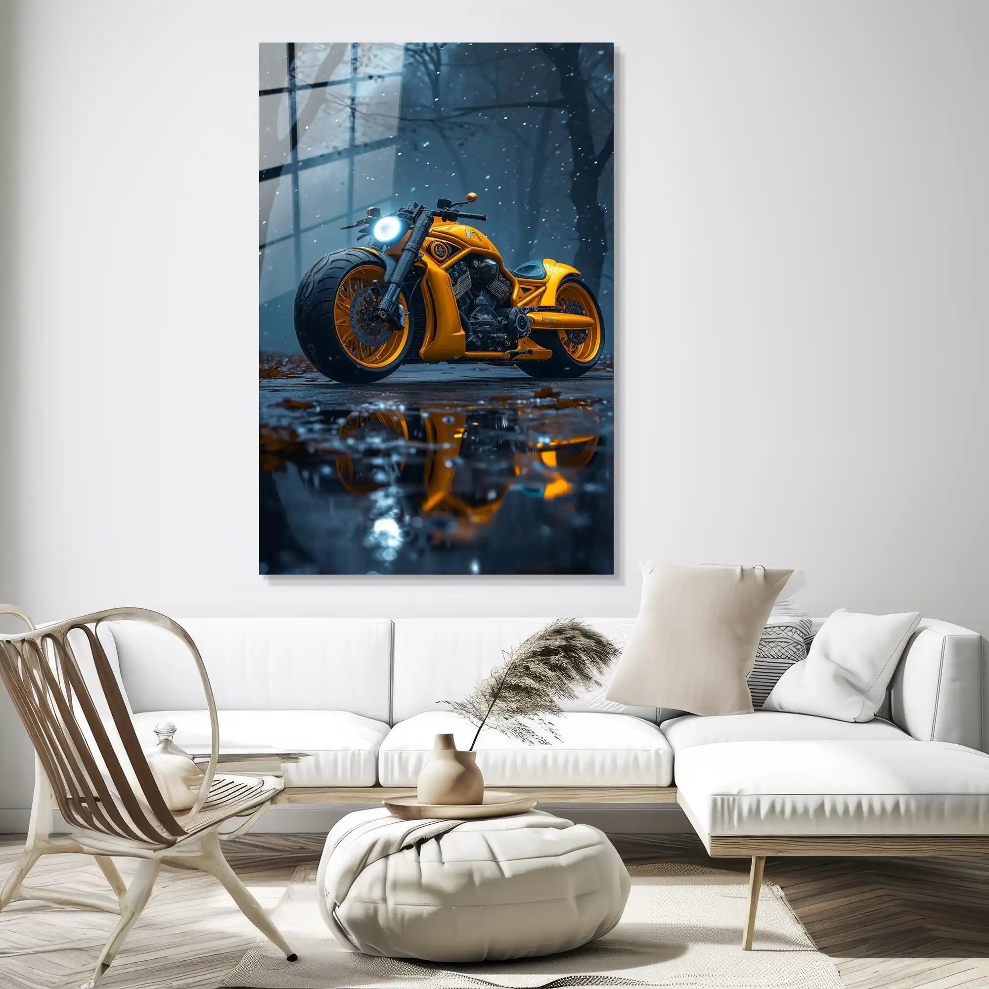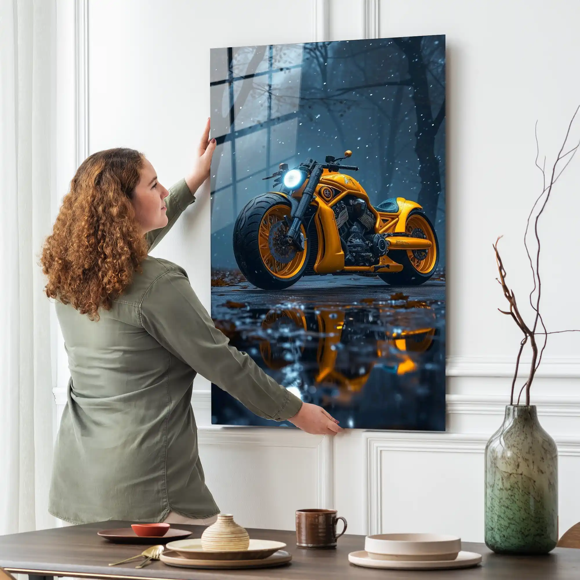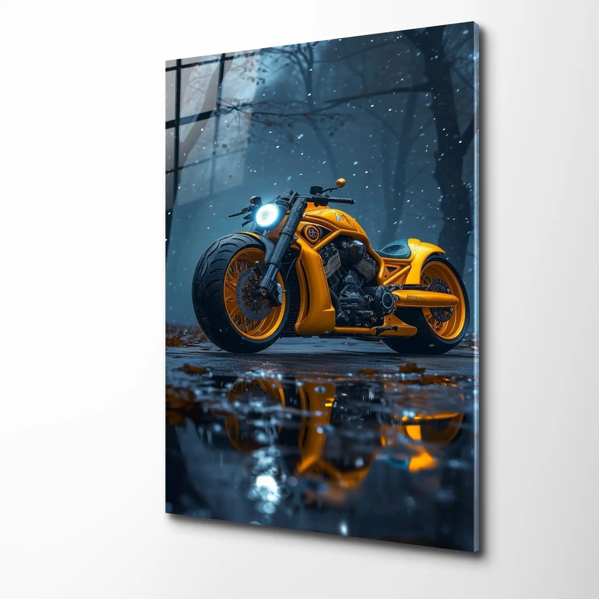 Motosikletin kaslı gövdesi, kalın lastikleri ve krom detayları, kar/yağmur altında ıslanmış karanlık zeminde yansıyarak makinenin gücünü ikiye katlıyor. Ön farından yayılan keskin beyaz ışık, puslu havayı delerken, yerdeki su birikintisindeki ayna benzeri yansıma, sahneye sinematik bir derinlik katıyor. Bu eser, sadece bir motor tablosu değil; özgürlüğe, yola, zorlu koşullara karşı çıkan iradeye ve custom tasarımın benzersiz estetiğine adanmış, çarpıcı bir saygı duruşudur. Camın parlak yüzeyi, bu zıtlığı ve ışık oyunlarını evinize taşıyarak dinamik ve güçlü bir atmosfer yaratır.