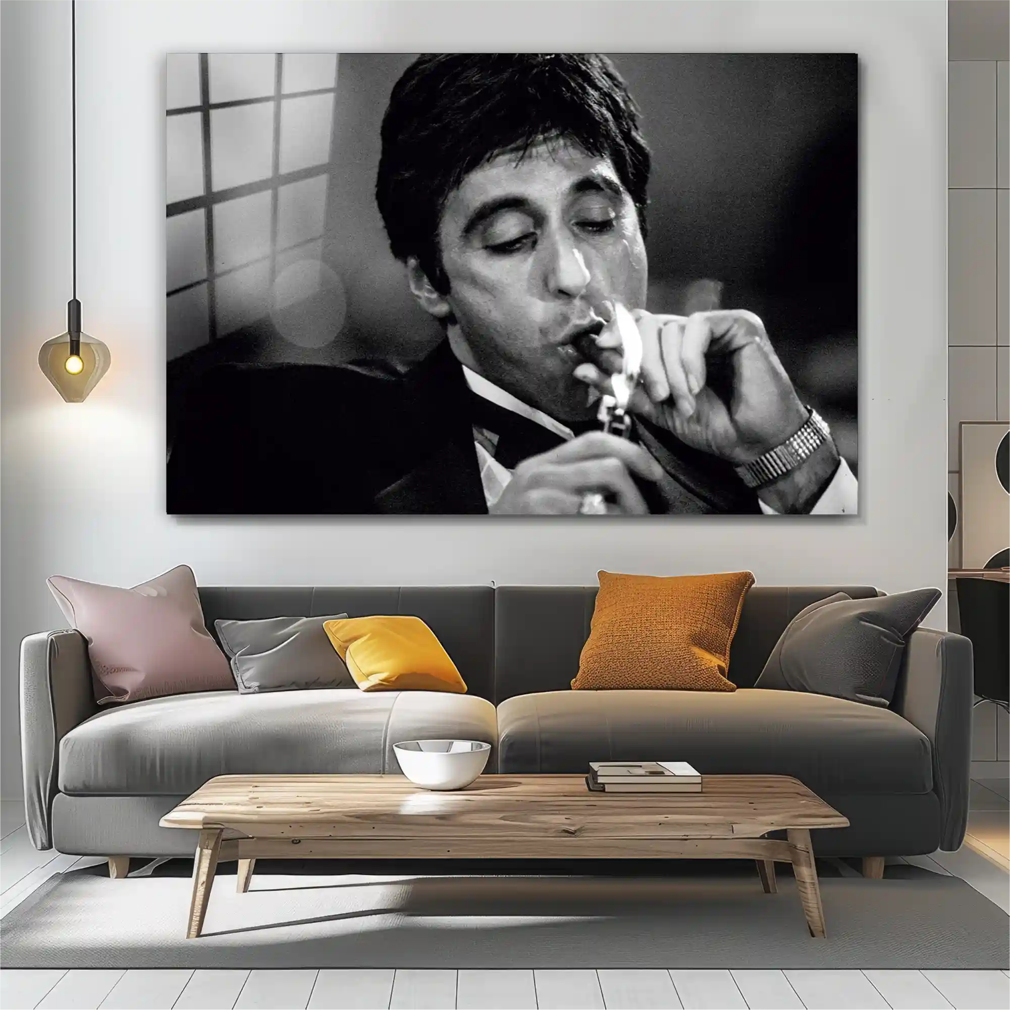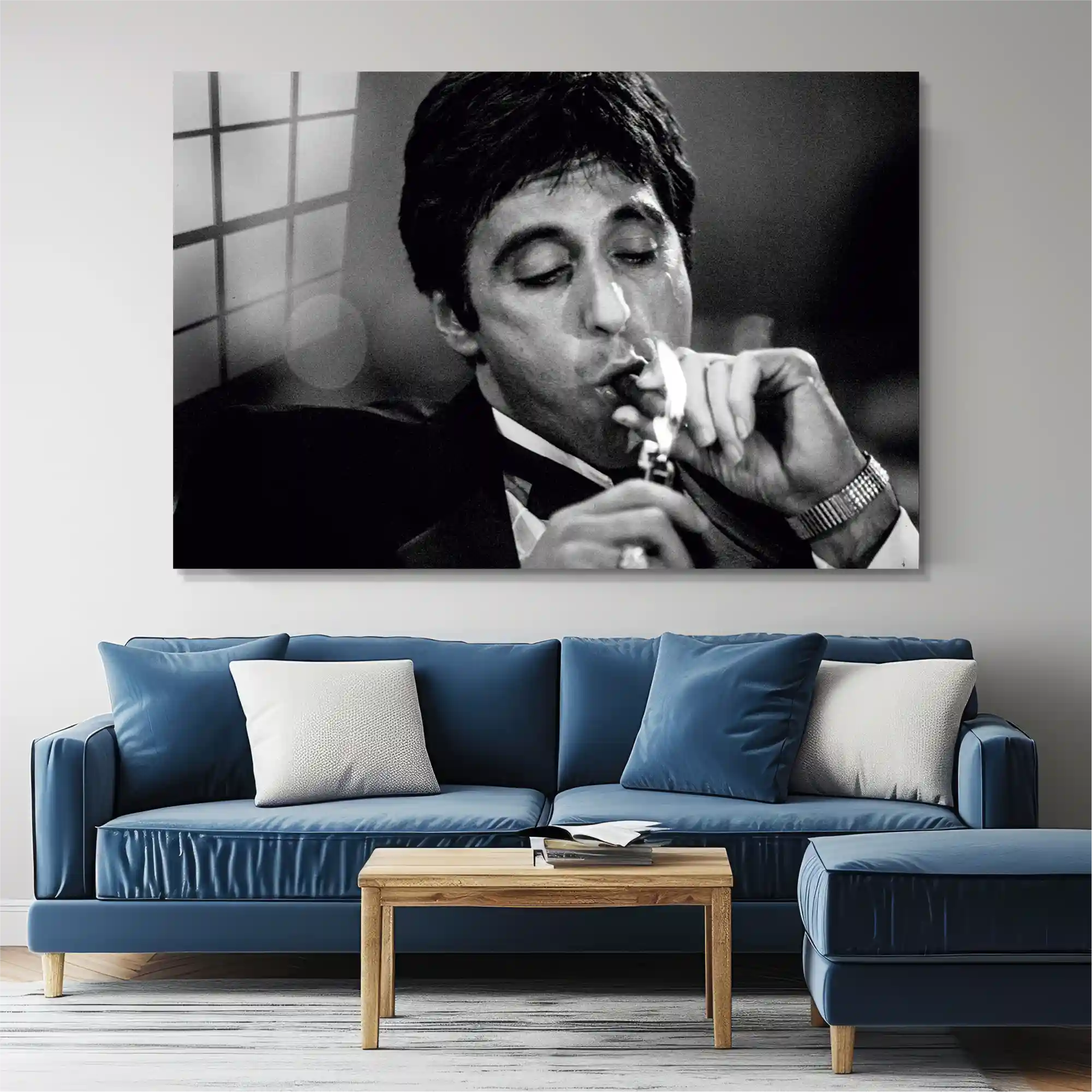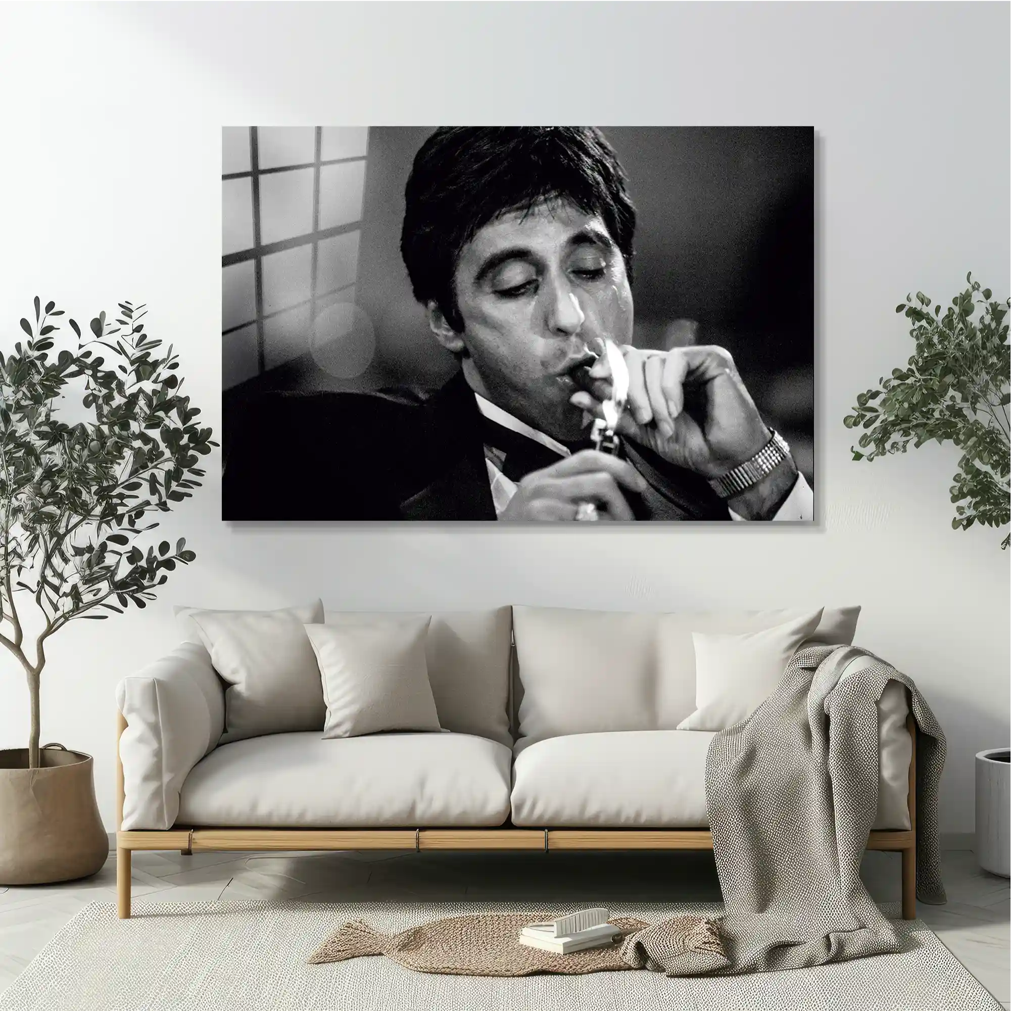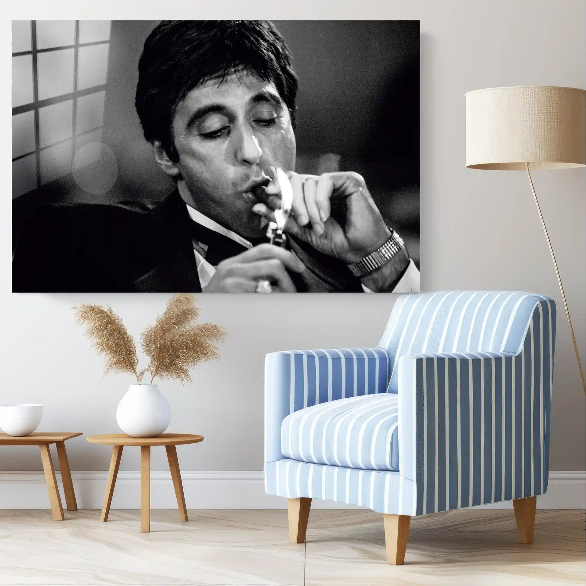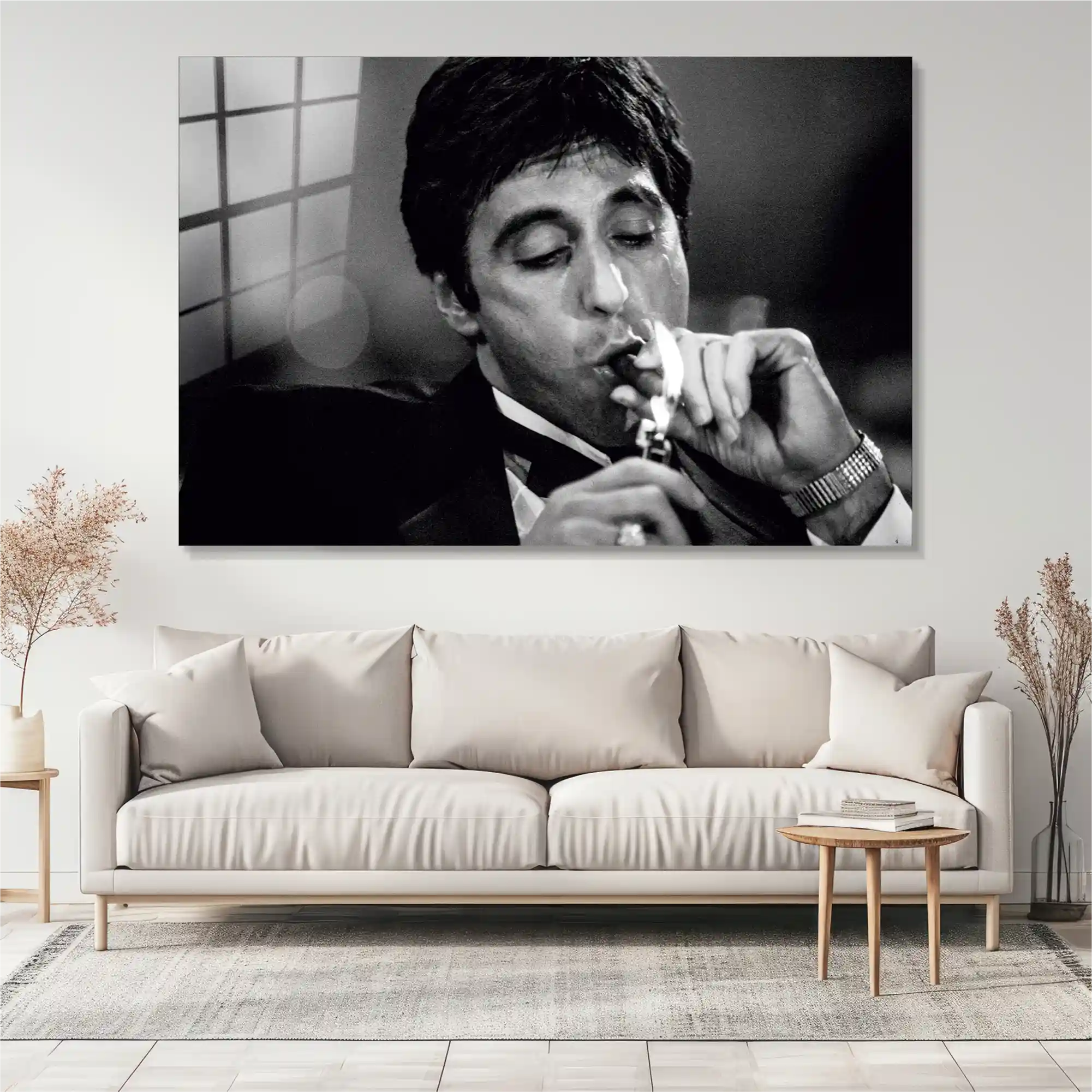 Hırsın, gücün ve Amerikan Rüyası’nın bedeli. Bu çarpıcı siyah-beyaz kare, sinema tarihinin en ikonik karakterlerinden Tony Montana’nın yükselişinin ve dramatik sonunun tüm yoğunluğunu tek bir bakışta toplar. Yakılan her sigara, atılan her cesur adımın ve “The World Is Yours” felsefesinin simgesidir. Duvarınızdaki bu tablo, sadece bir film sahnesi değil, aynı zamanda sınır tanımayan arzunun ve kararlılığın ifadesidir. Klasik sinemanın bu zamansız karizmatik ikonunu evinize taşıyın.