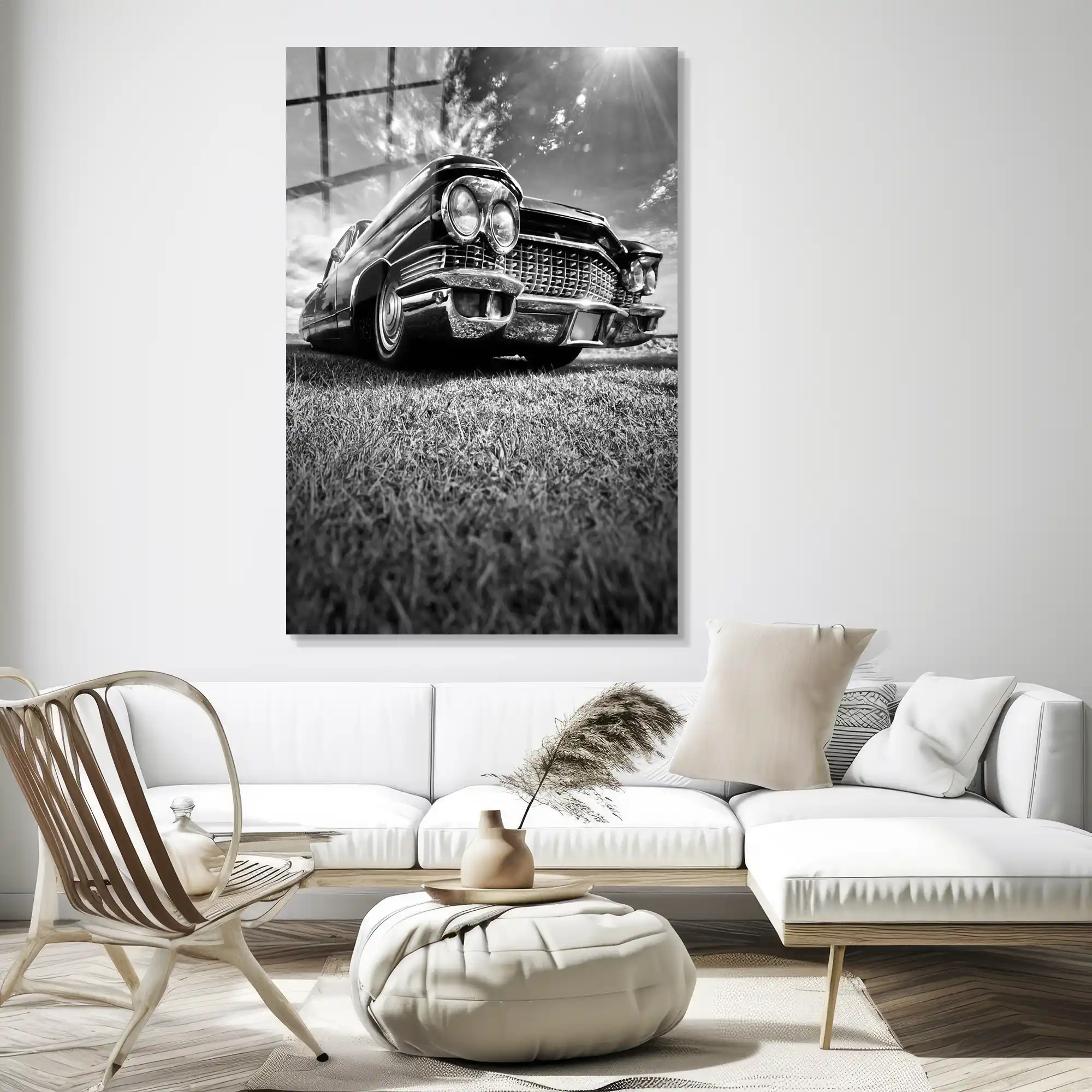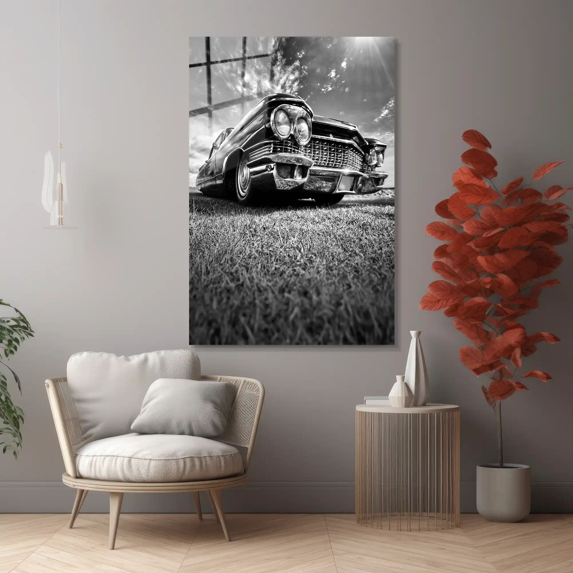 Otomobilin devasa gövdesi, dikkat çekici krom ızgarası ve çiftli farları, çimenli bir zemine yayılarak gücün ve ihtişamın sembolünü oluşturuyor. Güneş ışığının ve dramatik bulutların yarattığı yoğun siyah-beyaz kontrast, fotoğrafın sinematik etkisini artırarak, izleyeni dönemin şık ve özgür ruhuna davet ediyor. Bu eser, sadece bir araba fotoğrafı değil; Amerikan otomotiv tarihine, büyüklüğe, zarafete ve zamansız stilin gücüne adanmış, çarpıcı ve sofistike bir saygı duruşudur. Camın parlak yüzeyi, bu sanatsal kontrastı ve metal detayların ışıltısını evinize taşıyarak klas ve asil bir atmosfer yaratır.