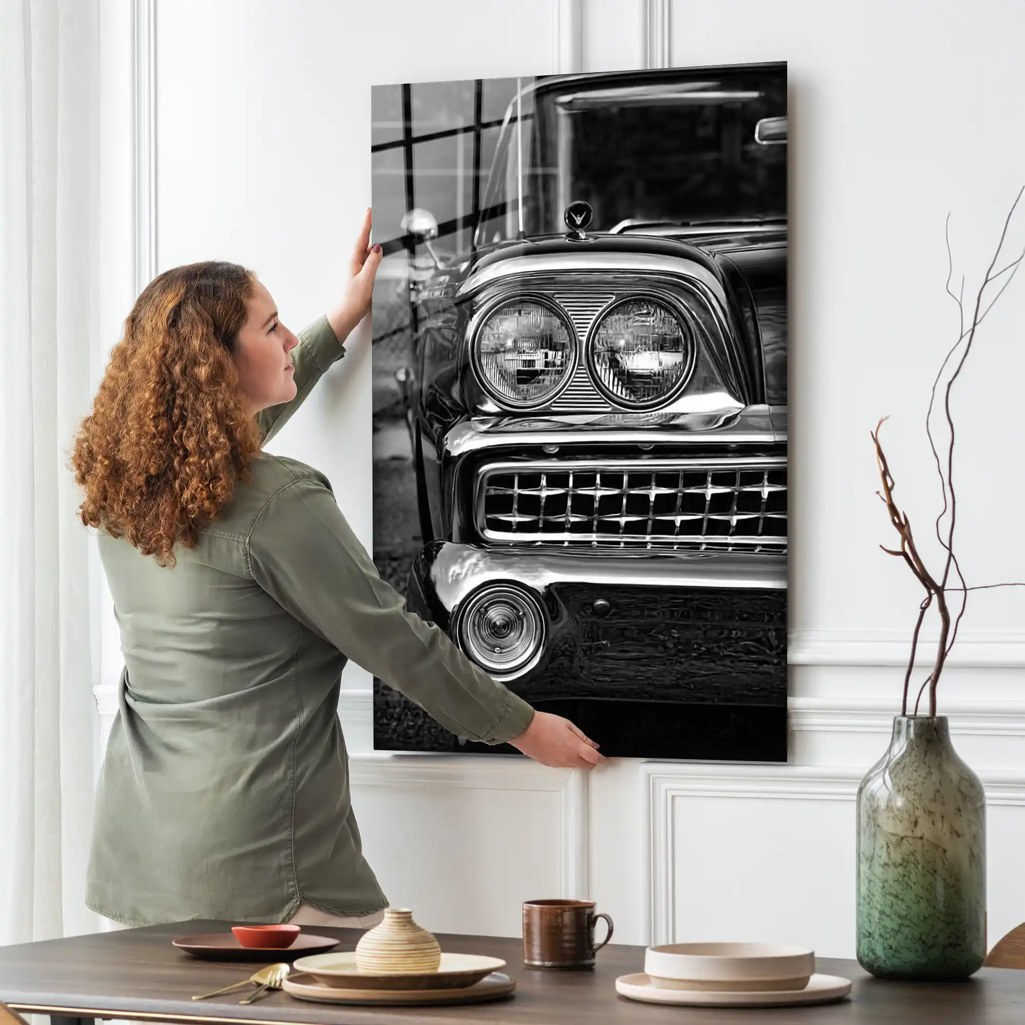 Otomobilin devasa krom ızgarası ve çiftli farları, dönemin lüks anlayışını ve mühendislik cesaretini yansıtırken, siyah beyaz kontrast, fotoğrafın sanatsal ve güçlü duruşunu maksimize ediyor. Kromun parlak yansıması ve gövdenin derin siyah tonları, izleyeni doğrudan o dönemin şık sokaklarına götürüyor. Bu eser, sadece bir araba fotoğrafı değil; Amerikan otomotiv tarihine, vintage tasarıma ve zamansız stilin gücüne adanmış, çarpıcı ve sofistike bir saygı duruşudur. Camın parlak yüzeyi, bu derin siyah-beyaz kontrastı ve krom detayların yansımasını evinize taşıyarak klas ve sanatsal bir atmosfer yaratır.