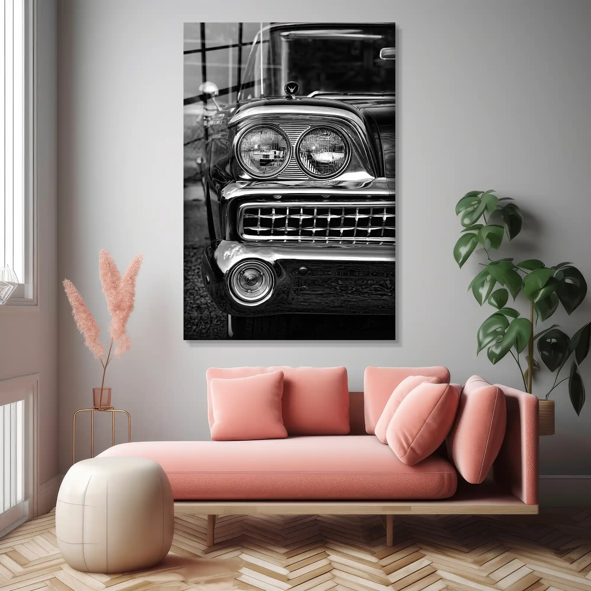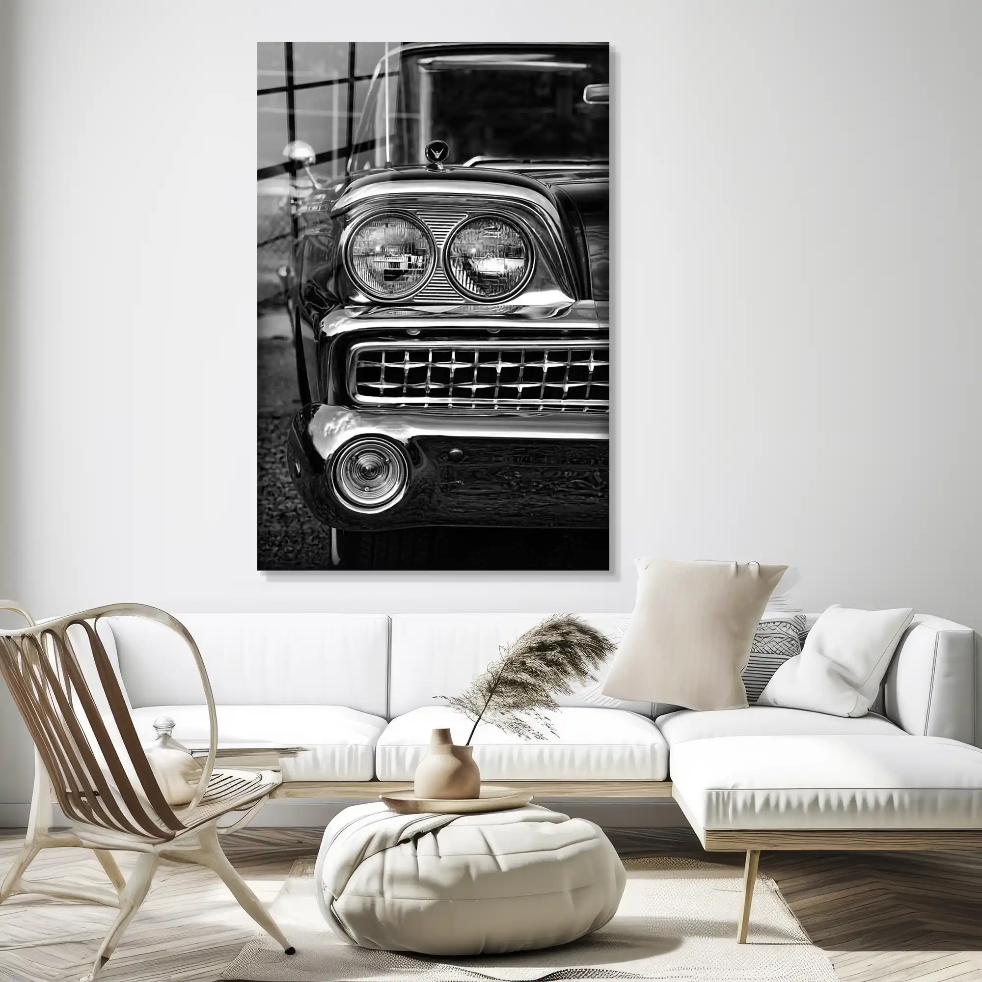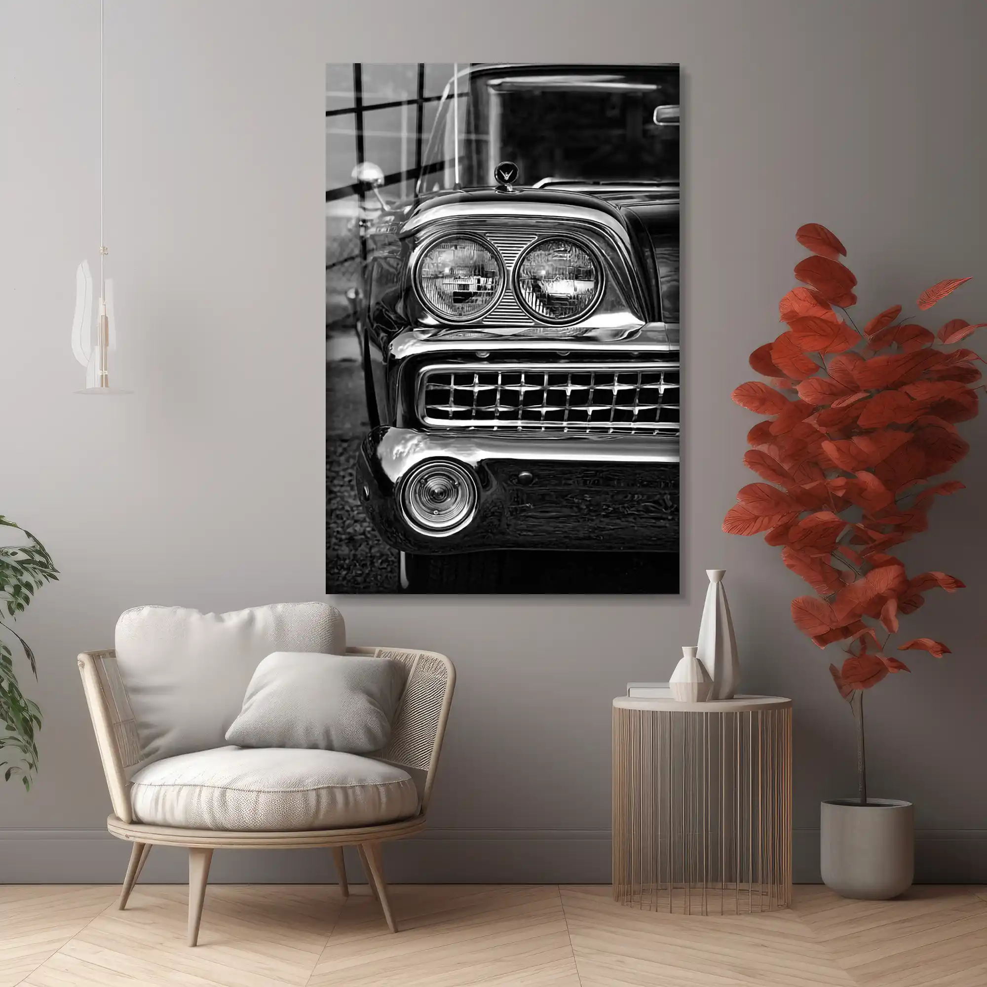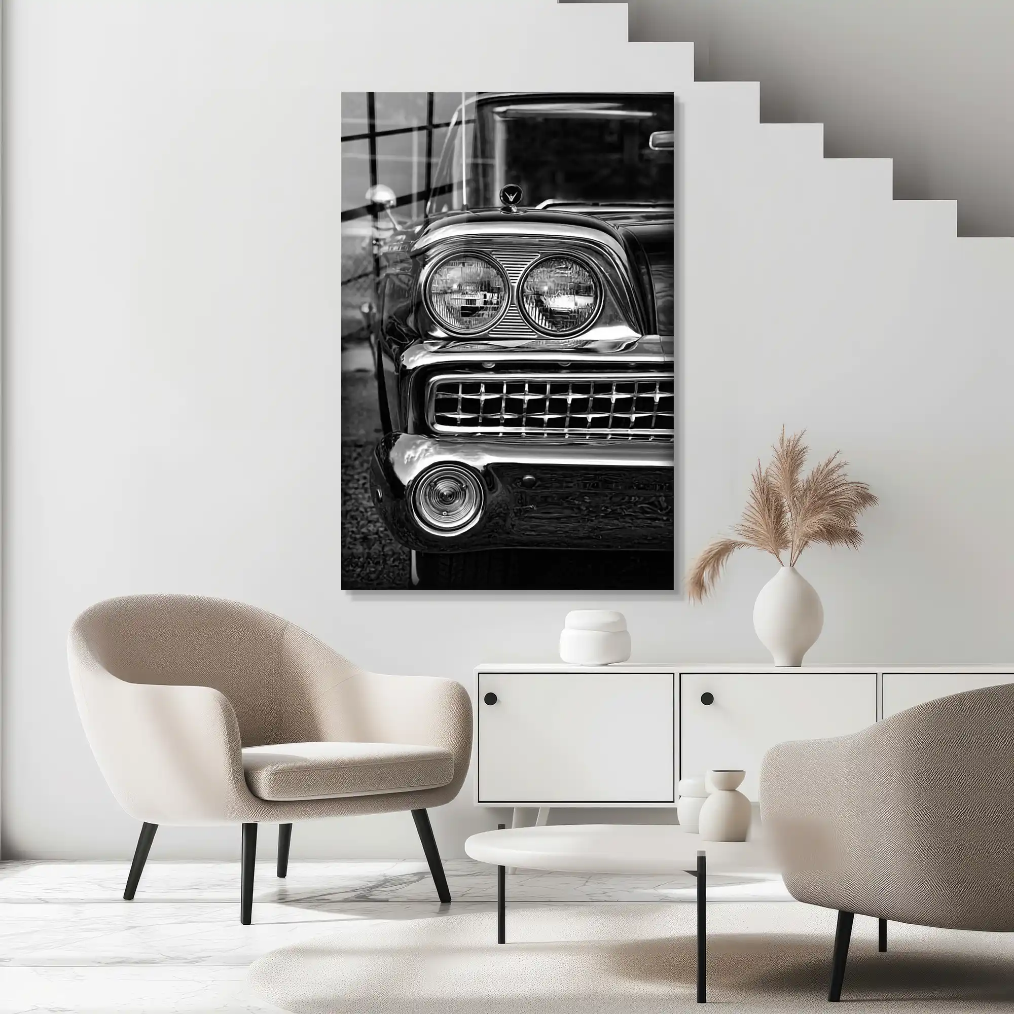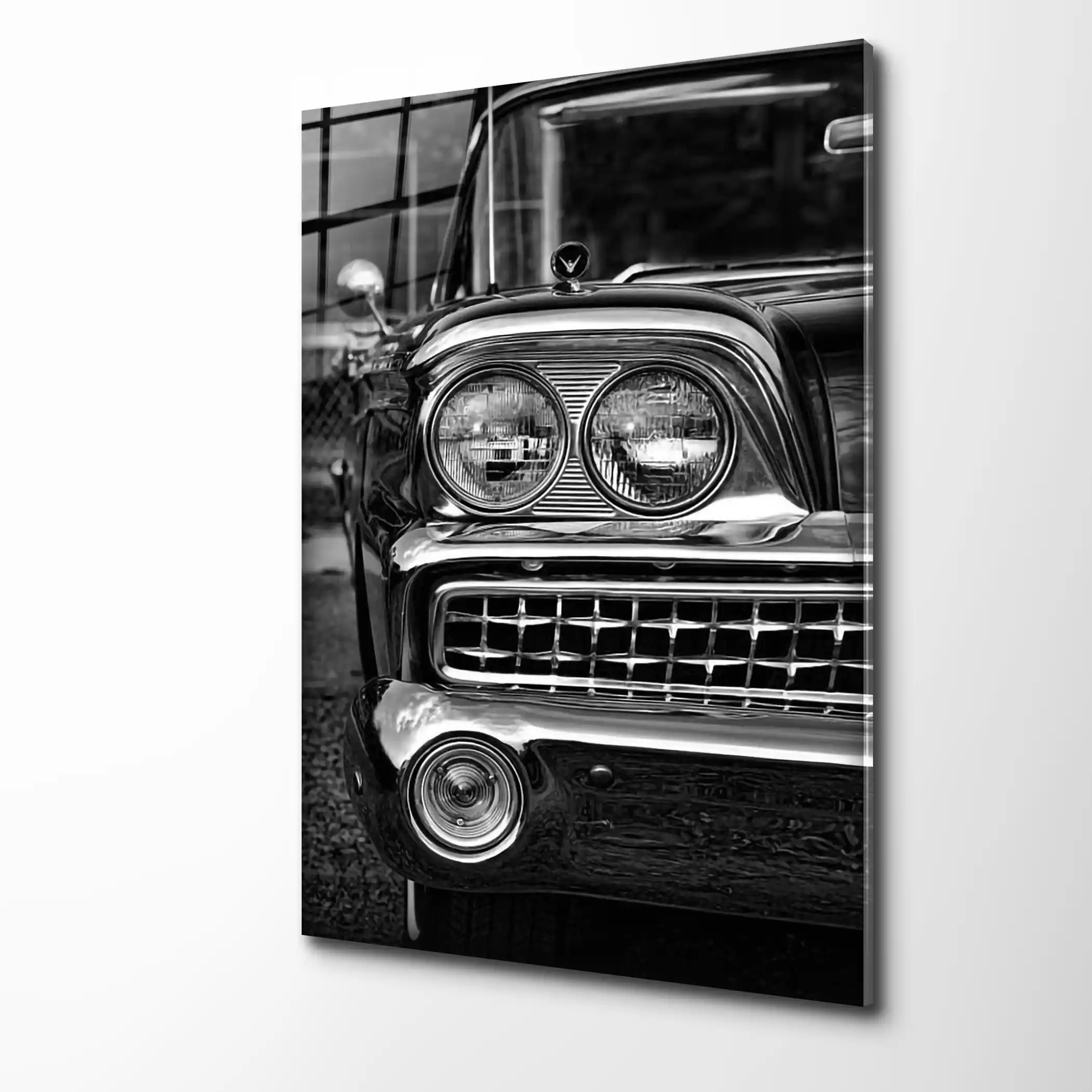 Zamanın durduğu, hız ve estetiğin krom ve farlarda buluştuğu o sinematik an… Bu özel cam tablo, 60’lı yılların efsanevi klasik Amerikan otomobilinin (Impala tarzı) ön cephesini, siyah beyaz bir zarafetle sunuyor.