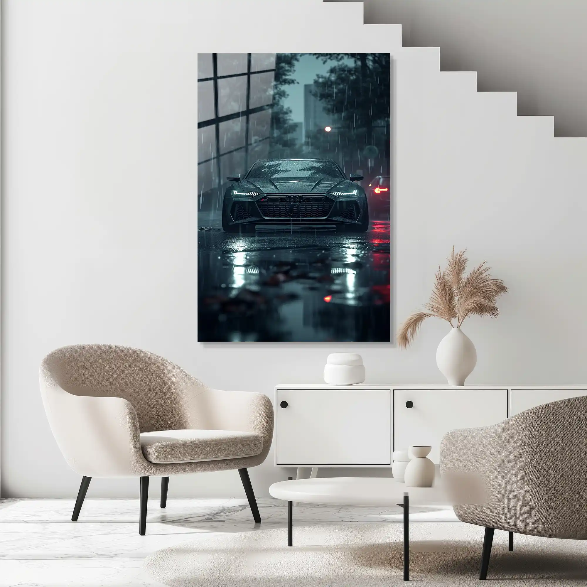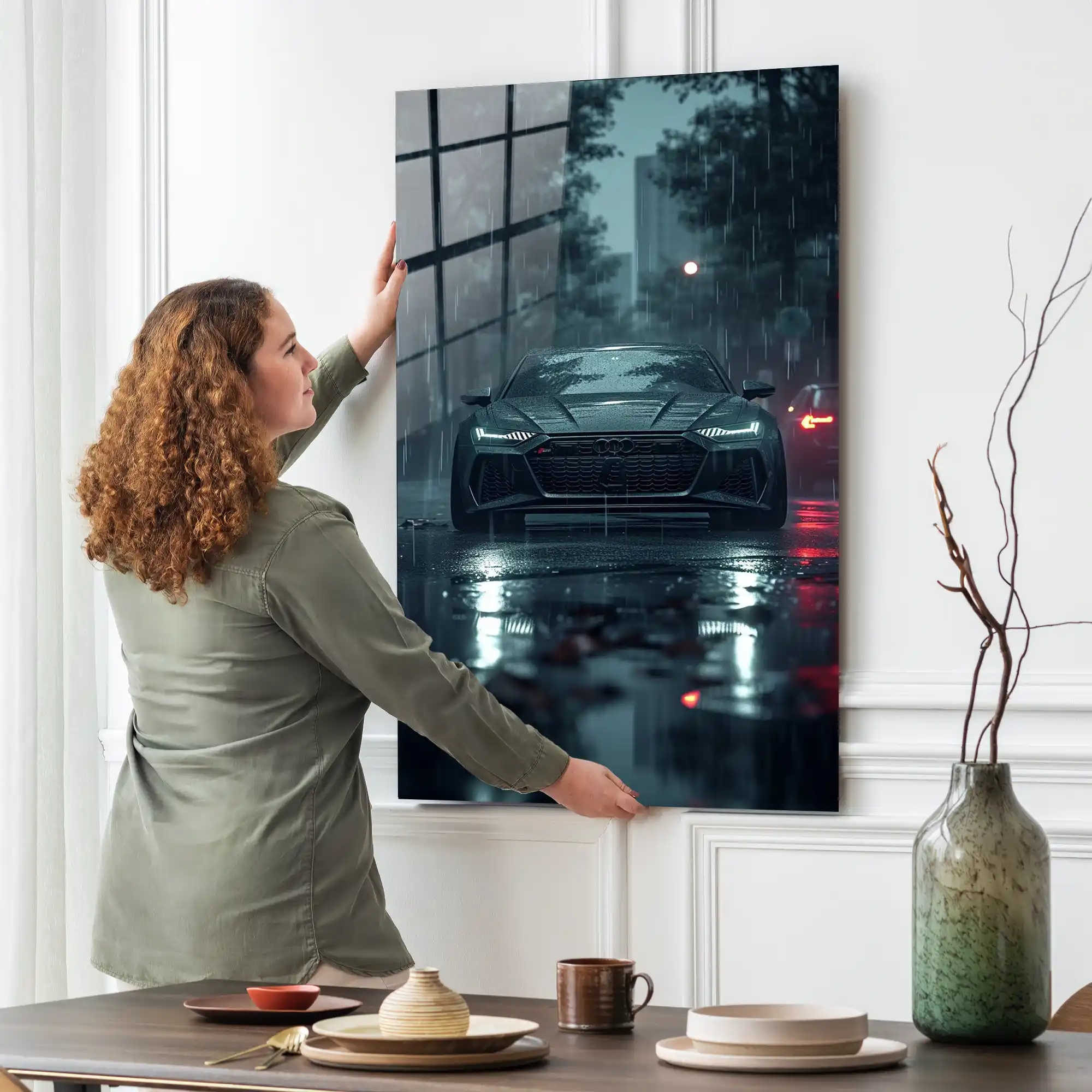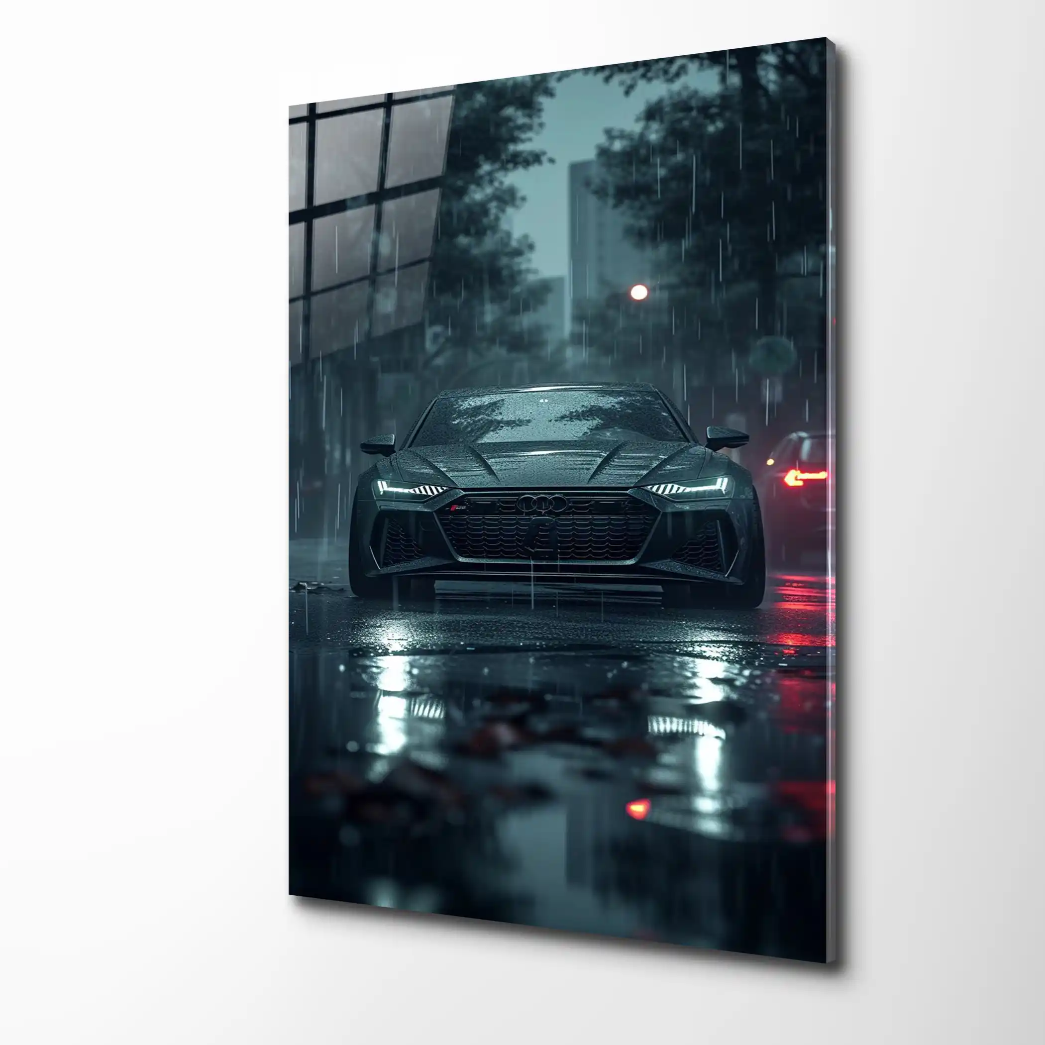 Şehrin karanlık ve ıslak sokaklarında, performansın ve lüksün gizemli buluşması… Bu özel cam tablo, Audi RS modelinin agresif ve keskin hatlarını, yağmurun yarattığı yansımalarla çarpıcı bir sinematik sahneye dönüştürüyor.