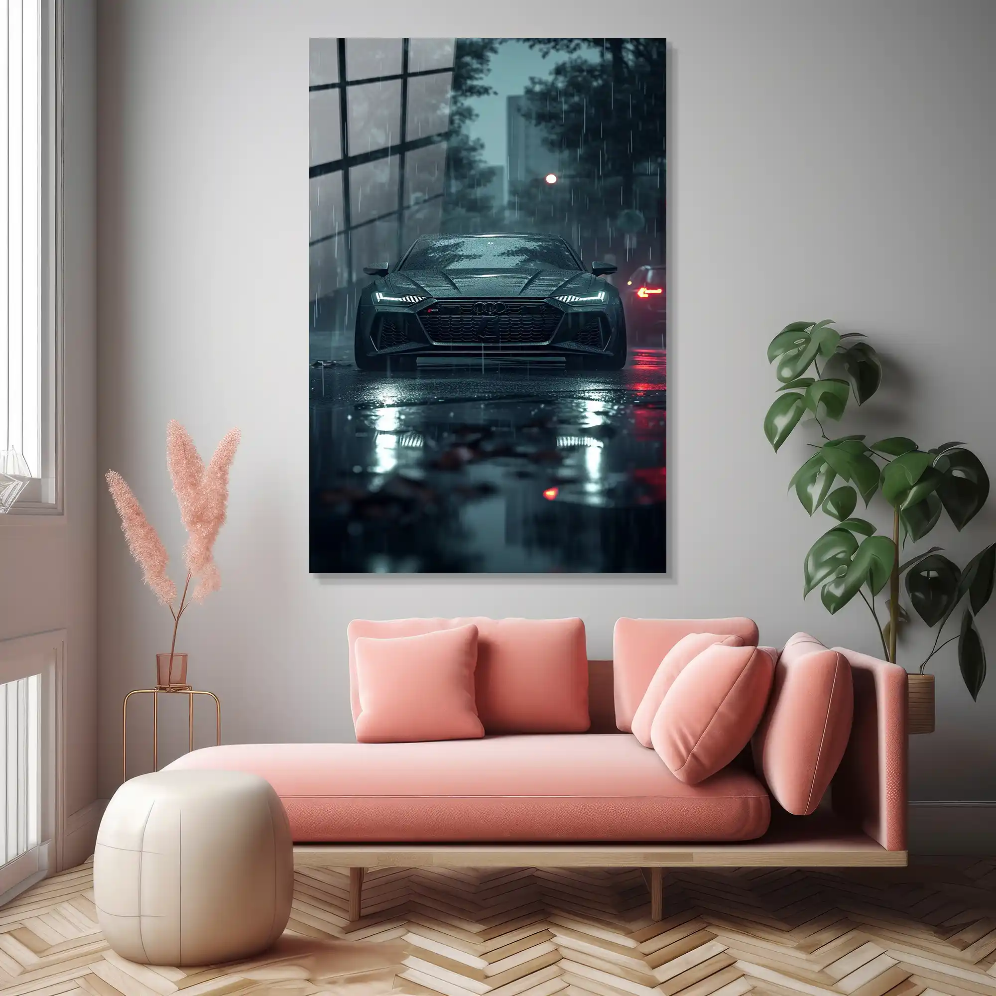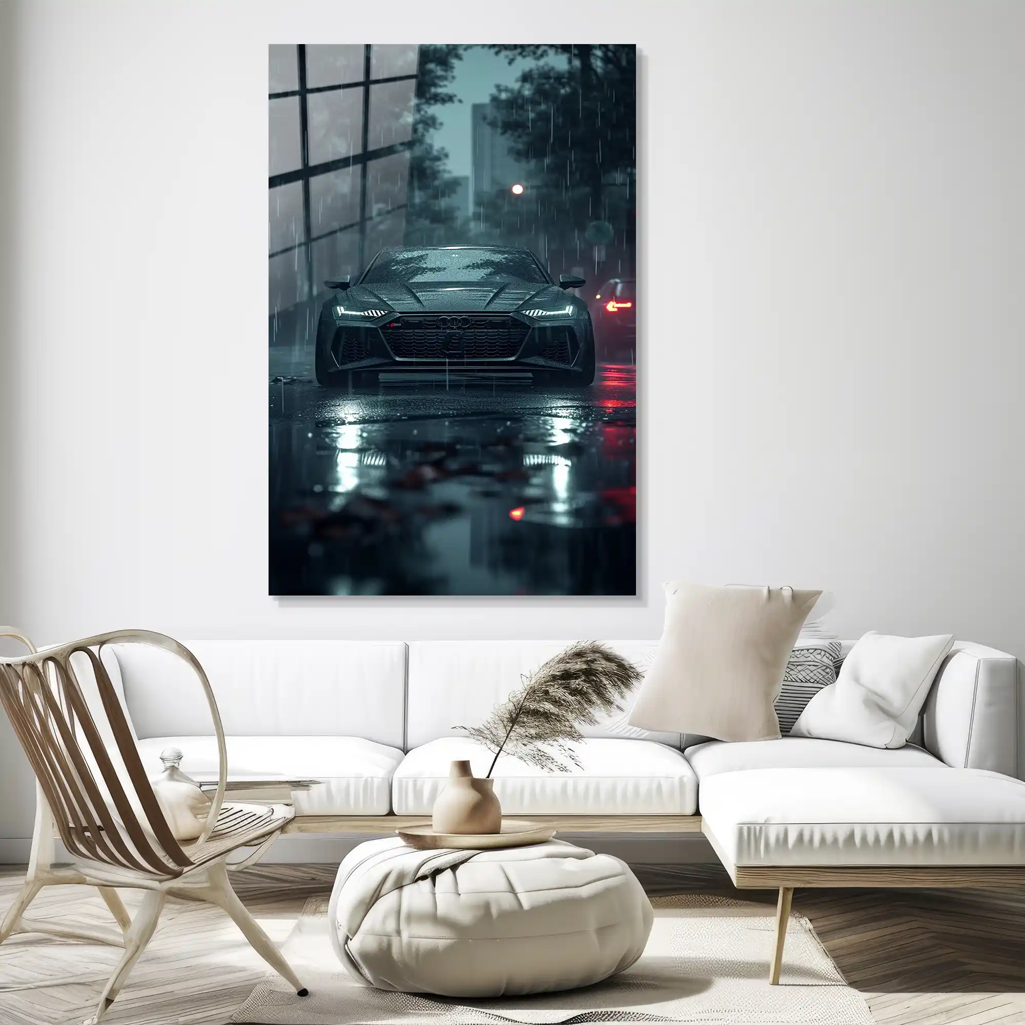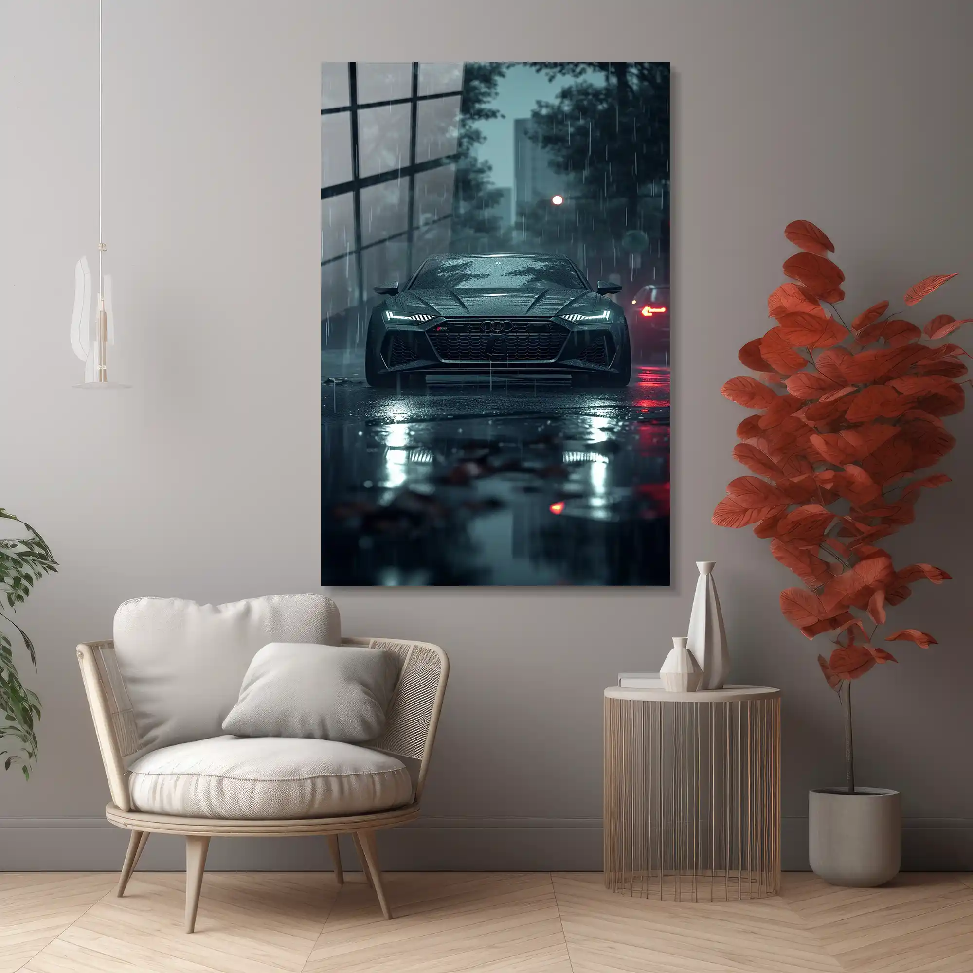 Şehrin karanlık ve ıslak sokaklarında, performansın ve lüksün gizemli buluşması… Bu özel cam tablo, Audi RS modelinin agresif ve keskin hatlarını, yağmurun yarattığı yansımalarla çarpıcı bir sinematik sahneye dönüştürüyor.