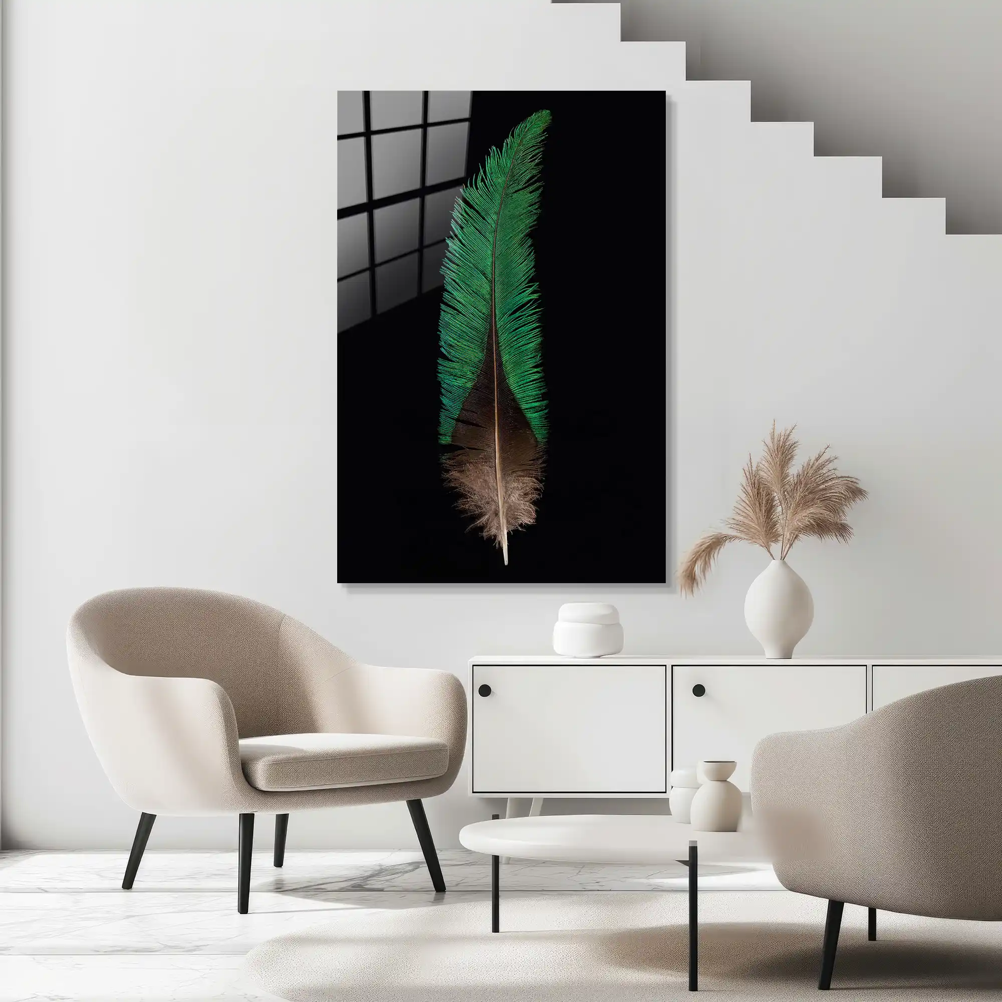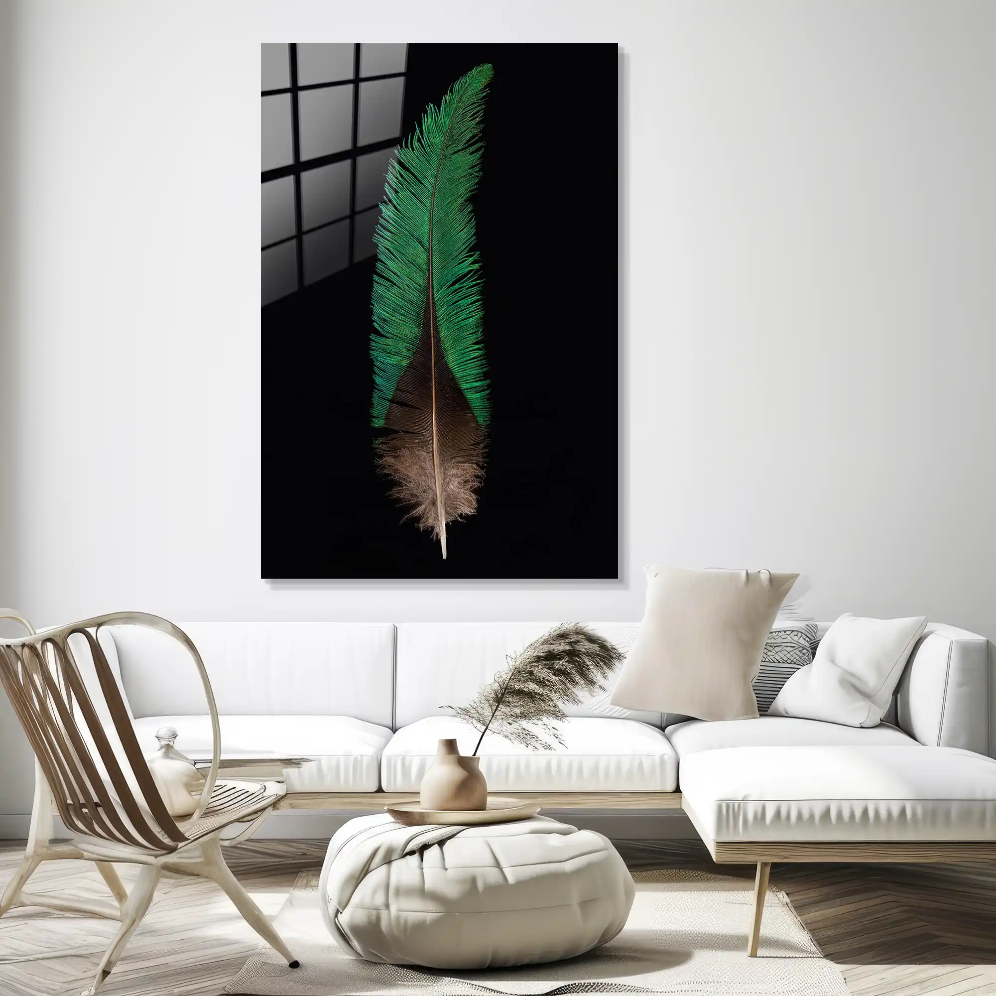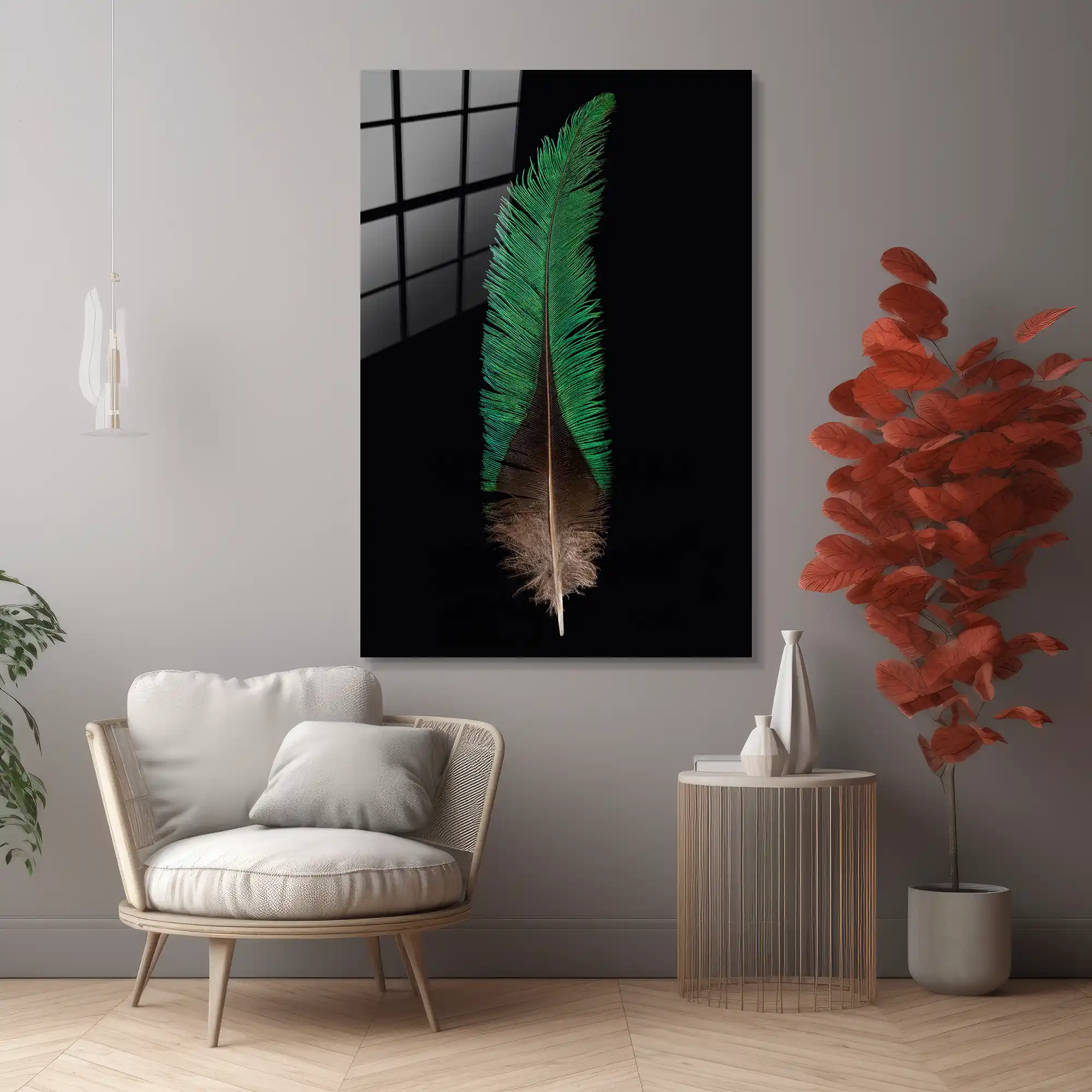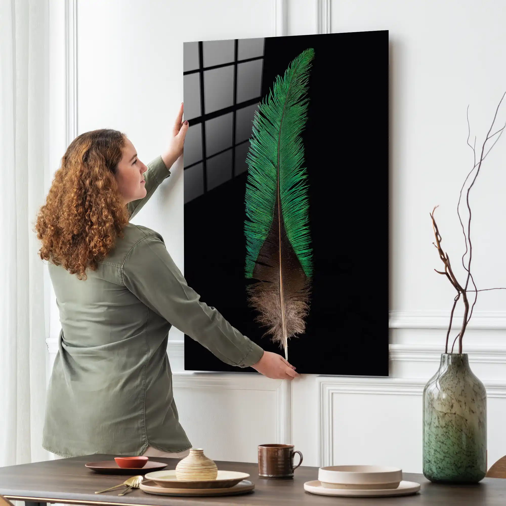 Zıtlıkların mükemmel uyumu ve doğanın ince işçiliği… Bu özel eser, siyahın sonsuz derinliğini zümrüt yeşili bir tüyün canlı dokusuyla birleştirerek mekanınıza dingin bir asalet katıyor. Tüyün her bir lifindeki detaylar ve renk geçişleri, minimalist tasarım anlayışını lüks bir dokunuşla evinize getiriyor. Karanlığın içinde parlayan bu yeşil detay, sadece bir dekorasyon öğesi değil; sadeliğin içindeki güce ve doğanın kusursuz geometrisine adanmış modern bir saygı duruşudur. Camın pürüzsüz ve parlak yüzeyi, siyah zeminin derinliğini artırırken tüyün dokusunu daha belirgin kılarak duvarınızda sofistike bir atmosfer yaratır.