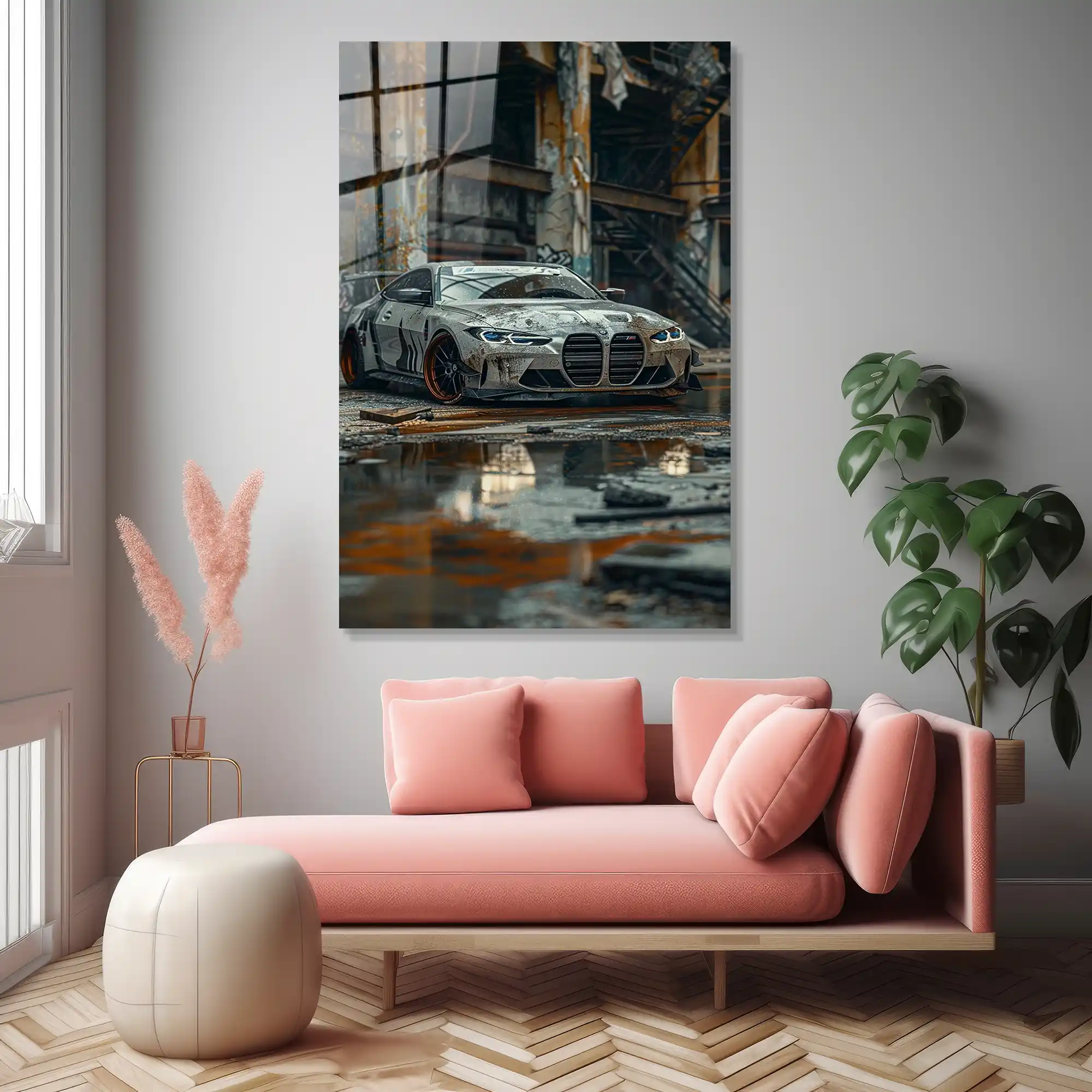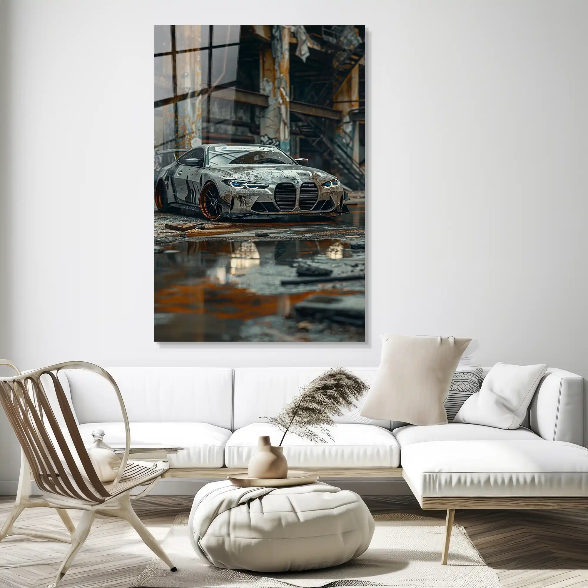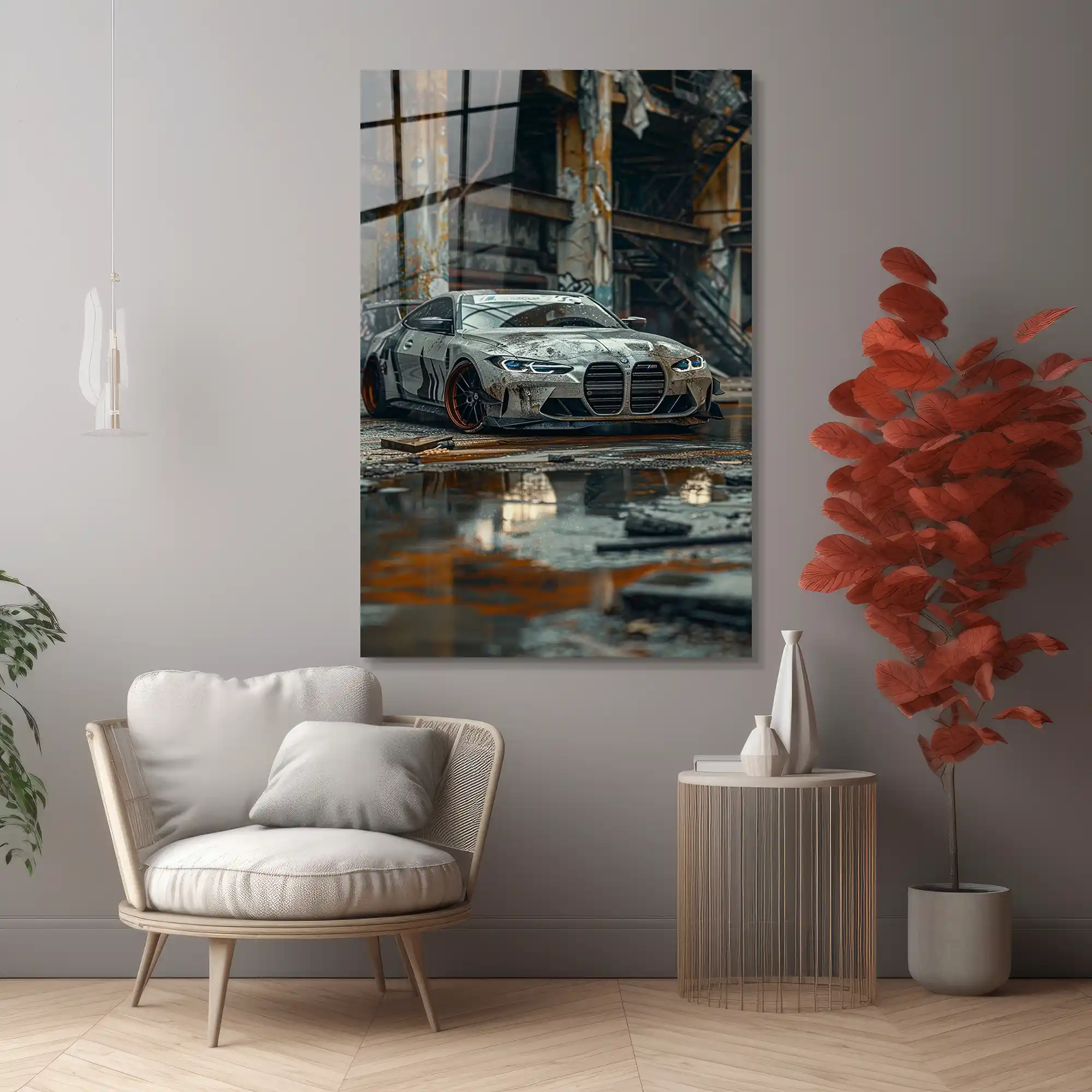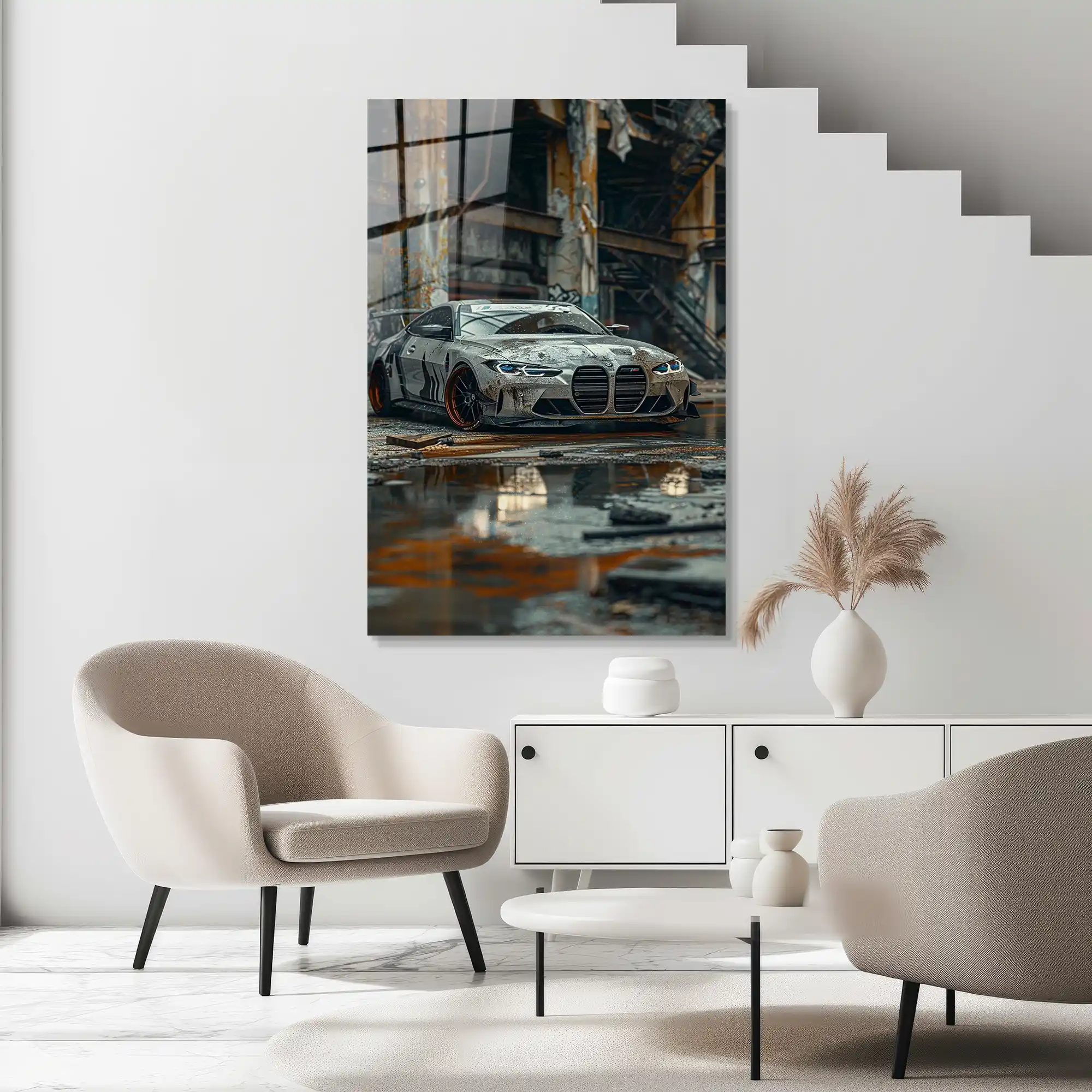 Aracın yıpranmış, tozlu yüzeyi, girdiği zorlu mücadeleleri ve asfaltın en çetin şartlarını görmüş bir savaşçı ruhunu yansıtıyor. Ön ızgaranın agresif duruşu ve farların keskin bakışı, ıslak zemindeki paslı yansımalarla birleşerek tabloya derin, endüstriyel ve dramatik bir hava katıyor. Camın parlak yüzeyinin, arka plandaki eski binaların dokusu ve zemin yansımasıyla kurduğu kontrast, duvarınızda hem ham hem de sofistike bir “distopik estetik” yaratır. Bu eser, modern gücün ve asi ruhun beton ormanlarındaki yansımasıdır.