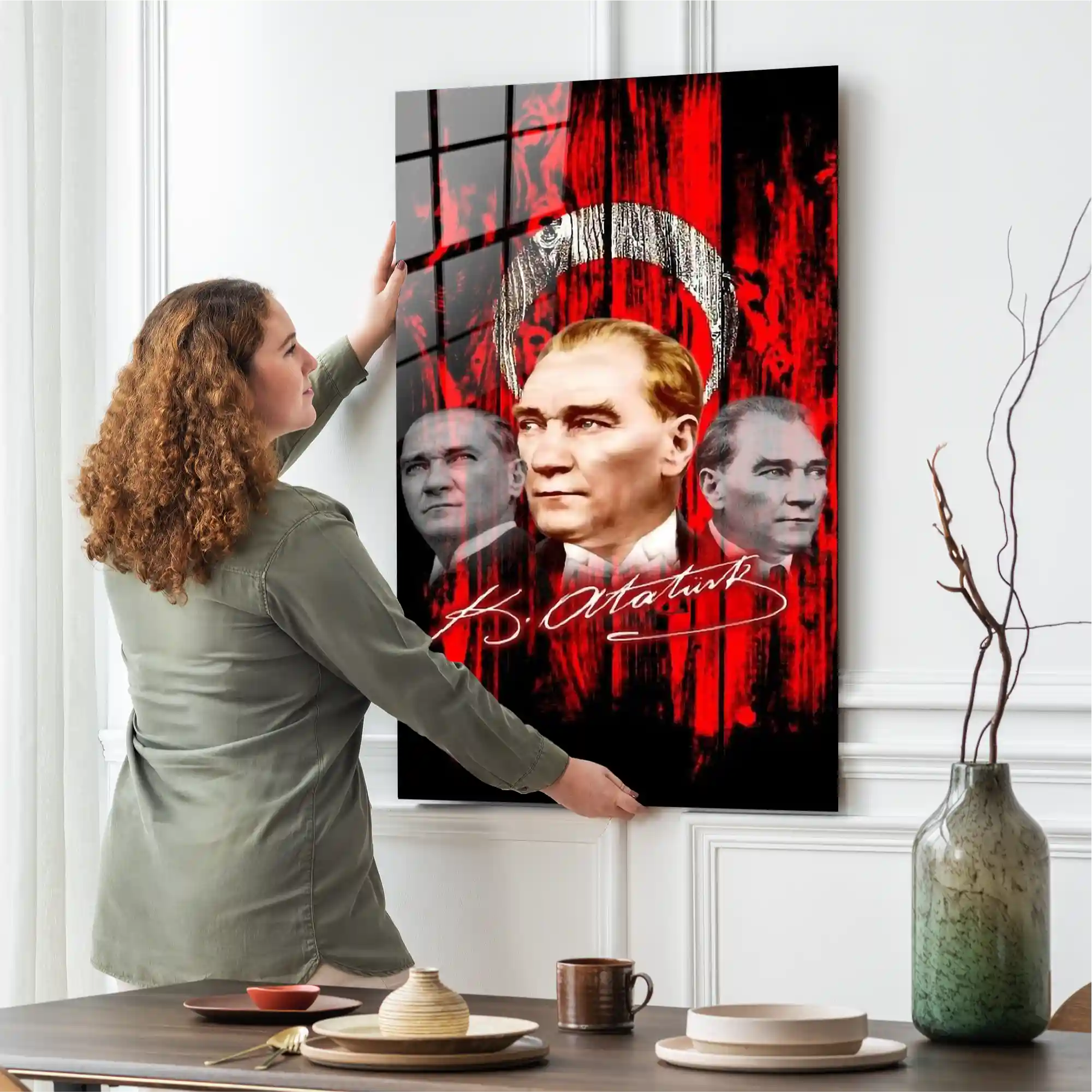 | Yüksek Çözünürlüklü Baskı | Yüksek kapasiteli UV Baskı teknolojisi ile portrelerin netliği ve arka planın dramatik kırmızı-siyah kontrastı, camın arka yüzeyine yüksek derinlik ve canlılıkta işlenir. Baskı solmaya ve çizilmeye karşı 5 yıl garantilidir. |