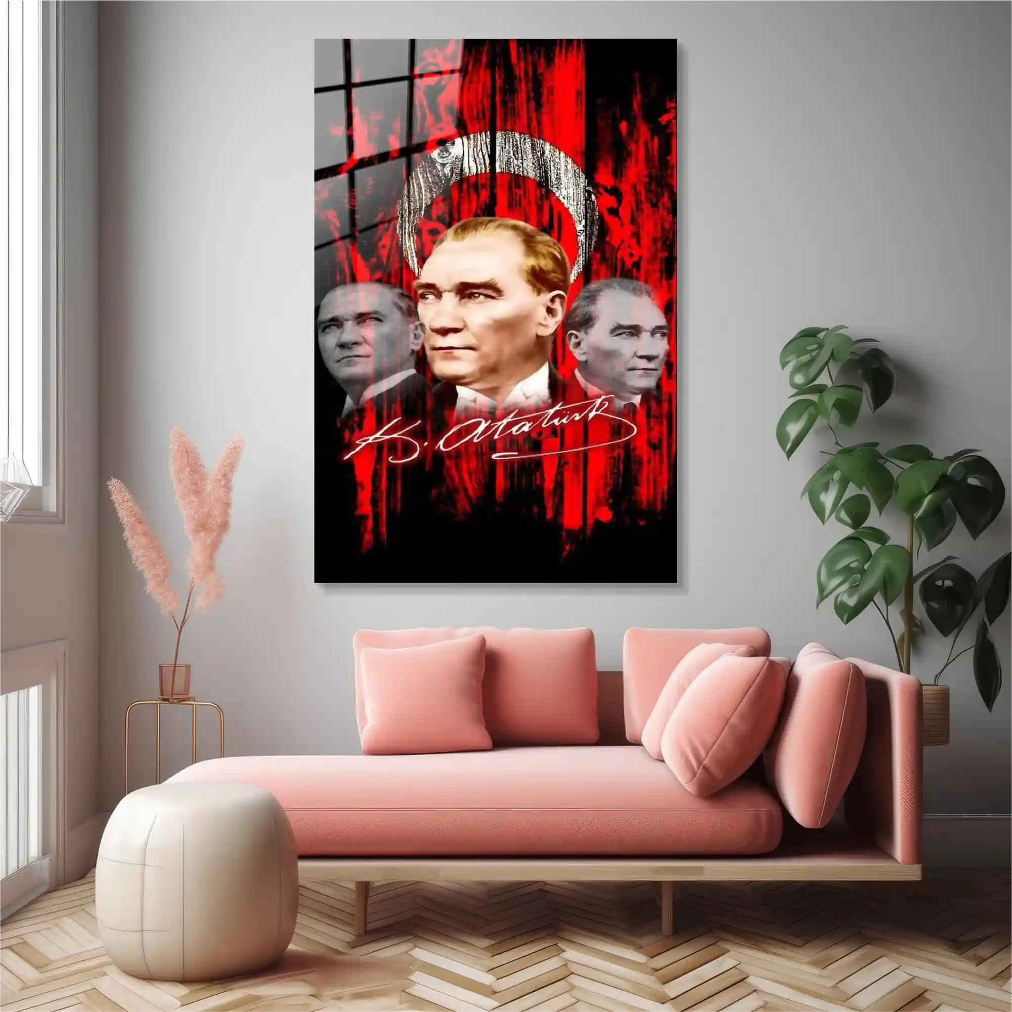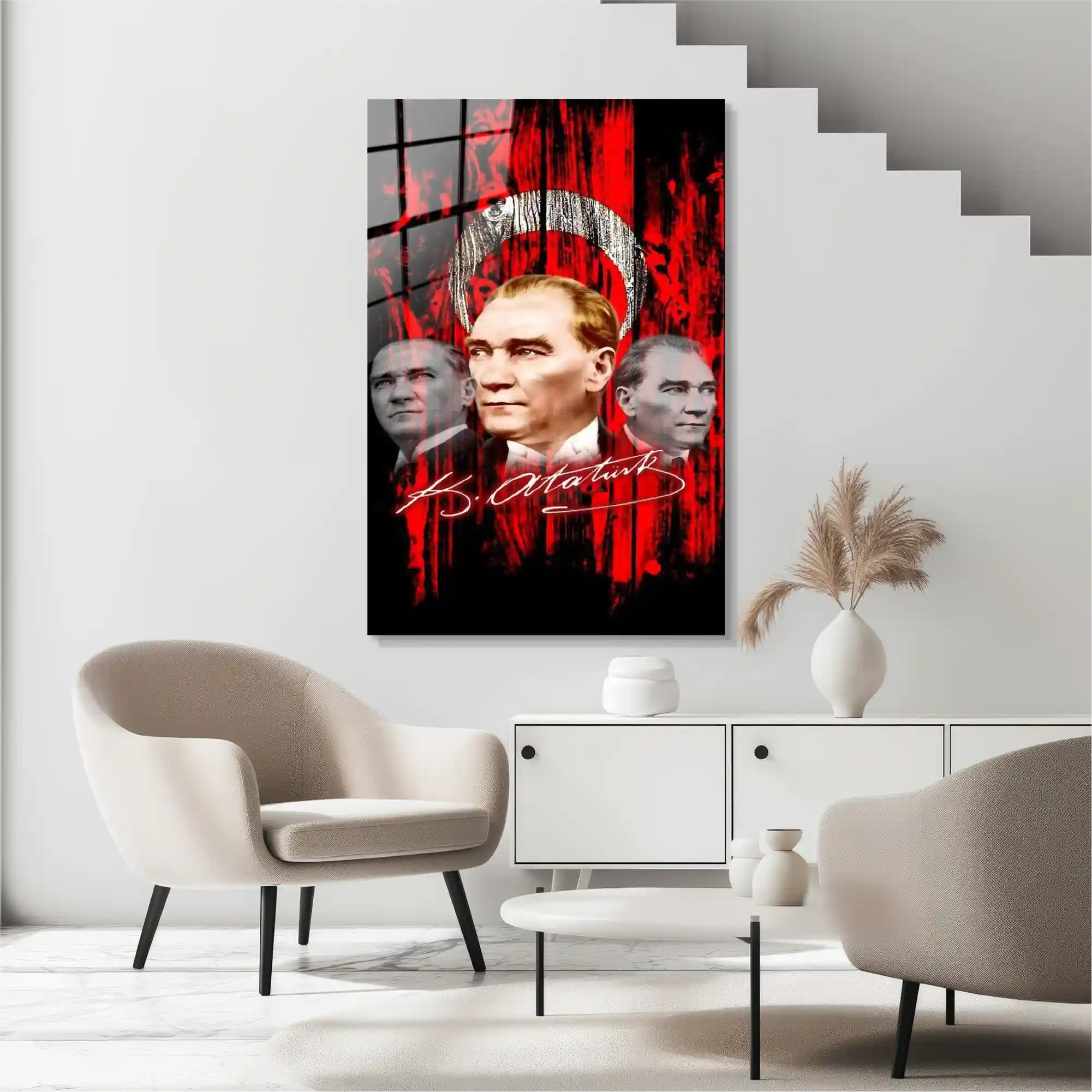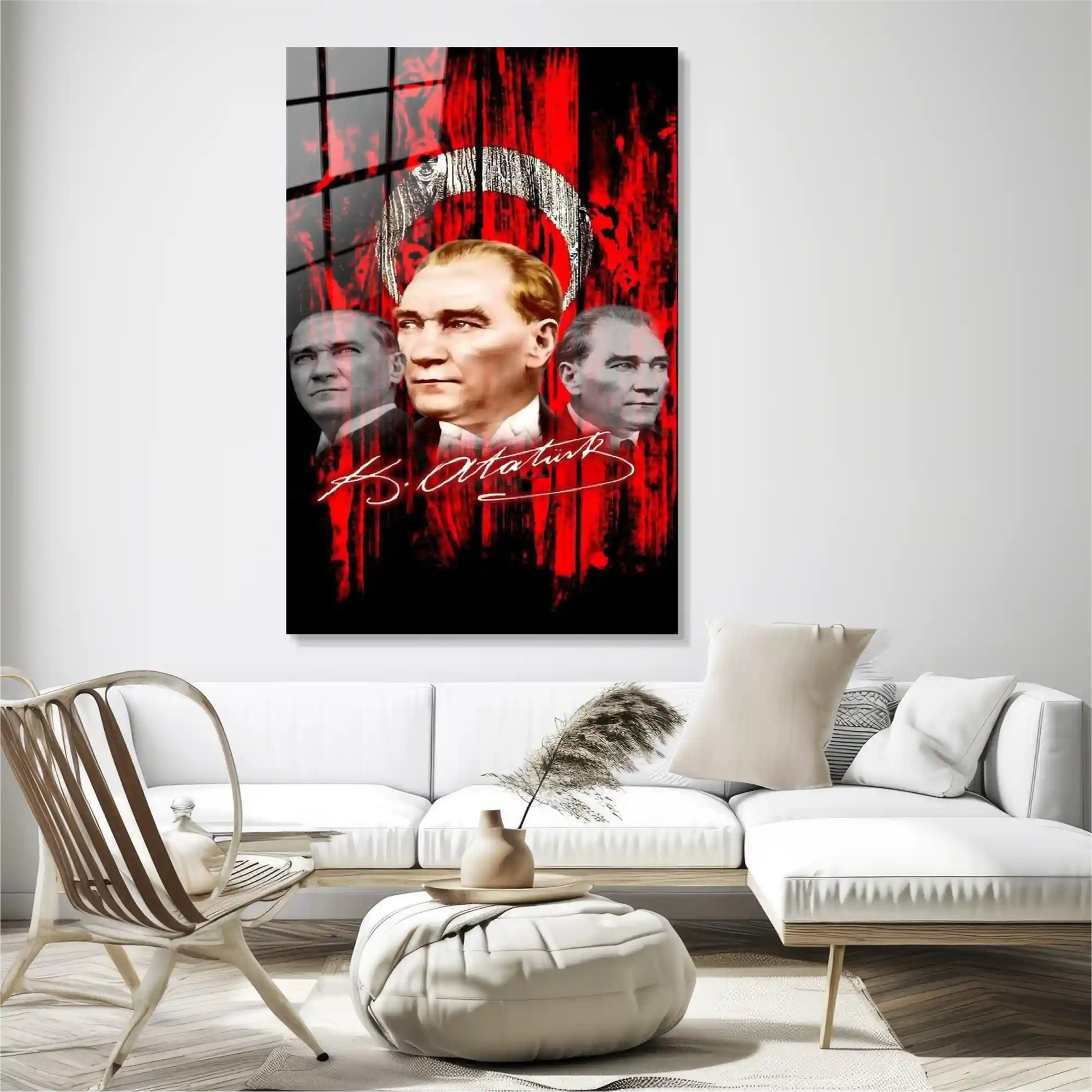 Bir liderin, bir milletin kaderini değiştiren üç yüzü: Asker, Lider ve Kurucu. Bu çarpıcı tablo, Mustafa Kemal Atatürk’ün farklı dönemlerdeki kararlılığını, Türk bayrağının kırmızısını ve dinamik fırça darbelerini birleştirerek büyük bir dramatik etki yaratır. Altındaki imzası, kurduğu Cumhuriyet’in kalıcı mührüdür. Bu eser, sadece bir portre değil, aynı zamanda bağımsızlık meşalesini yakan vizyonun, cesaretin ve ulusa